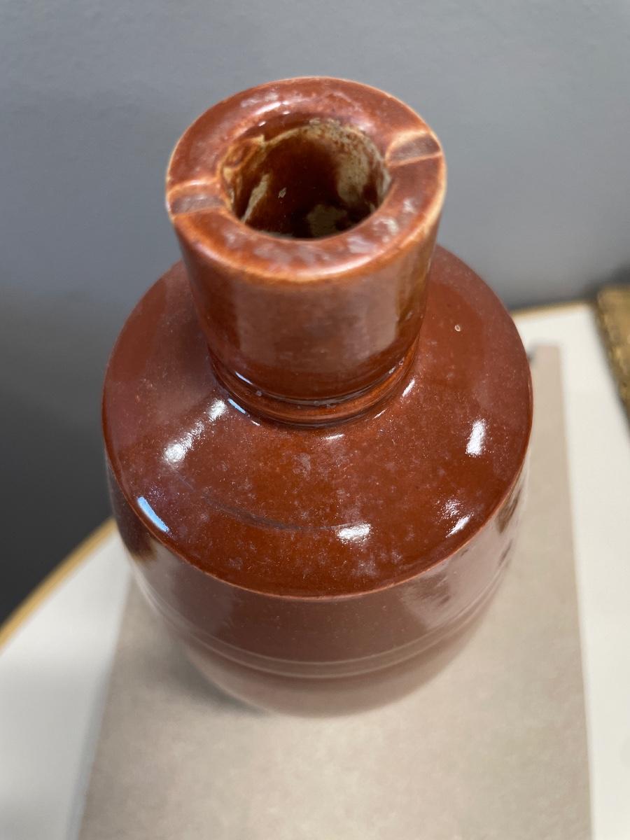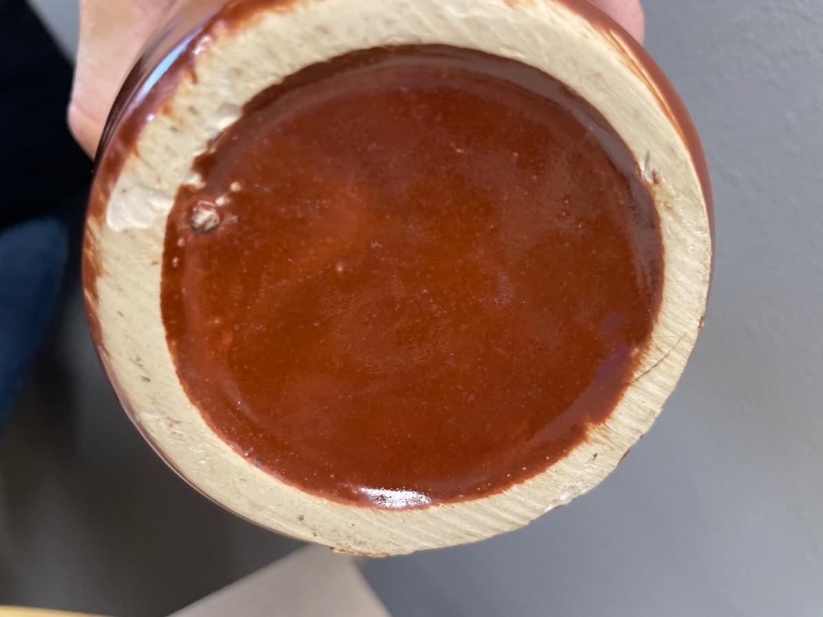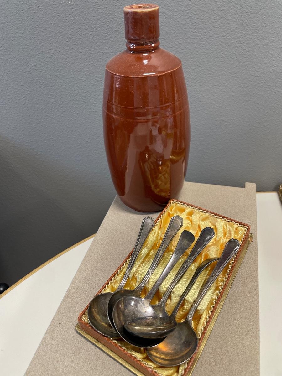 Brown stoneware vase and silver plate spoons