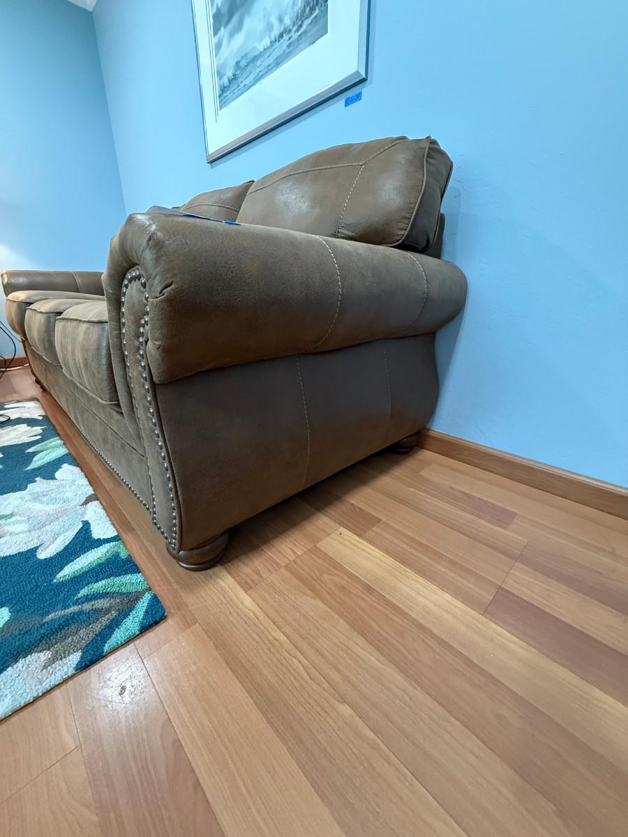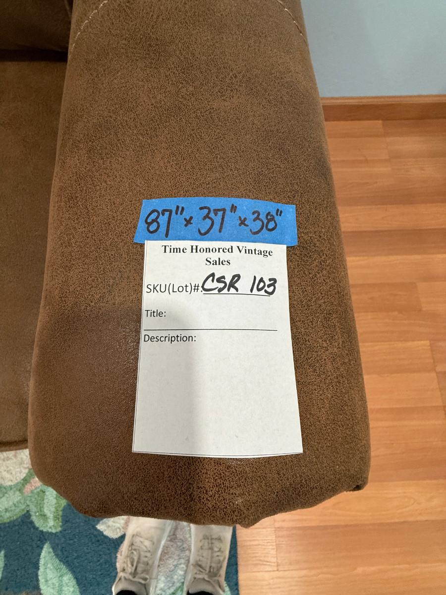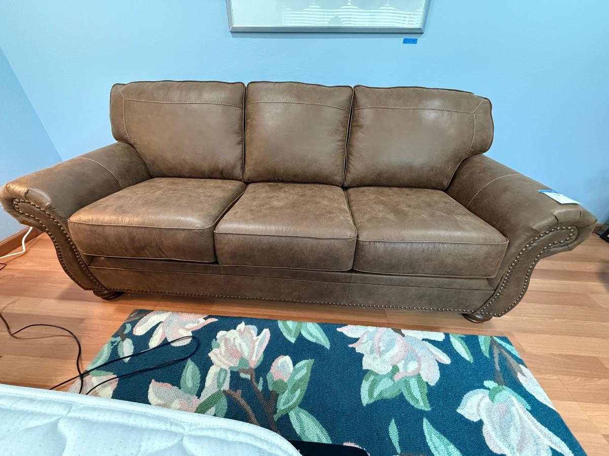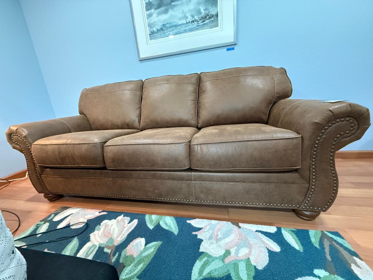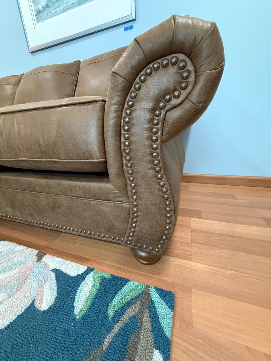 87X37X38 Footed couch with stitching and decorative rivets. in very good conditon
