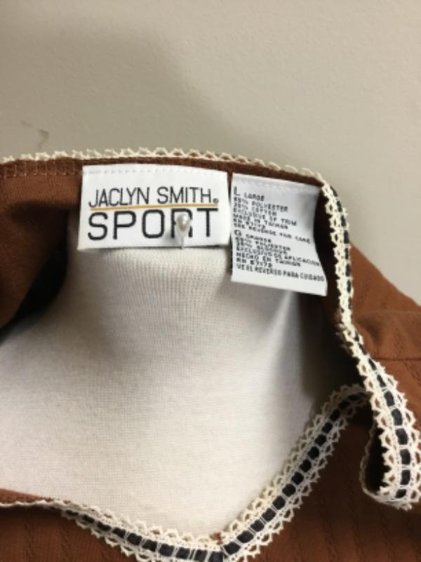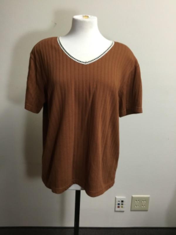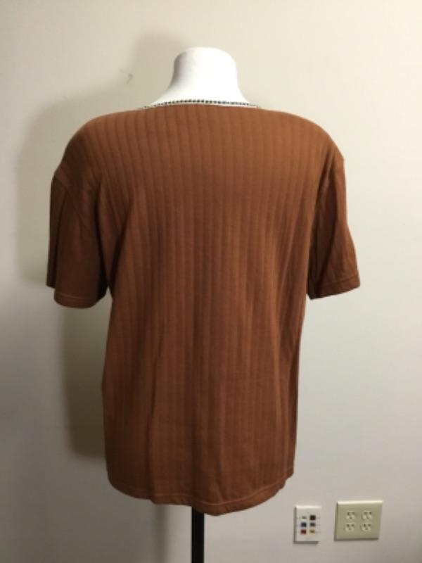 vintage rusty brown v-neck top, ribbed, lace trim, short sleeve, poly cotton blend, large L