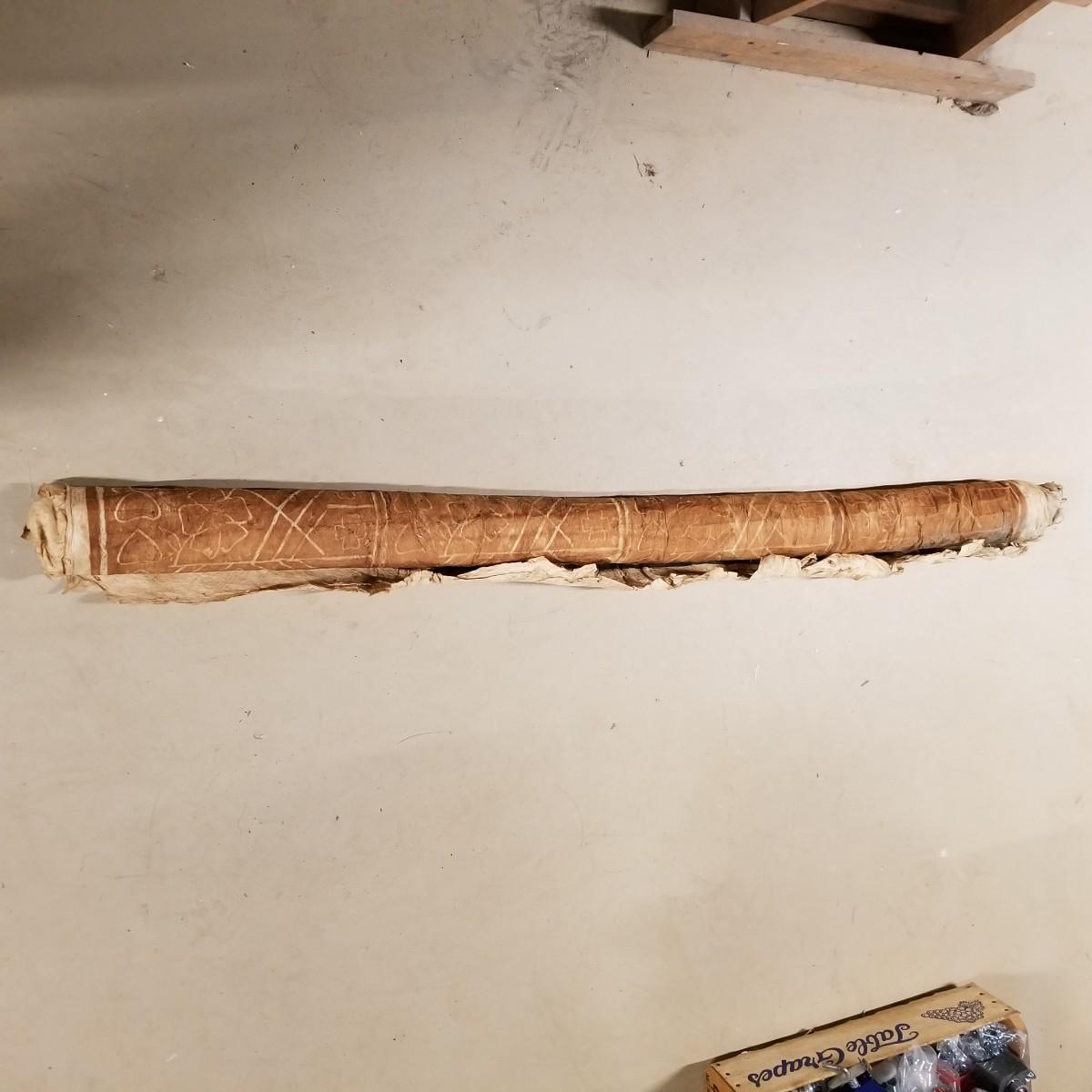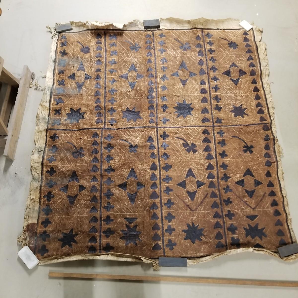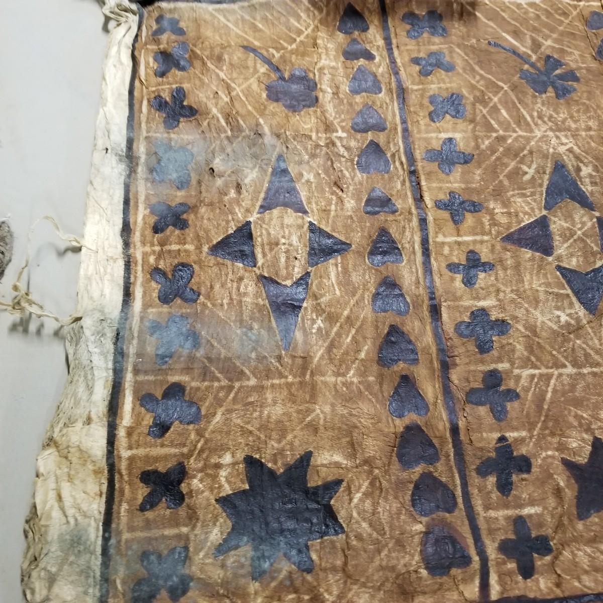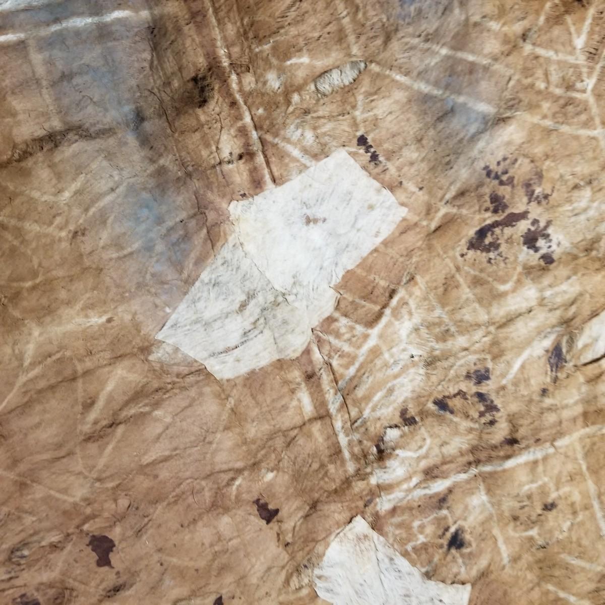 Patterned wall hanging in brown and black.  Hearts, clovers,.diamonds in the pattern. Item appears to be made out of paper. Edges are rough and some discoloring in places, see photos.  60" x54".  Shipping available. Shipping Art can be costly please call UPS store at 828-252-6930 for quote.