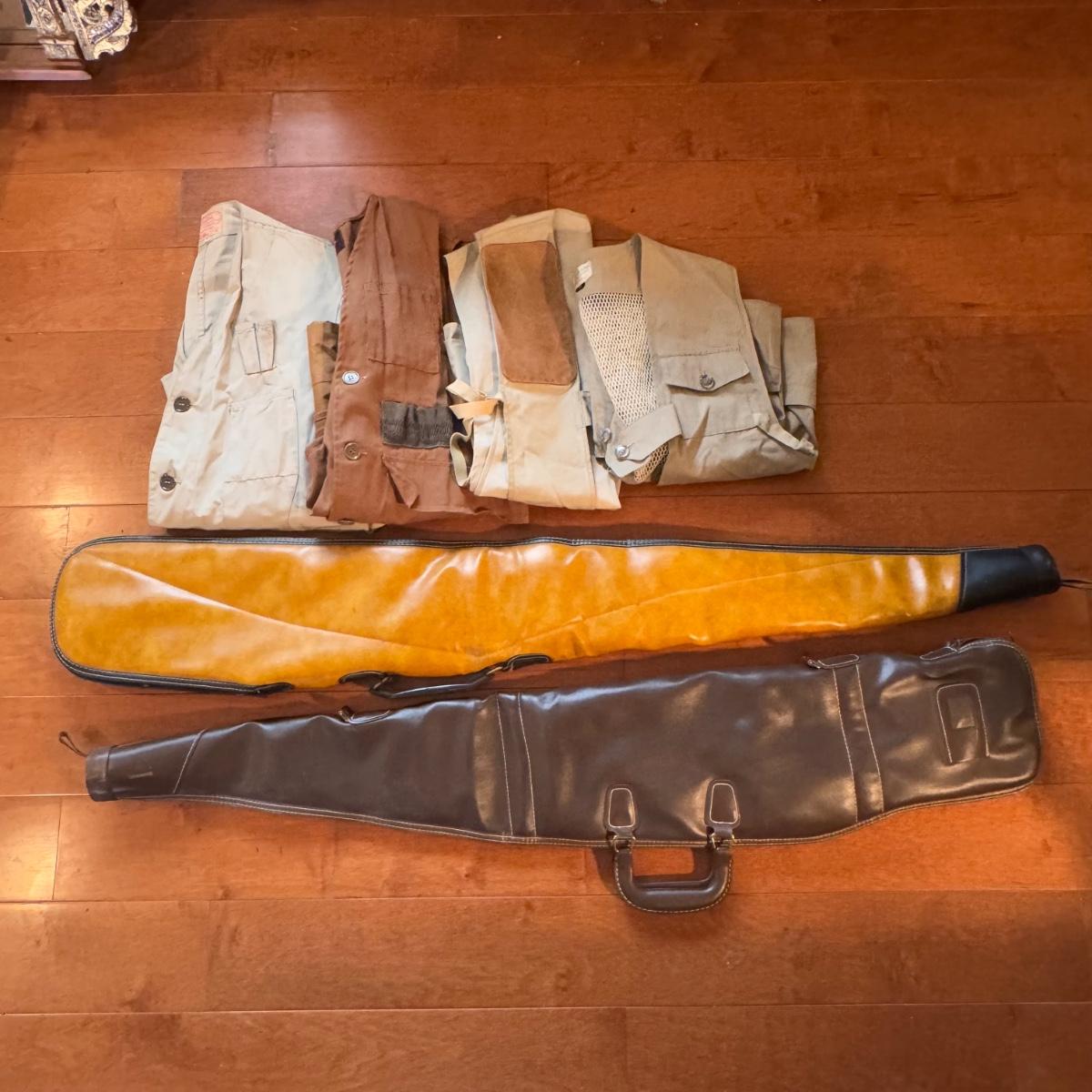 Lot includes two shotgun cases, one by Browning and the other by Koplin, three hunting vests, and one lightweight hunting jacket. The three vests are from the brands Abercrombie & Fitch, Gun Club Sportswear, and Nesco - all size large. The jacket is also from Gun Club Sportswear and is a size large. The cases individually measure 46.5” x 8.5” x 1”H. Shipping available.