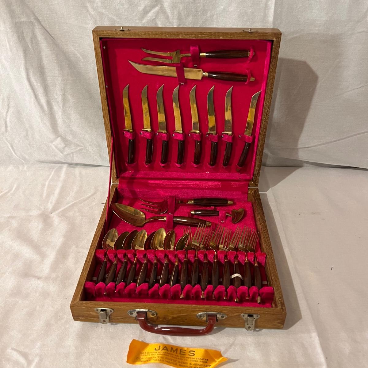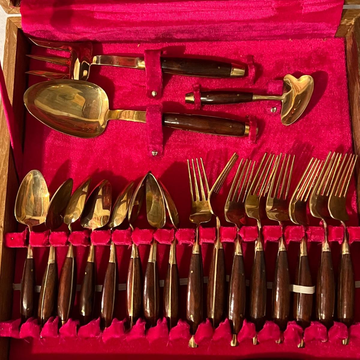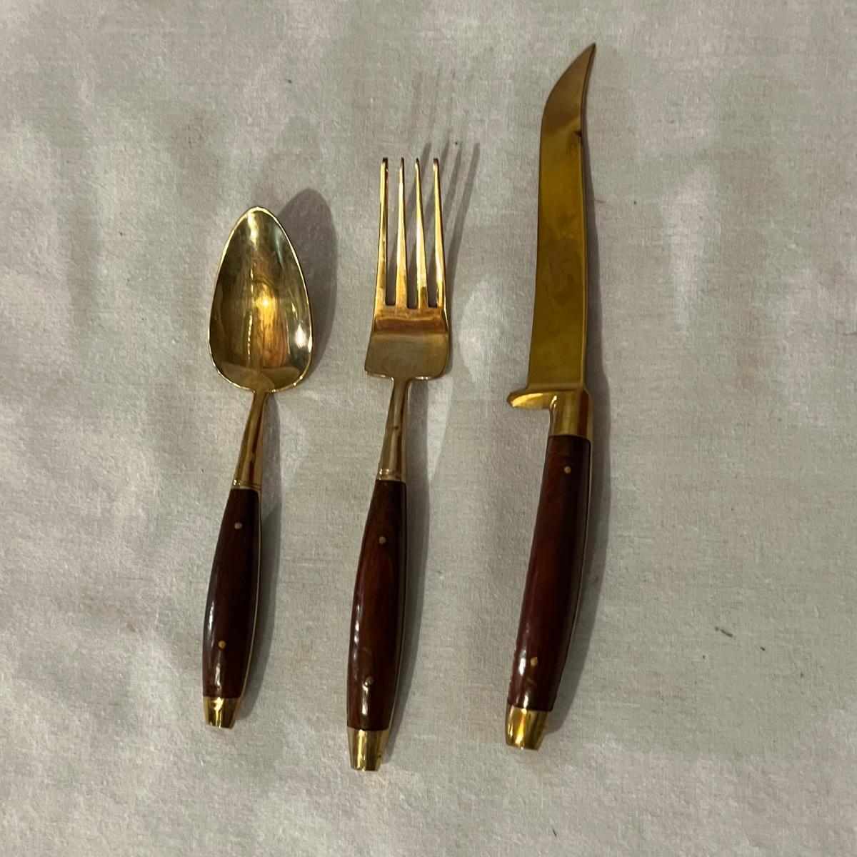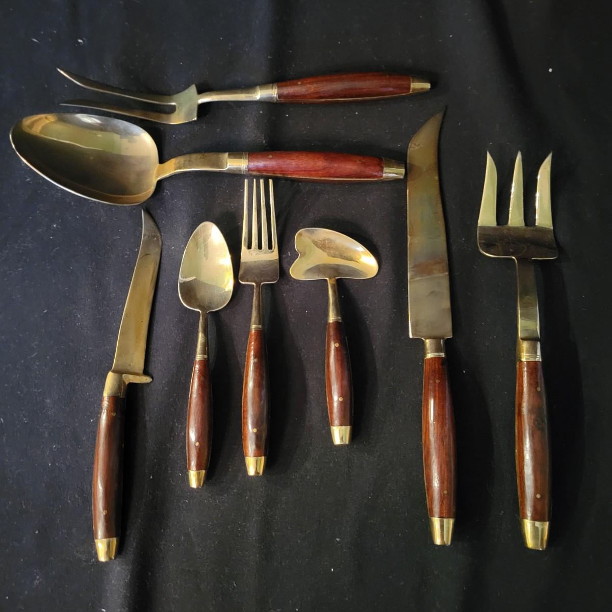 Bronze metal riveted into a wood handle. Setting includes eight knives 7.25” long, eight spoons 5.5” long. Eight forks 6.25” long as well as a serving fork and spoon, a small gravy ladle 5.5” long, a carving knife 9.5” long, and a carving fork 8” long. Shipping available.