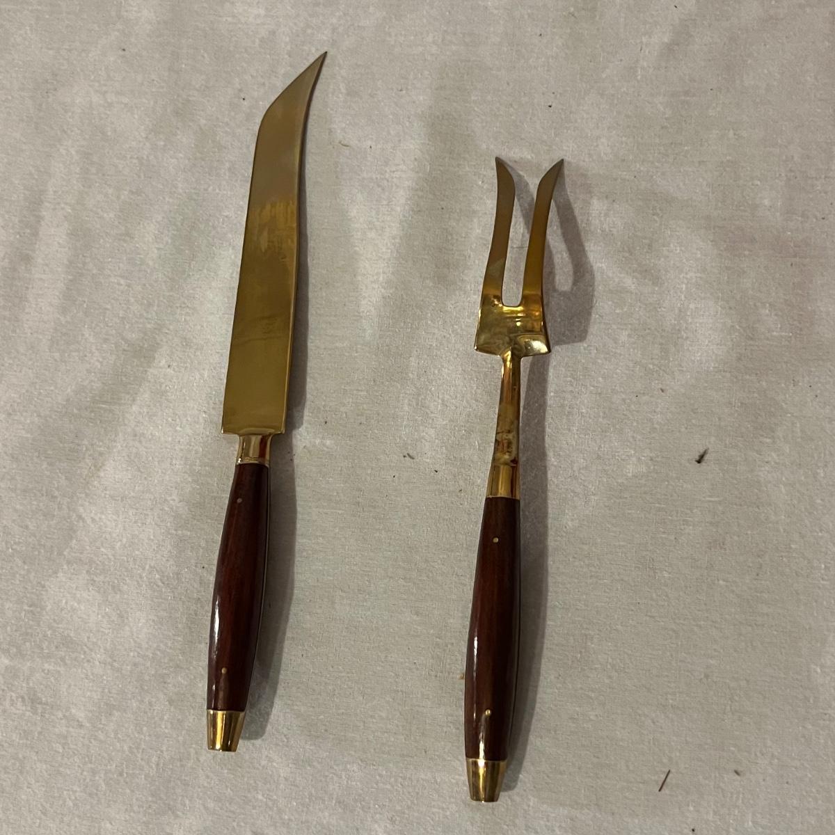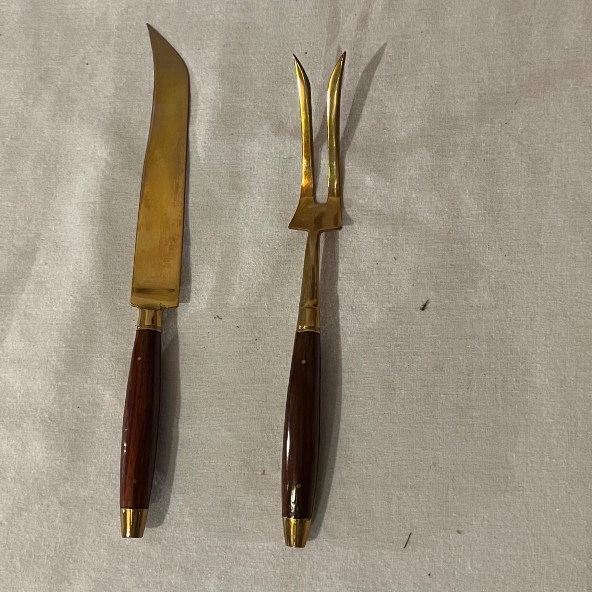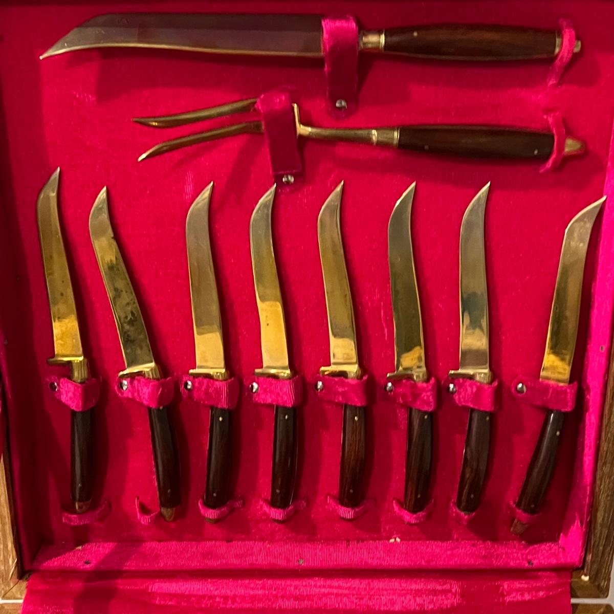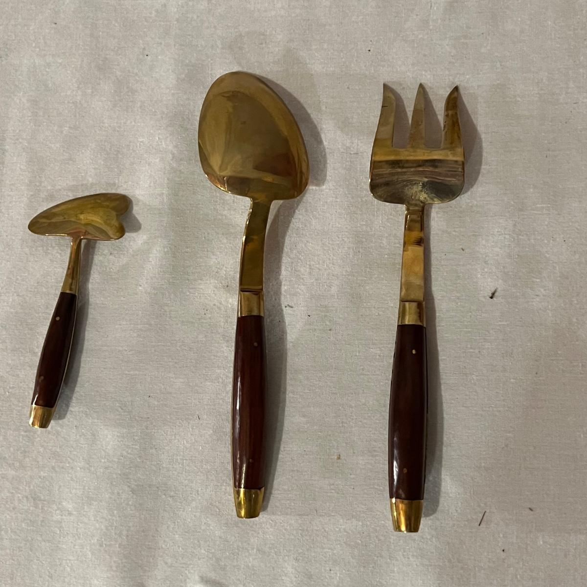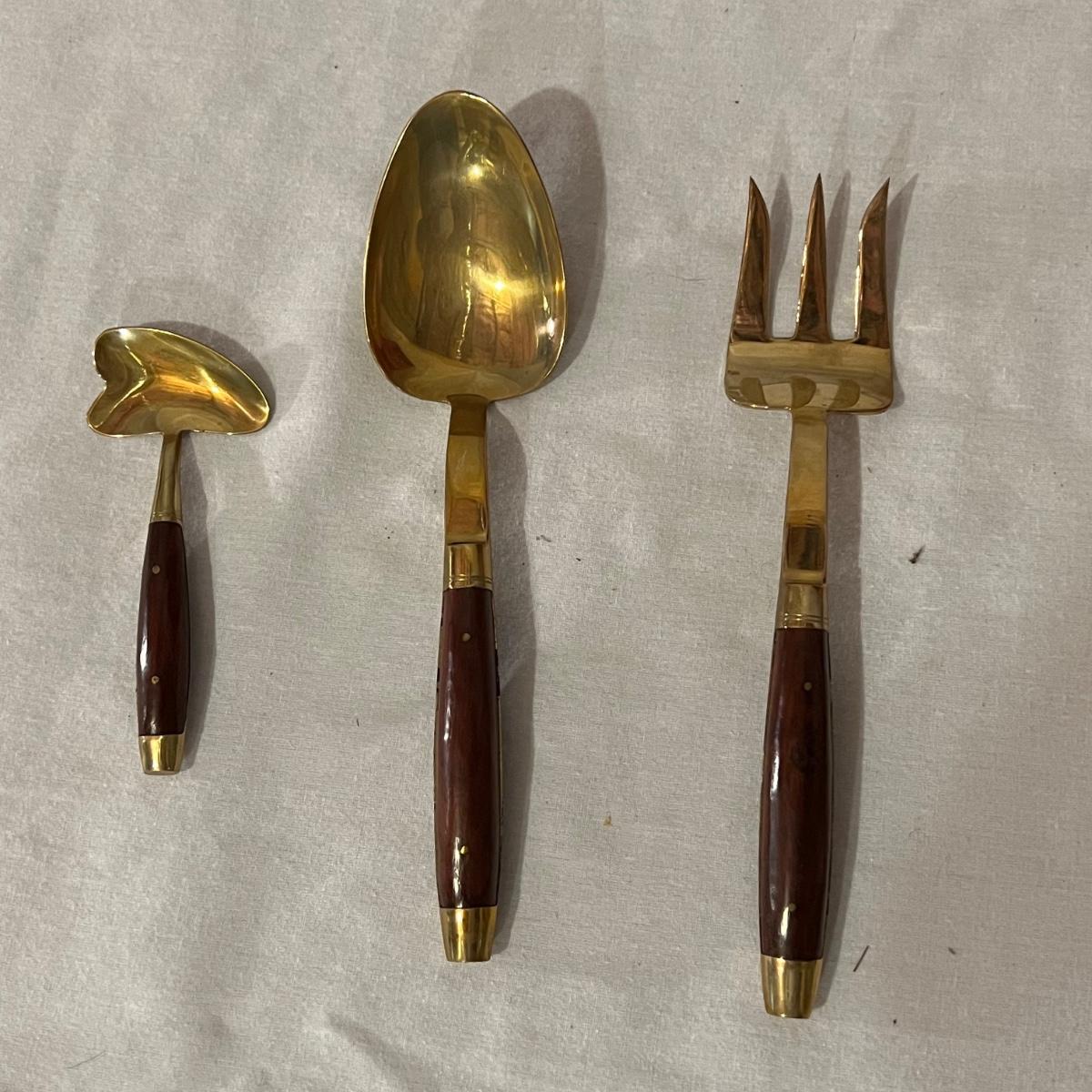 Bronze metal riveted into a wood handle. Setting includes eight knives 7.25” long, eight spoons 5.5” long. Eight forks 6.25” long as well as a serving fork and spoon, a small gravy ladle 5.5” long, a carving knife 9.5” long, and a carving fork 8” long. Shipping available.