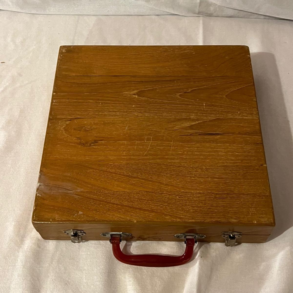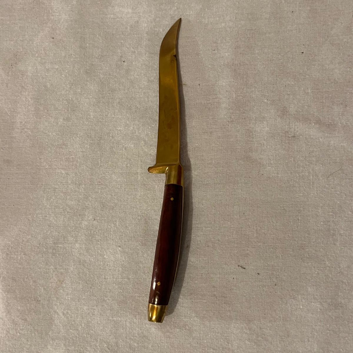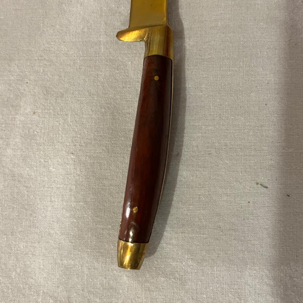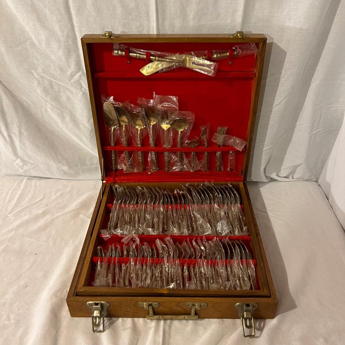 Bronze metal riveted into a wood handle. Setting includes eight knives 7.25” long, eight spoons 5.5” long. Eight forks 6.25” long as well as a serving fork and spoon, a small gravy ladle 5.5” long, a carving knife 9.5” long, and a carving fork 8” long. Shipping available.