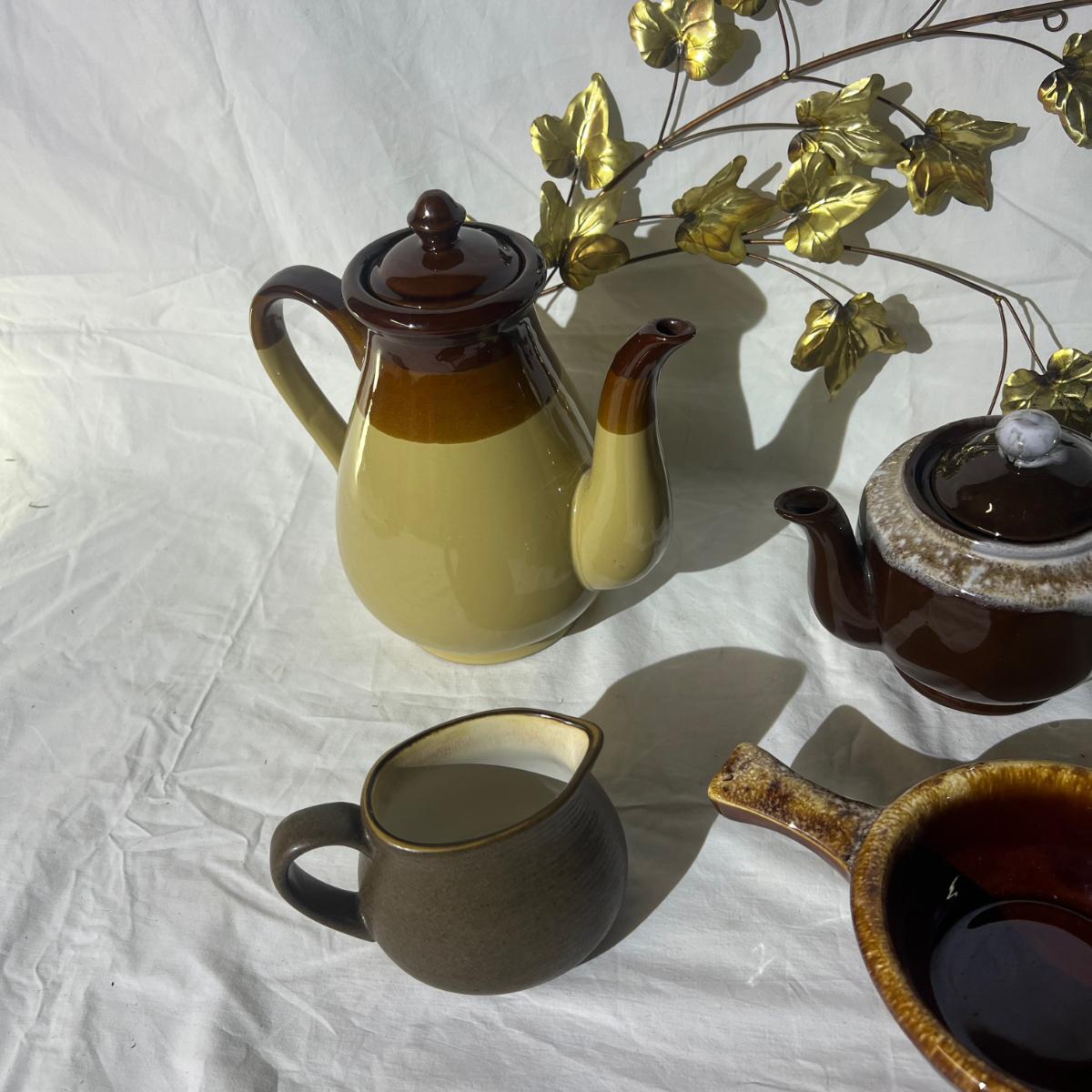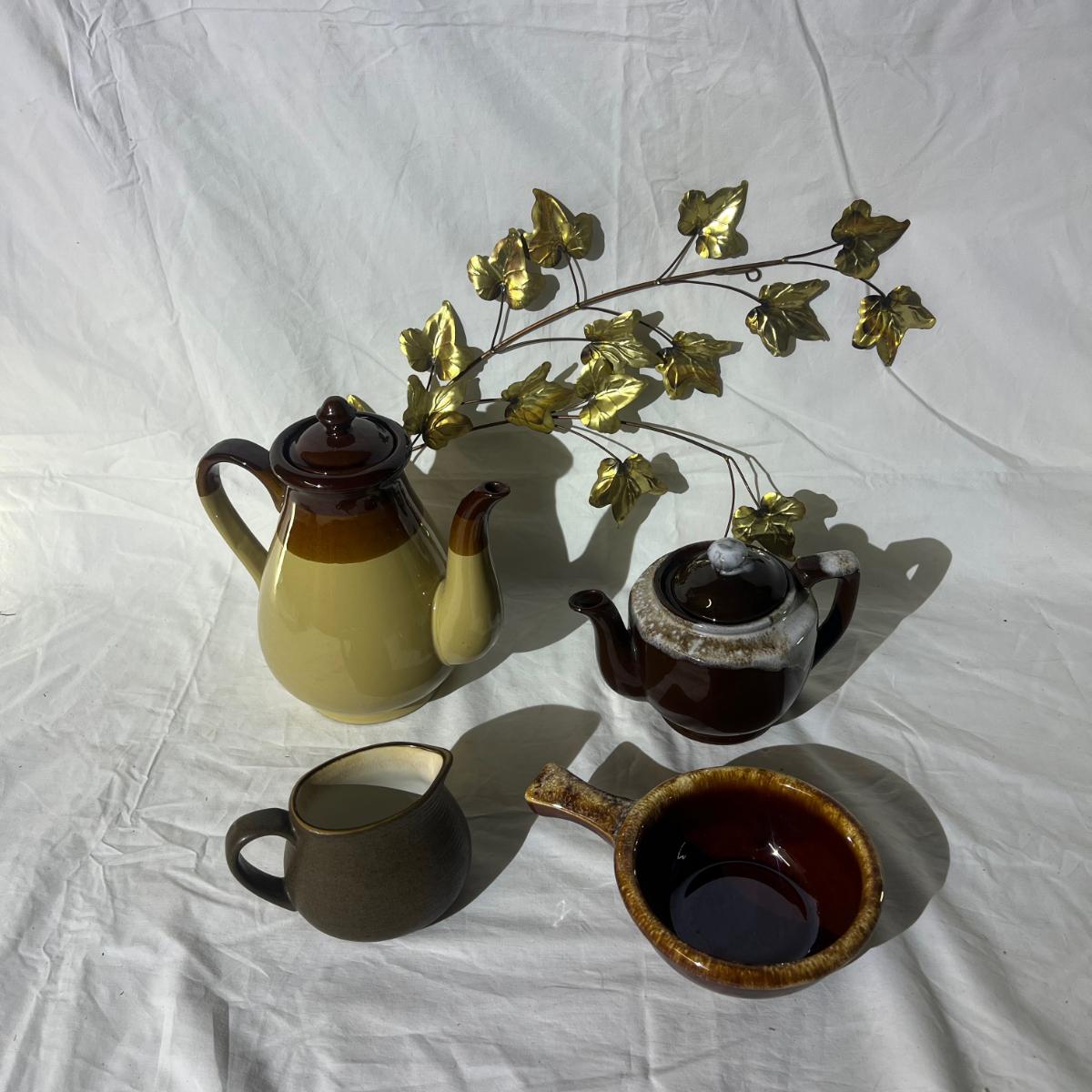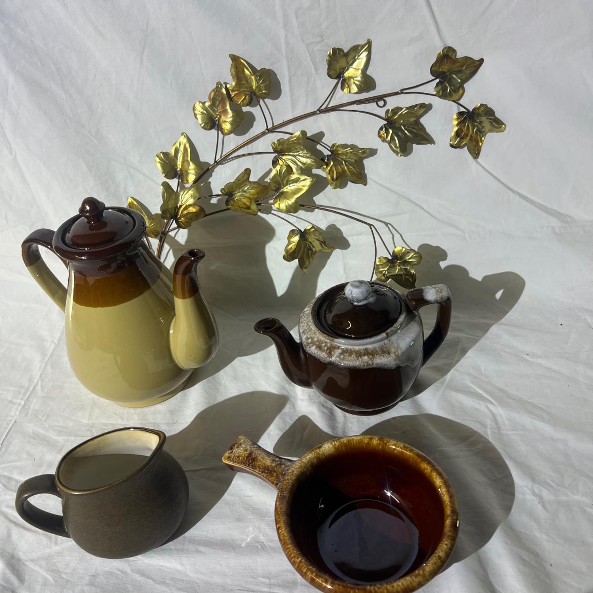 Browns Miscellaneous Household Goods; Medium and large tea kettles, soup/chile bowl, Brown cream pourer, and gold color leaf wall decor.