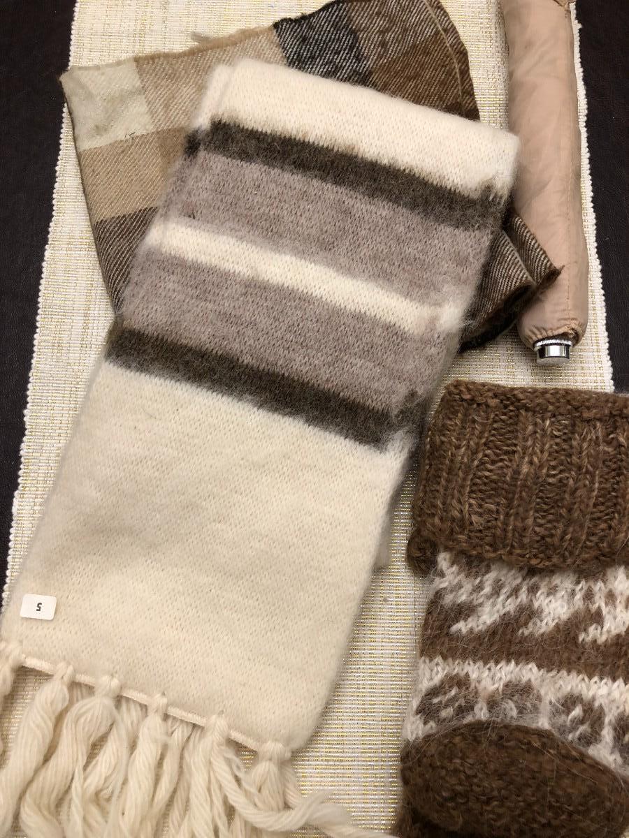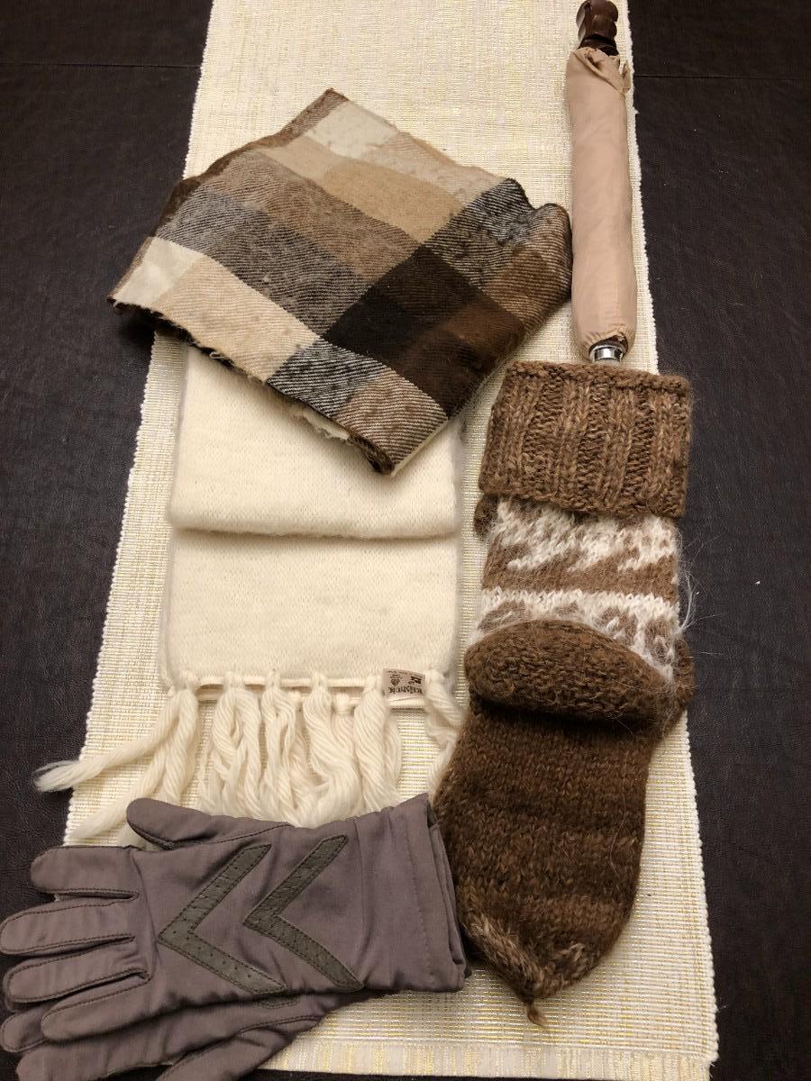 BROWNS: SCARVES, GLOVES, WOOL SOCKS, UMBRELLA
