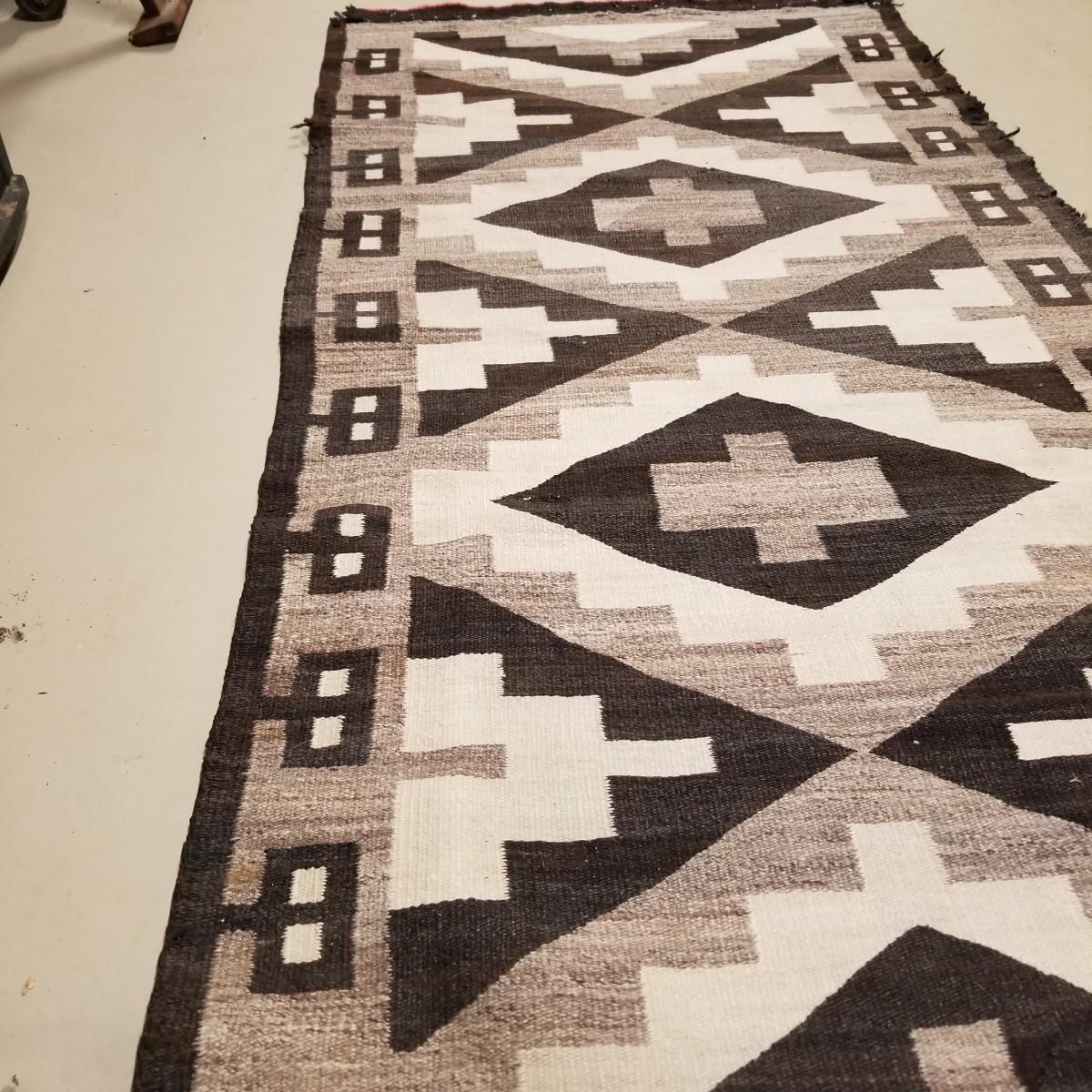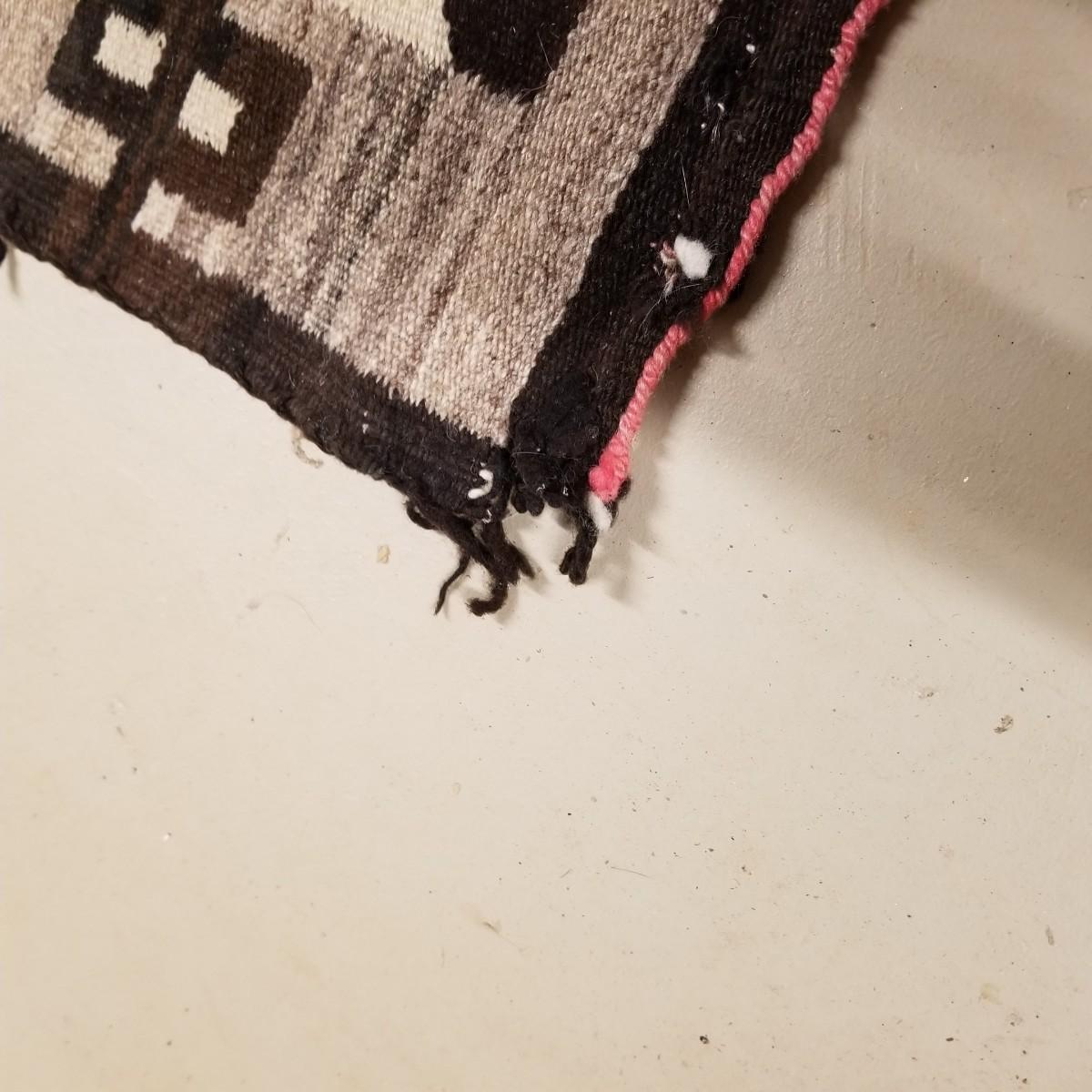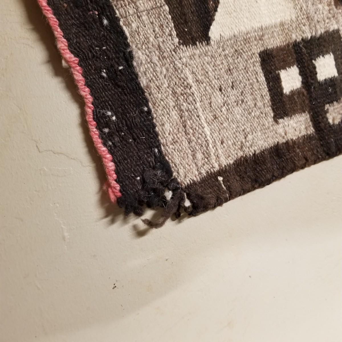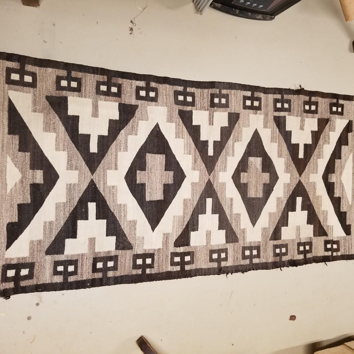 Earth tone patterned rug with diamonds and blocks in center and sides. Some fraying on edges, three corners compromised. See photos. This textile measures 68" x 33", This runner has Navajo qualities and appears to be hand woven. Local pickup only.