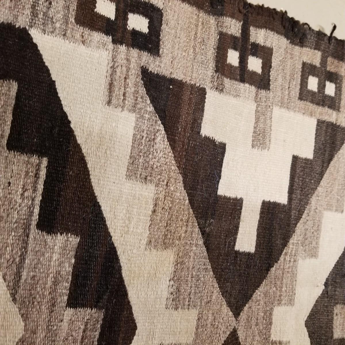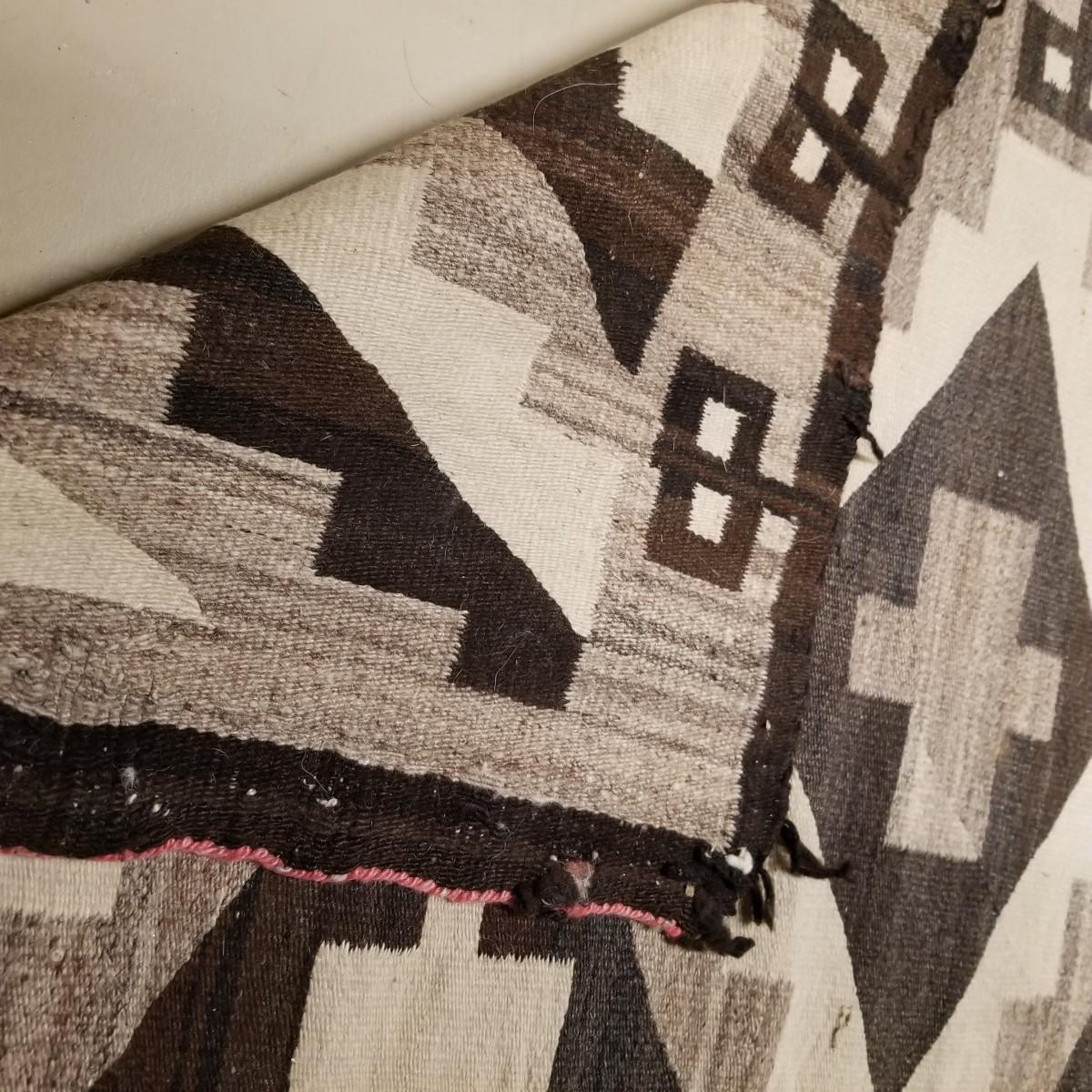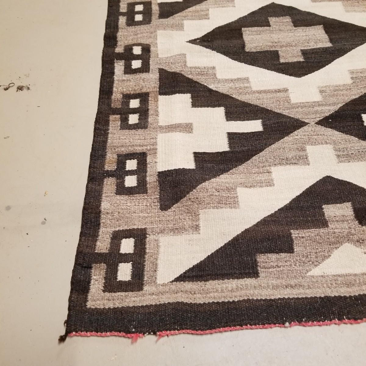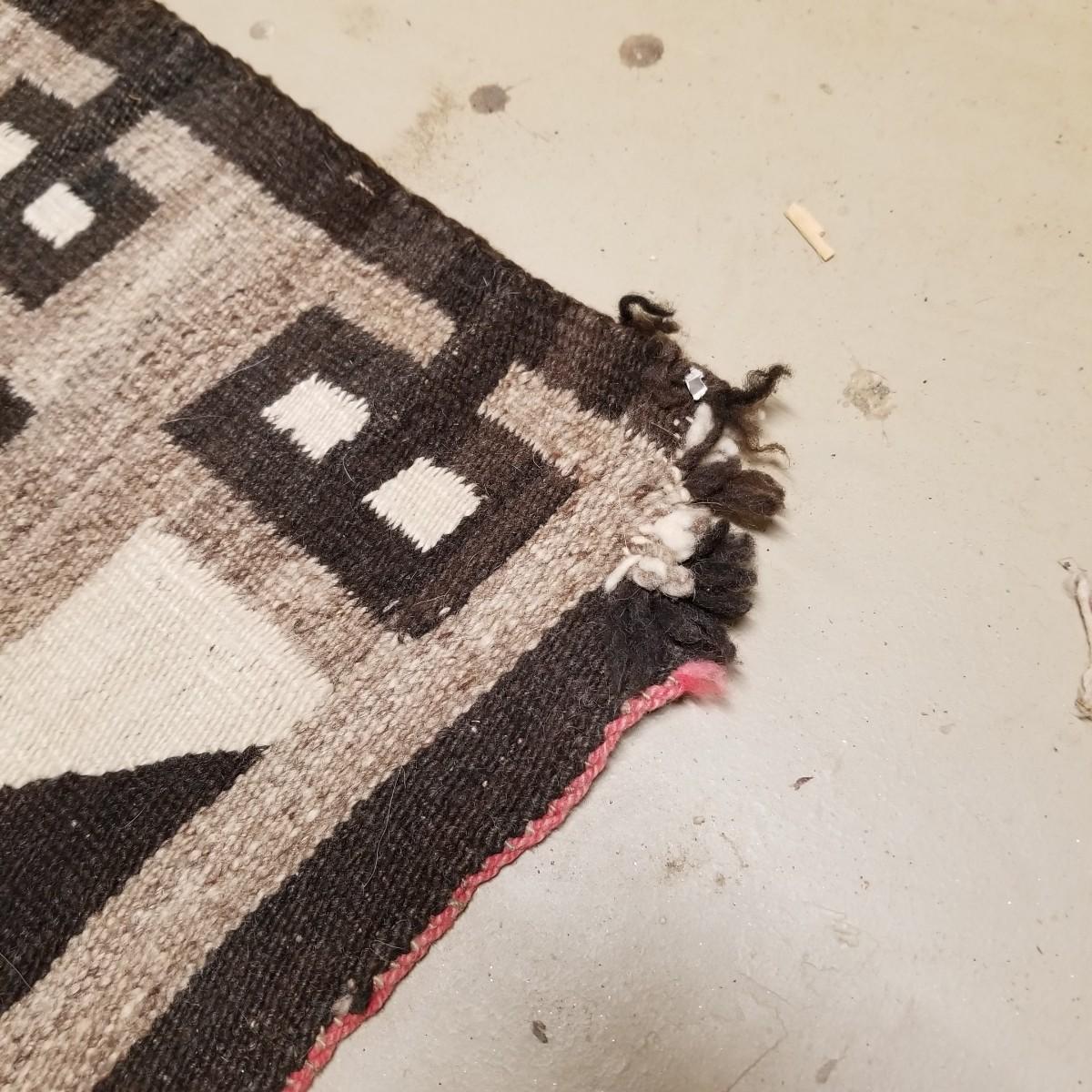 Earth tone patterned rug with diamonds and blocks in center and sides. Some fraying on edges, three corners compromised. See photos. This textile measures 68" x 33", This runner has Navajo qualities and appears to be hand woven. Local pickup only.