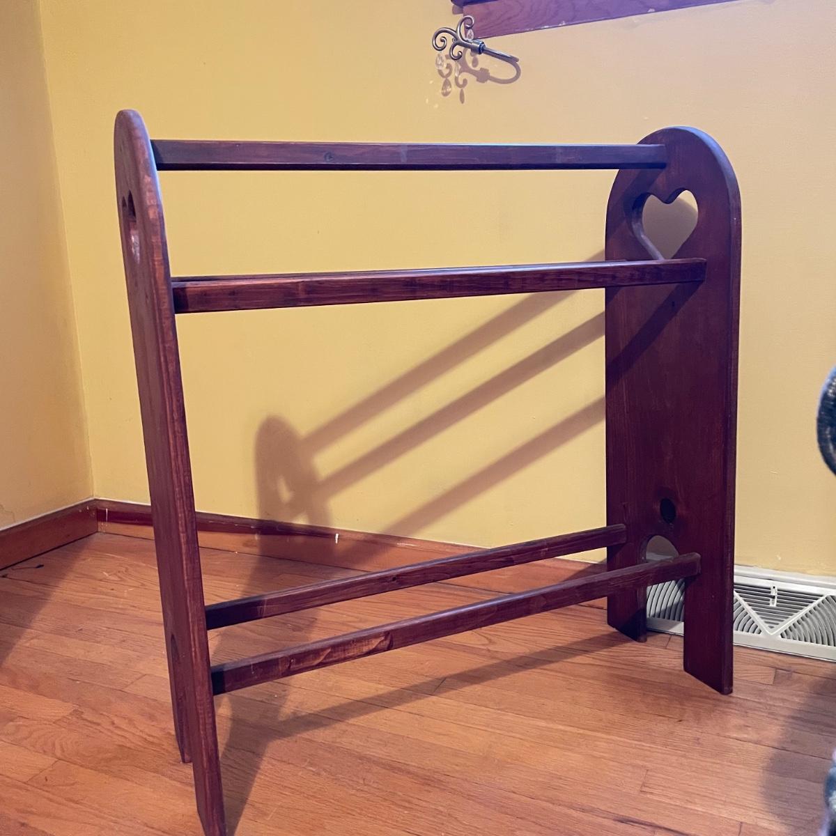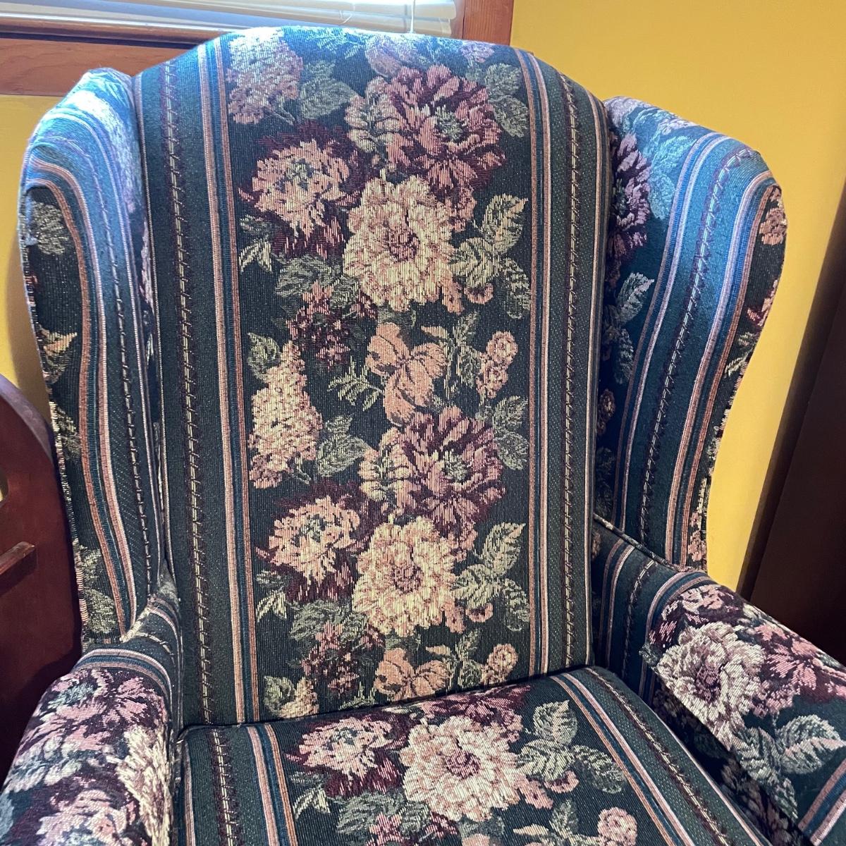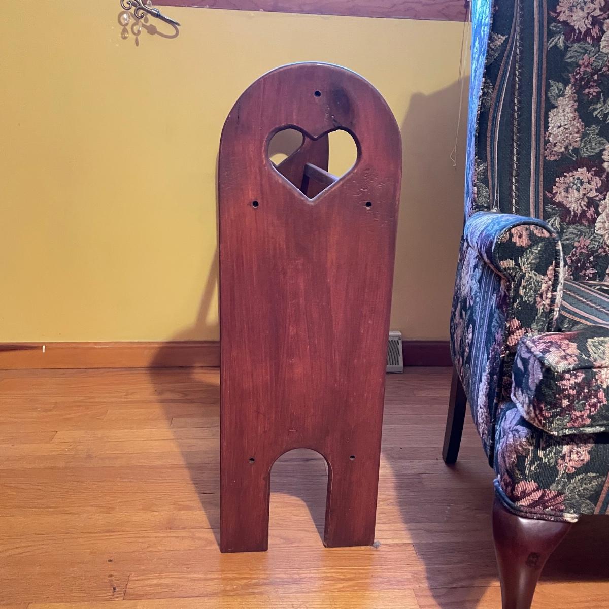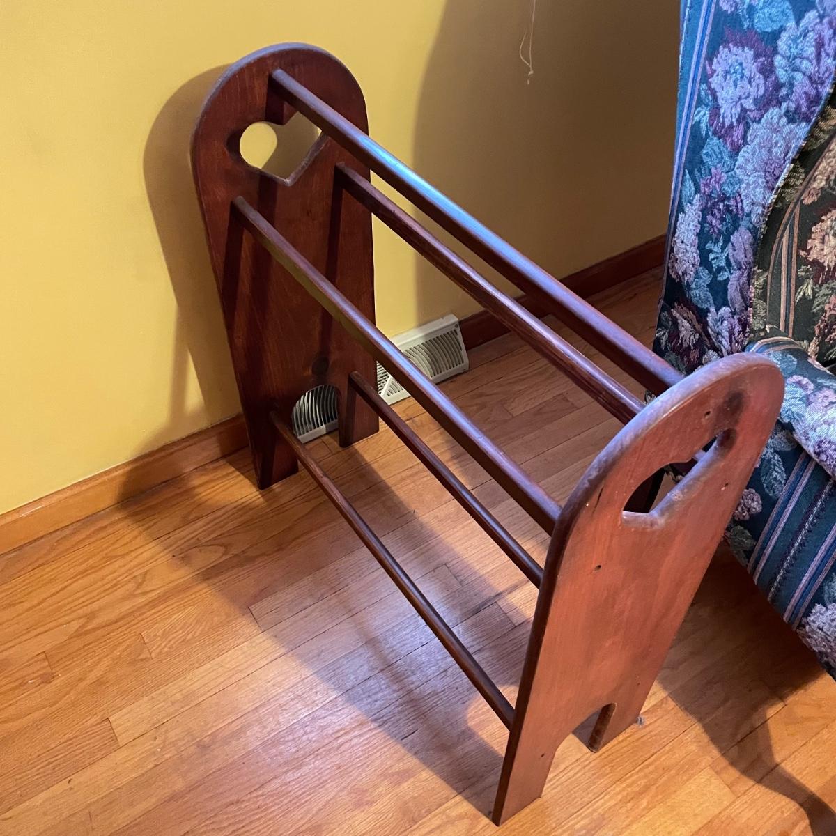 Floral forest green Broyhill wingback armchair with wooden legs and arm covers. Chair is clean and comfortable, measuring 28.5” x 26” x 43.5” with a seat height around 20”. The quilt rack appears to be solid wood with heart cutouts on each side. This piece measures 30.5” x 11” x 32.75. See images. Local pick up only.