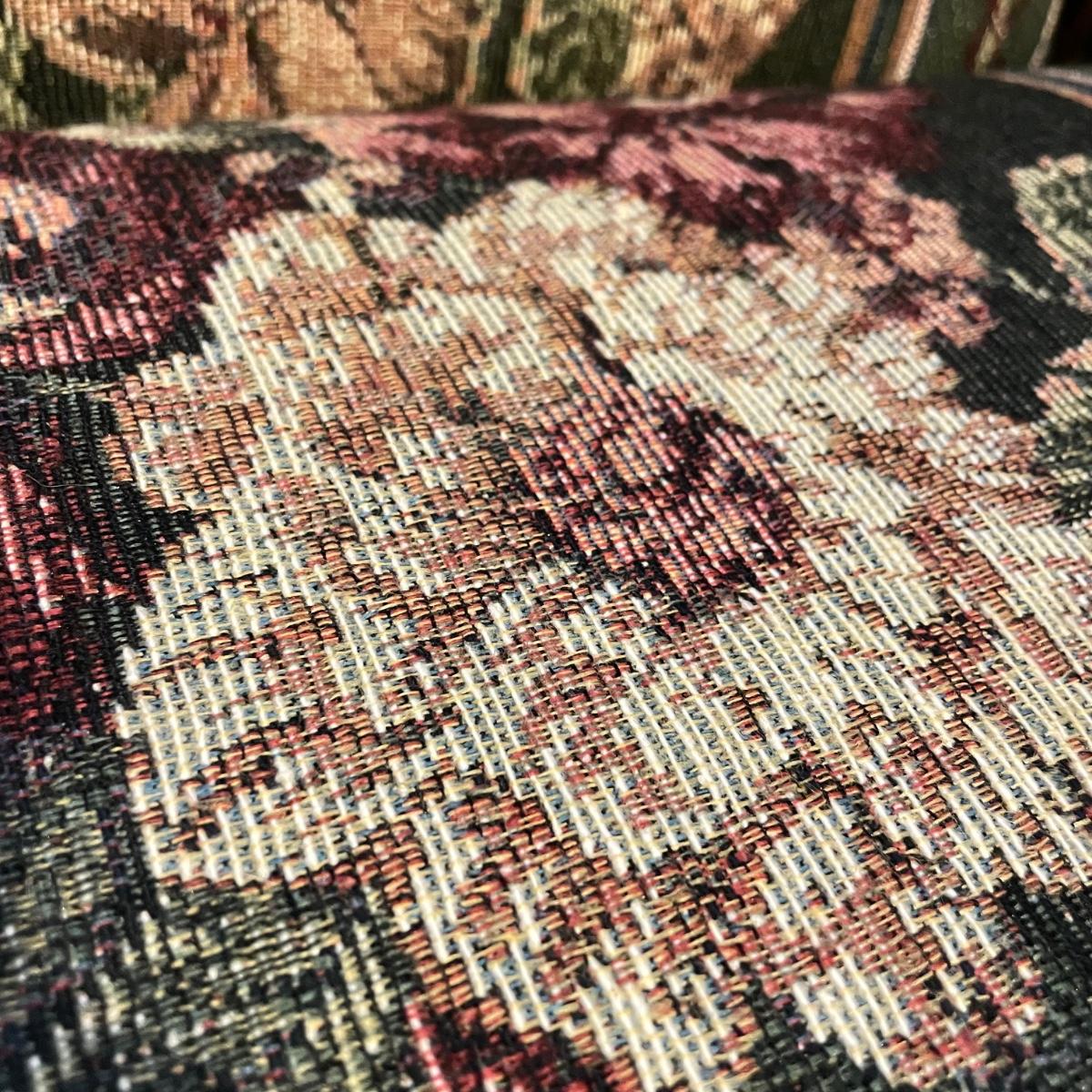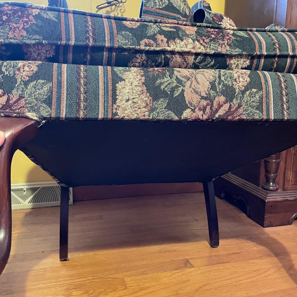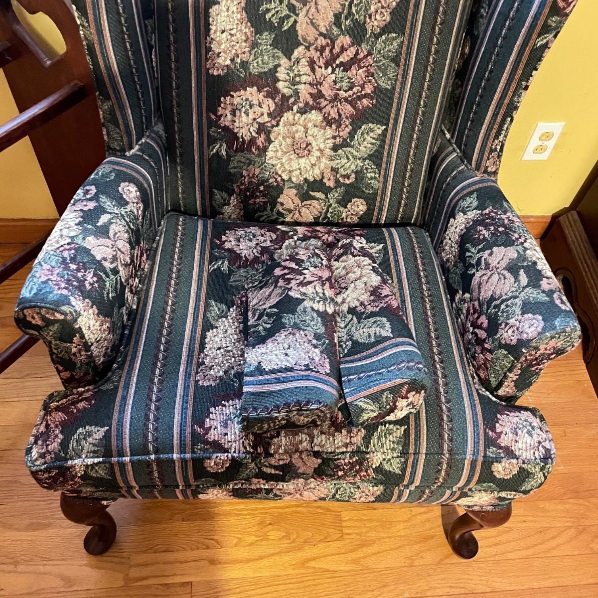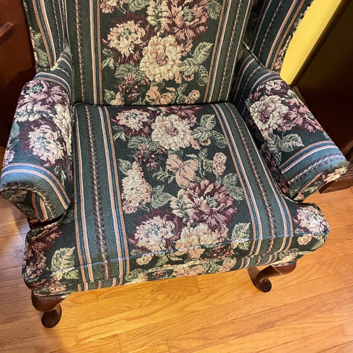 Floral forest green Broyhill wingback armchair with wooden legs and arm covers. Chair is clean and comfortable, measuring 28.5” x 26” x 43.5” with a seat height around 20”. The quilt rack appears to be solid wood with heart cutouts on each side. This piece measures 30.5” x 11” x 32.75. See images. Local pick up only.