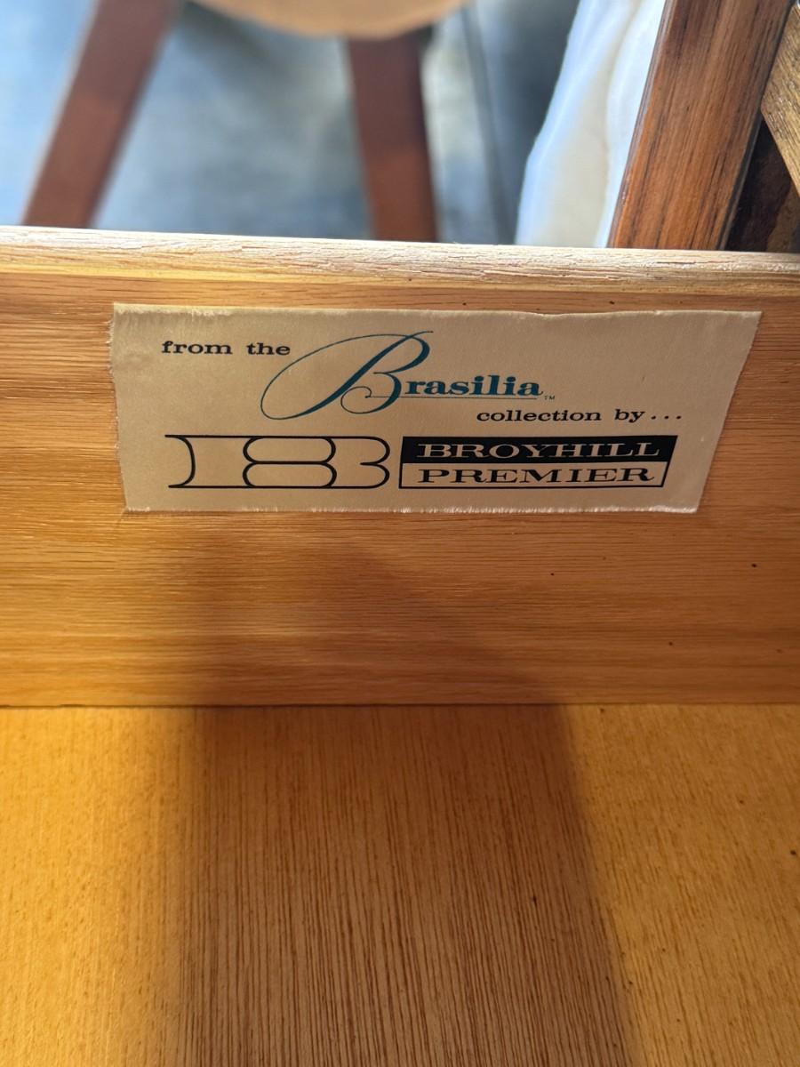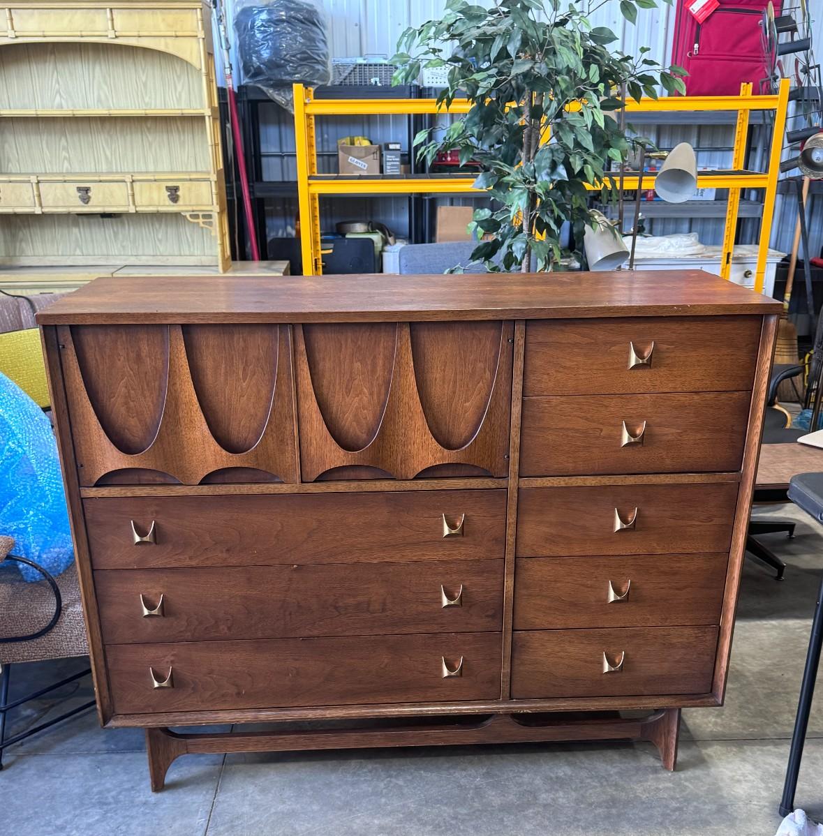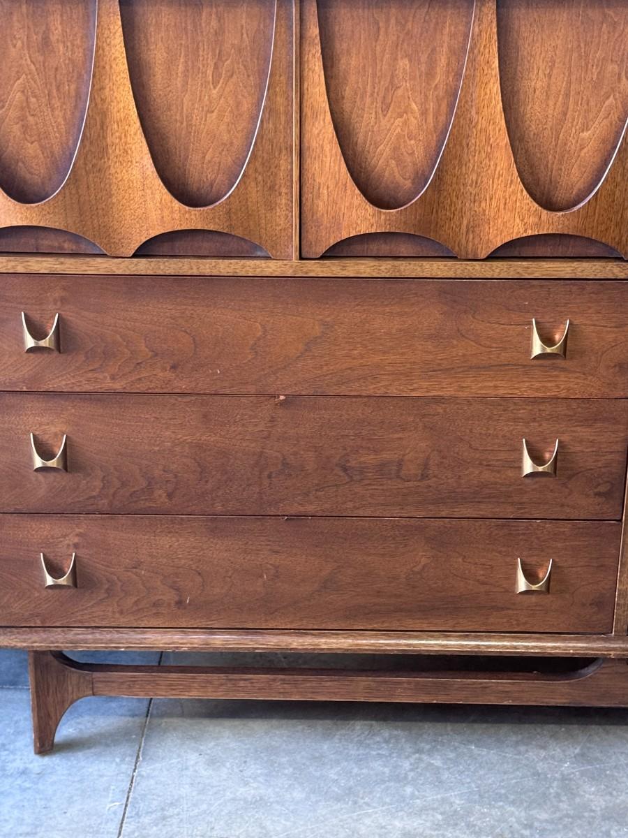 An outstanding Mid-Century walnut highboy dresser or chest of drawers from the Broyhill Brasilia line, circa 1960s. The chest features eight dovetailed drawers with signature brass handles. Includes open storage with two dividers behind sculpted arched doors.