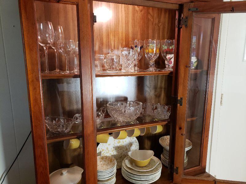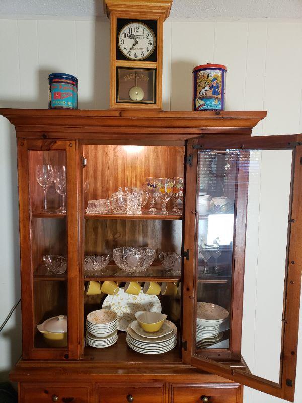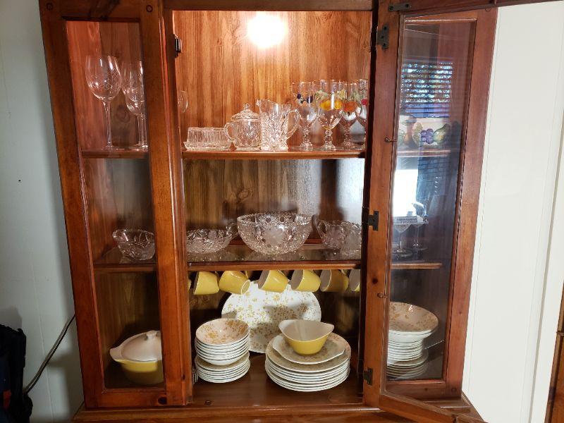 Broyhill china cabinet.3 glass shelves, light, 1 drawer, 3 doors across the bottom.