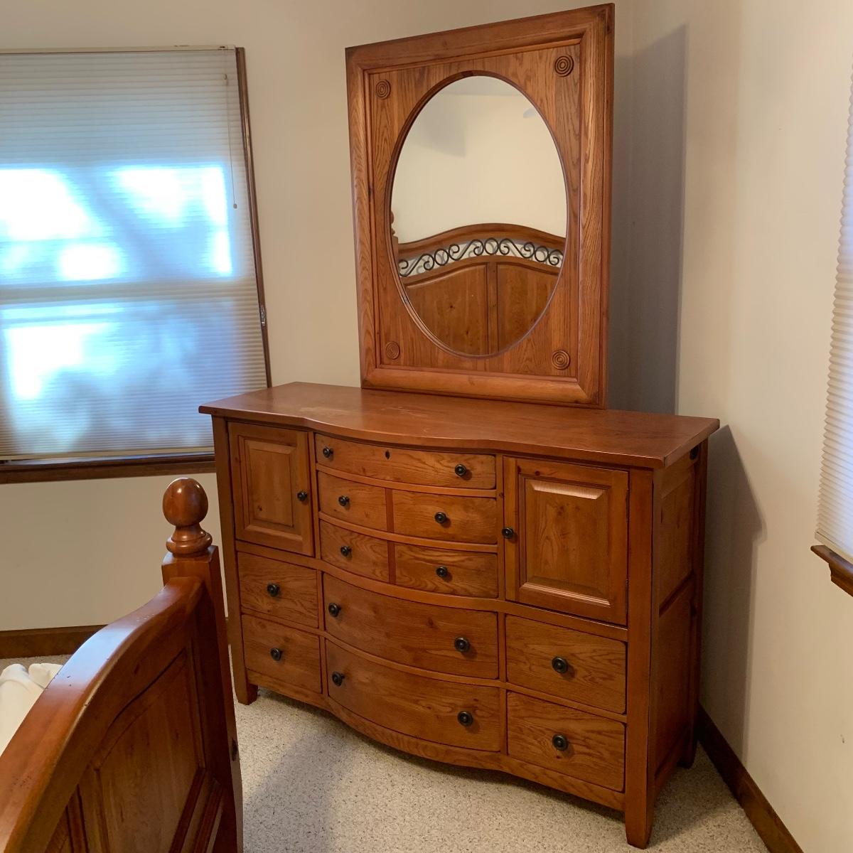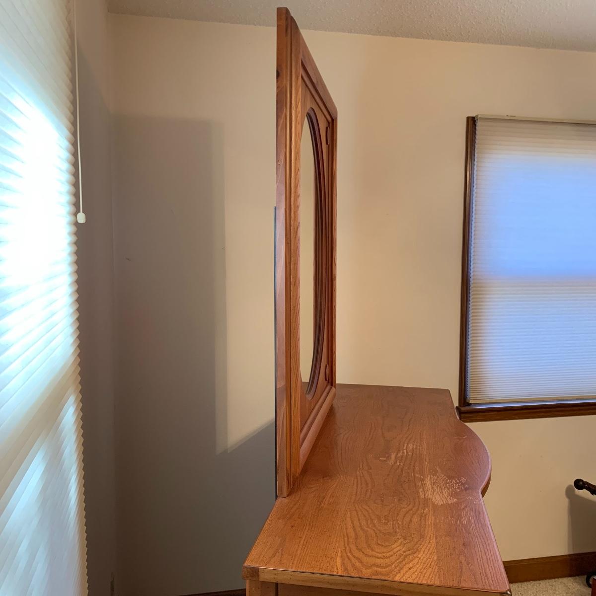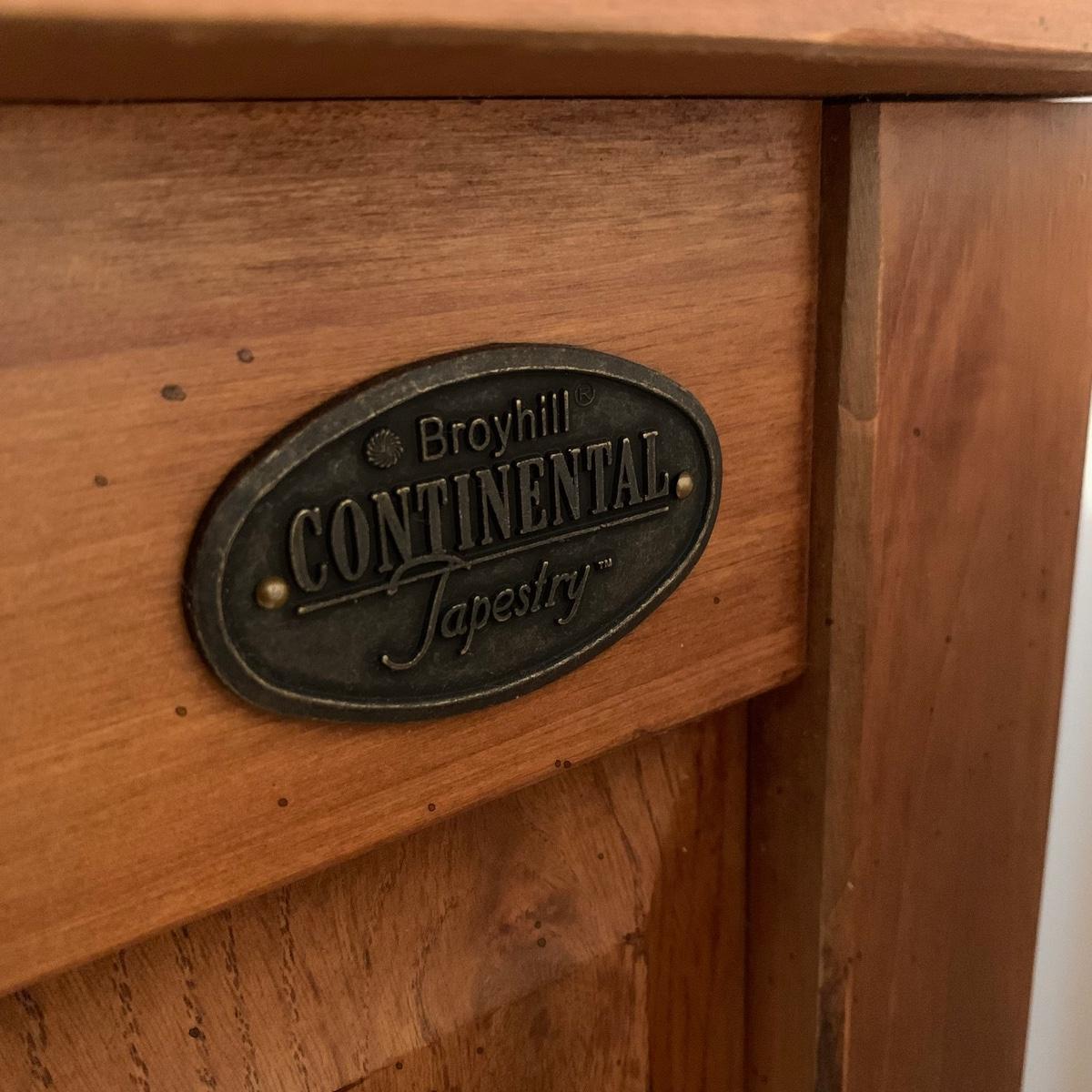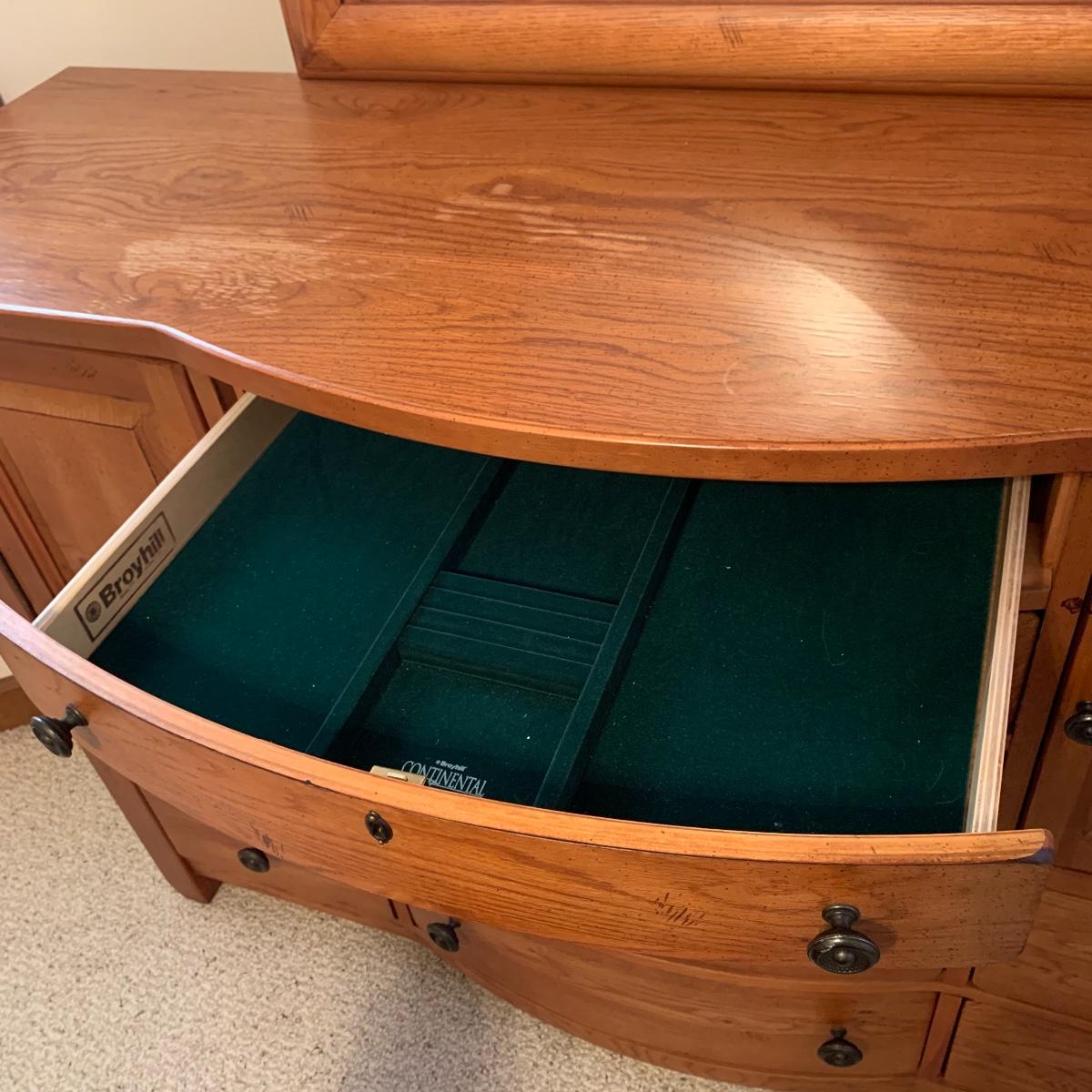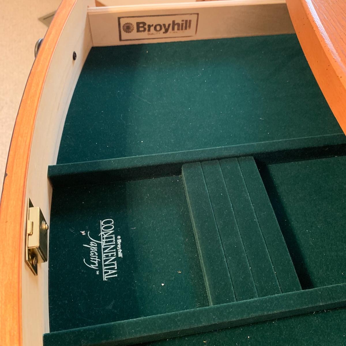 This is a Broyhill Continental Tapestry Dresser that was made in the USA. It has nine drawers and two hinged door cabinets. The top middle drawer has a removable velvet jewelry divider. It has a keyhole, but no key is included. The top surface of the dresser has some small scratches and possible water spots, but the dresser is in very good condition structurally. The measurement of the dresser is 58” x 20” x 40”. There is a detachable mirror. The mirror is oval in a rectangular wooden frame. A Philips head screwdriver is needed to remove the mirror from the dresser. The mirror measures 34” x 42”. With the mirror attached to the dresser, the total height is about 81”. Local pickup only. Please be aware that this piece of furniture is quite heavy and the winning bidder is required to bring someone to help move it.