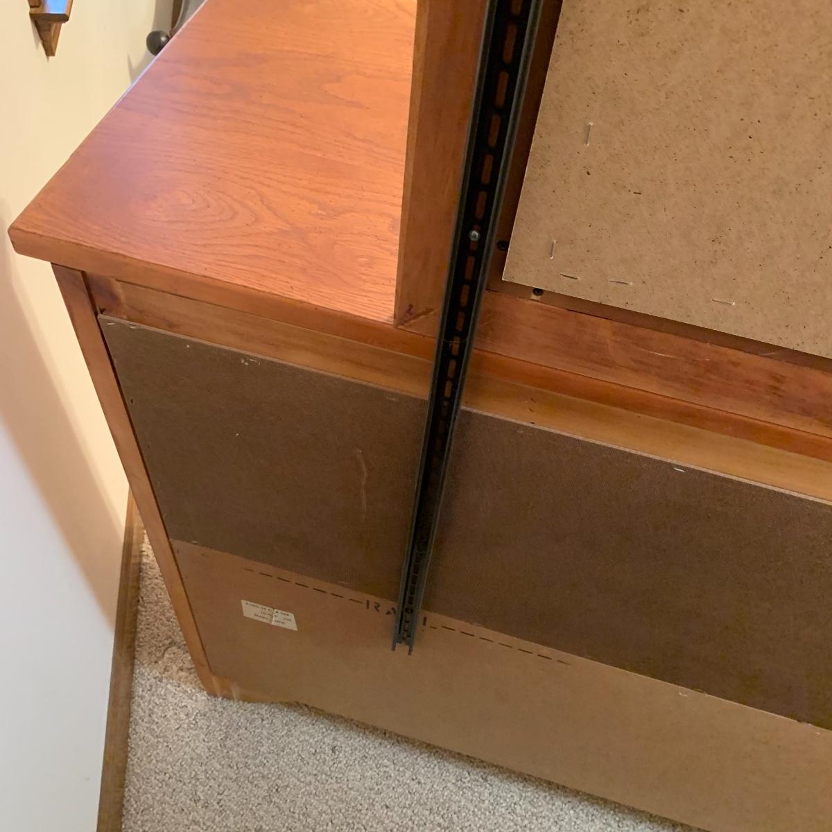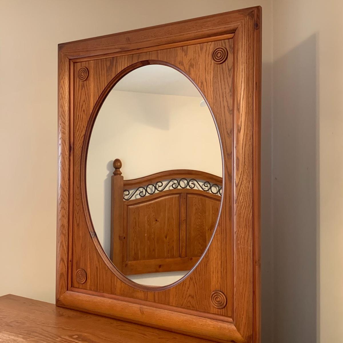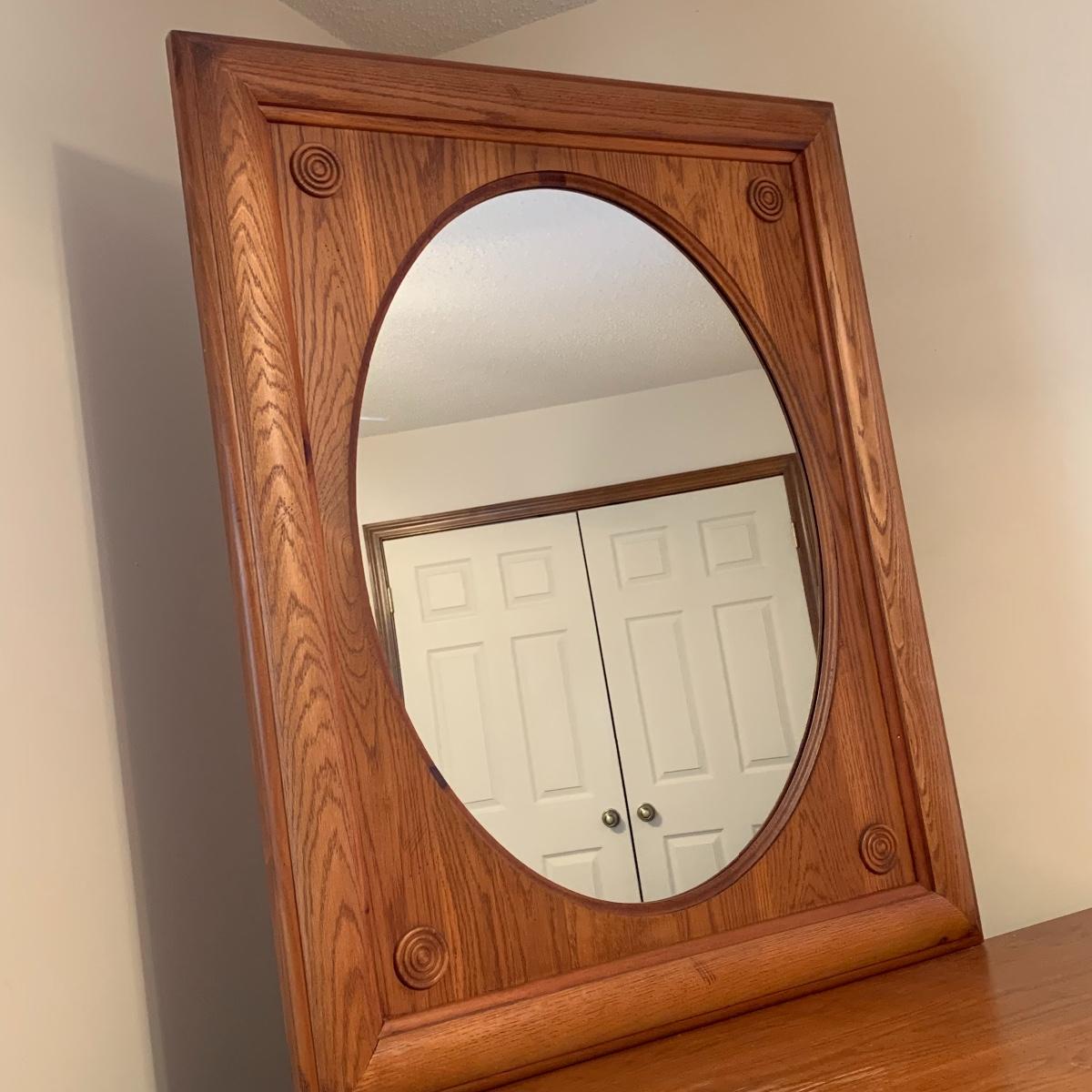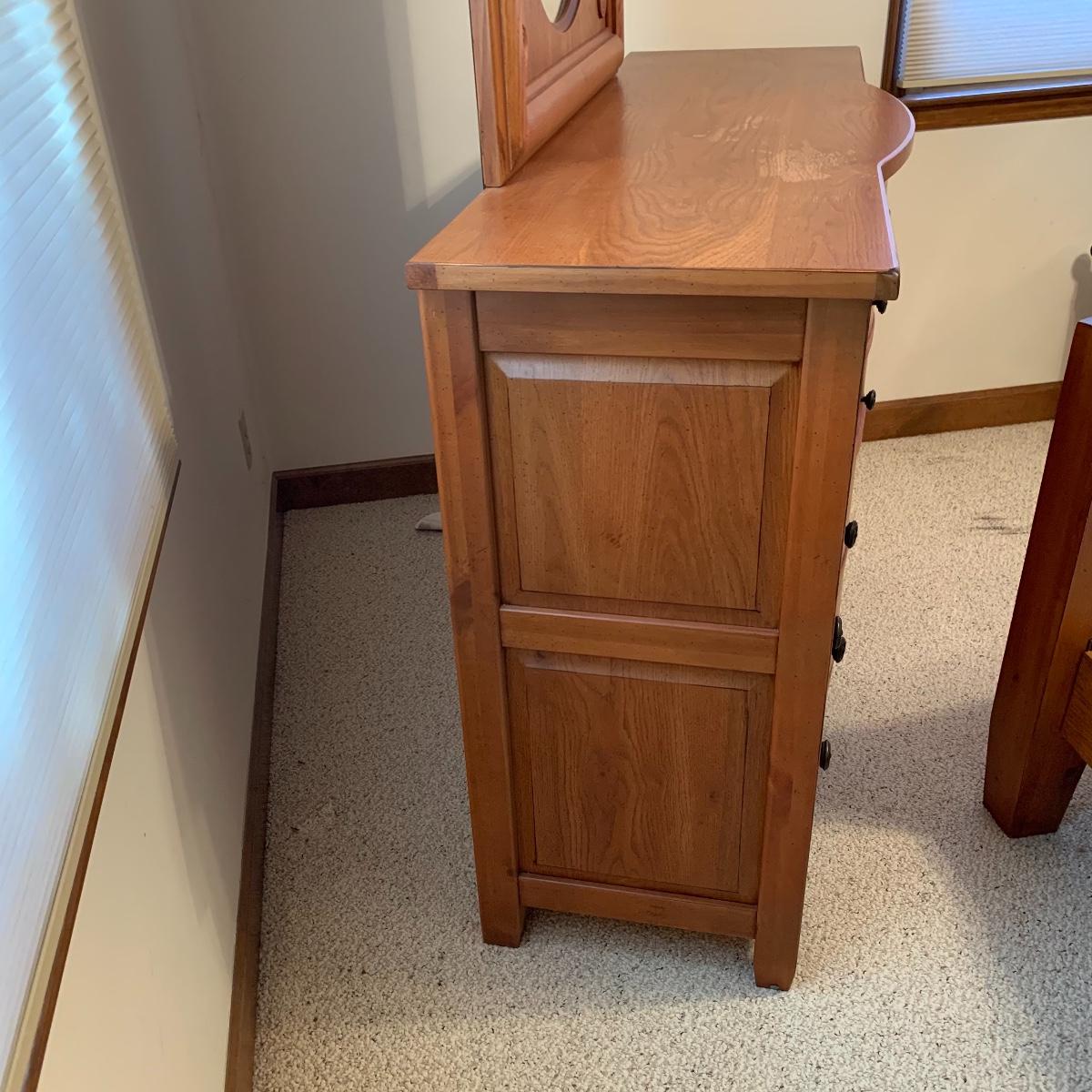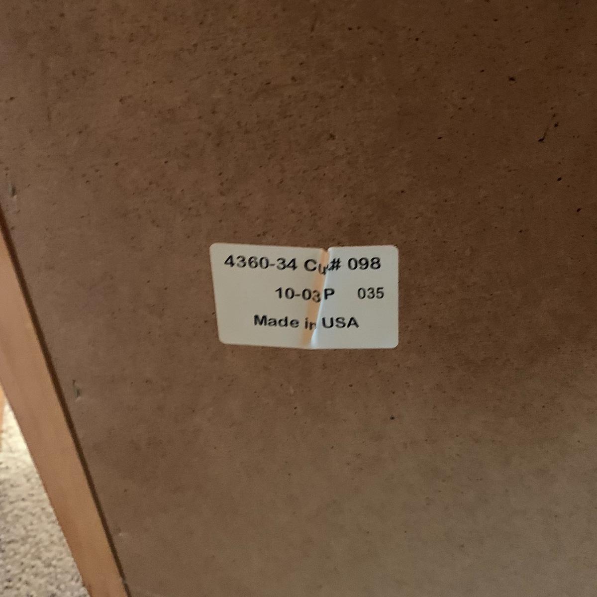 This is a Broyhill Continental Tapestry Dresser that was made in the USA. It has nine drawers and two hinged door cabinets. The top middle drawer has a removable velvet jewelry divider. It has a keyhole, but no key is included. The top surface of the dresser has some small scratches and possible water spots, but the dresser is in very good condition structurally. The measurement of the dresser is 58” x 20” x 40”. There is a detachable mirror. The mirror is oval in a rectangular wooden frame. A Philips head screwdriver is needed to remove the mirror from the dresser. The mirror measures 34” x 42”. With the mirror attached to the dresser, the total height is about 81”. Local pickup only. Please be aware that this piece of furniture is quite heavy and the winning bidder is required to bring someone to help move it.