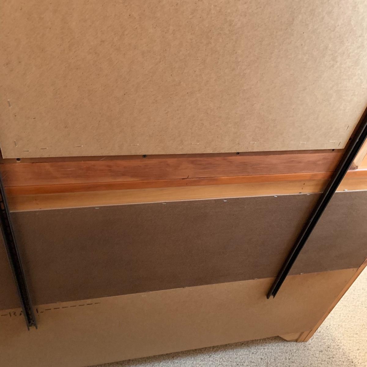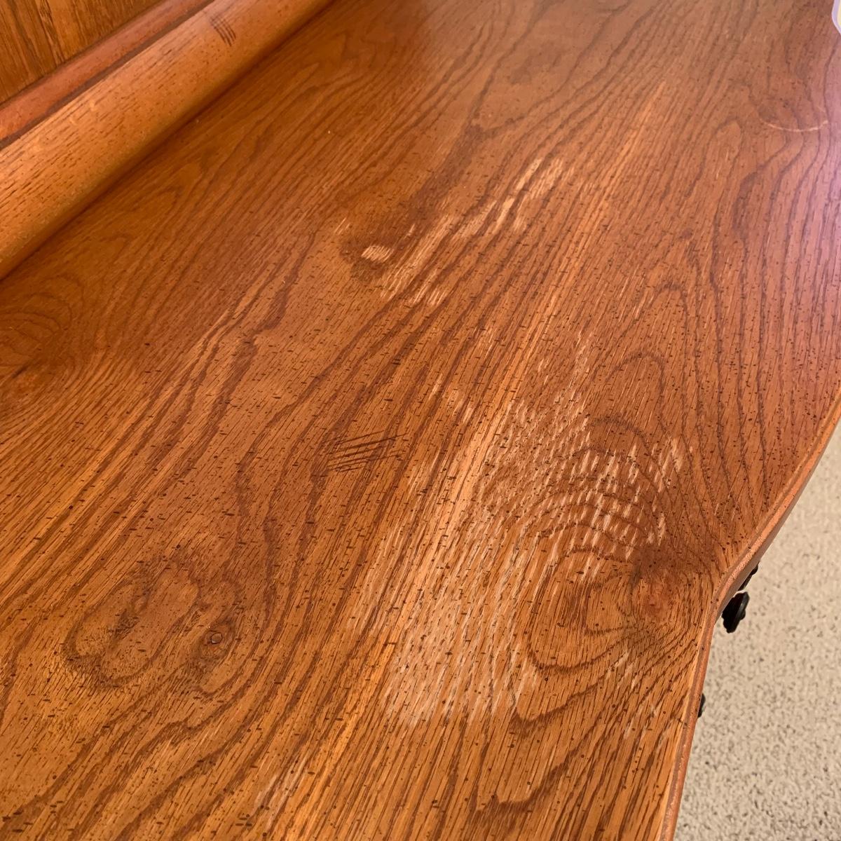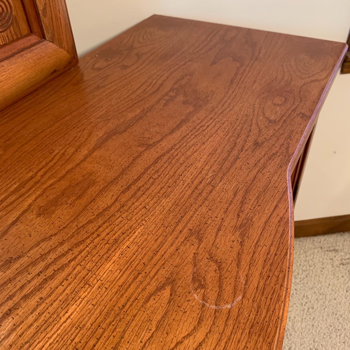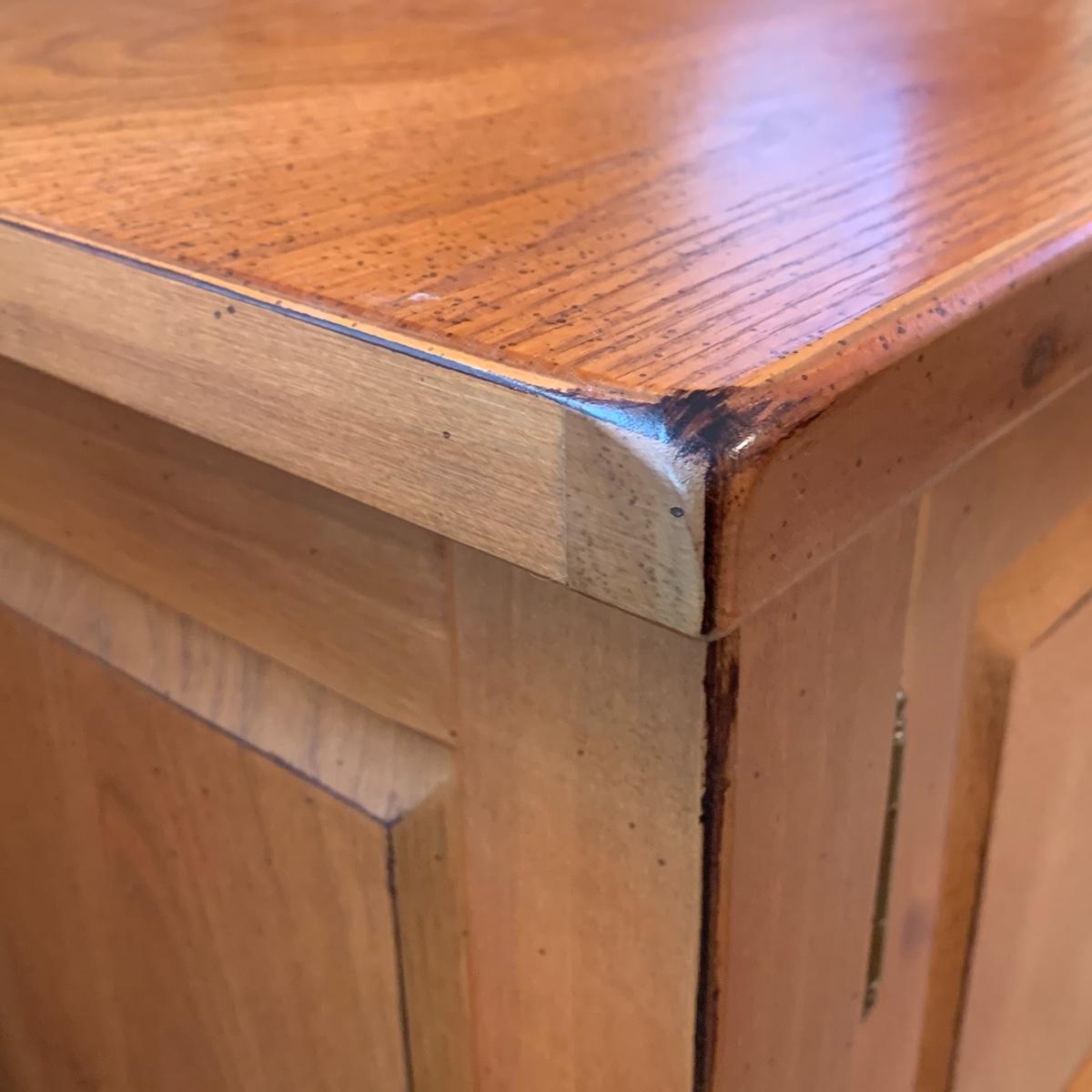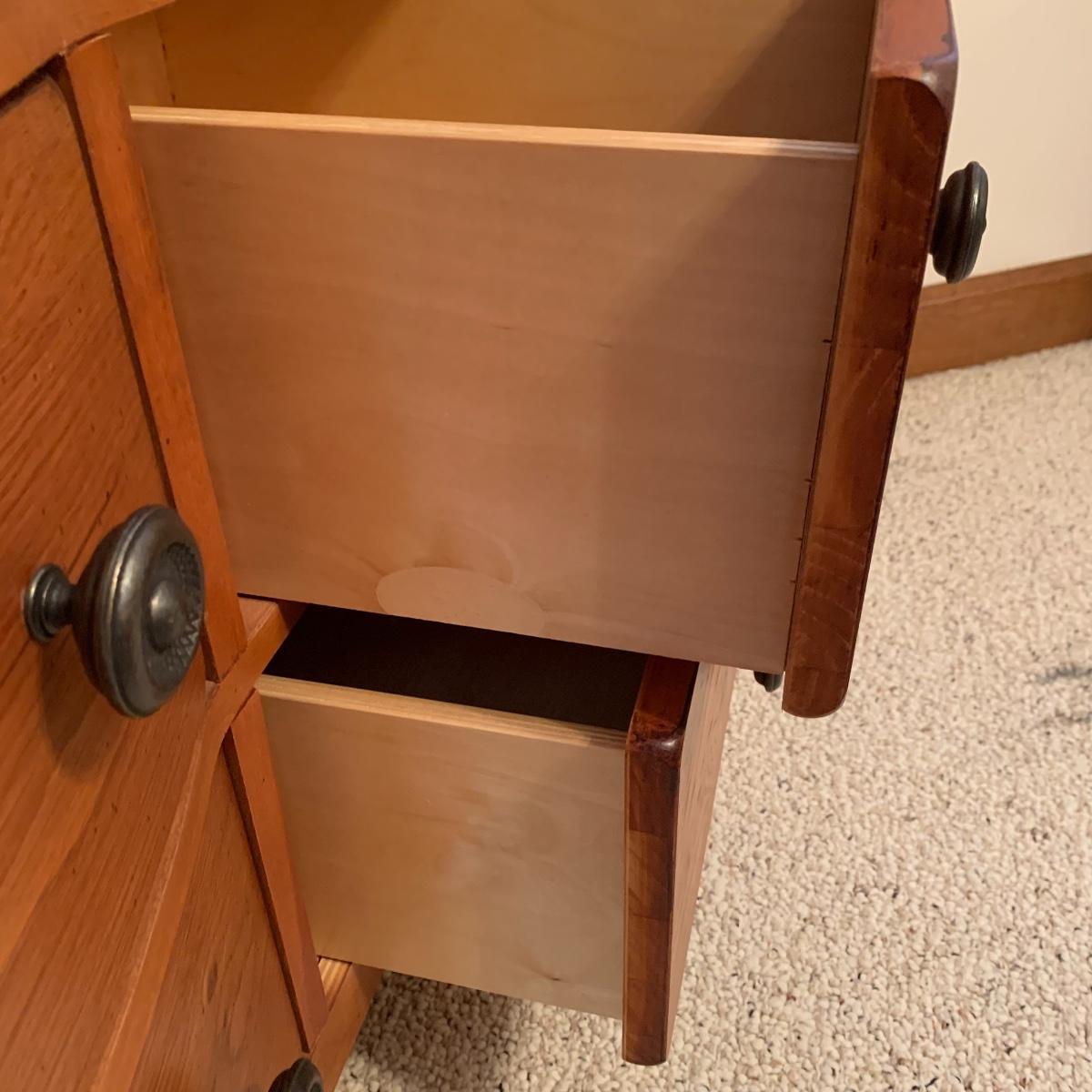 This is a Broyhill Continental Tapestry Dresser that was made in the USA. It has nine drawers and two hinged door cabinets. The top middle drawer has a removable velvet jewelry divider. It has a keyhole, but no key is included. The top surface of the dresser has some small scratches and possible water spots, but the dresser is in very good condition structurally. The measurement of the dresser is 58” x 20” x 40”. There is a detachable mirror. The mirror is oval in a rectangular wooden frame. A Philips head screwdriver is needed to remove the mirror from the dresser. The mirror measures 34” x 42”. With the mirror attached to the dresser, the total height is about 81”. Local pickup only. Please be aware that this piece of furniture is quite heavy and the winning bidder is required to bring someone to help move it.