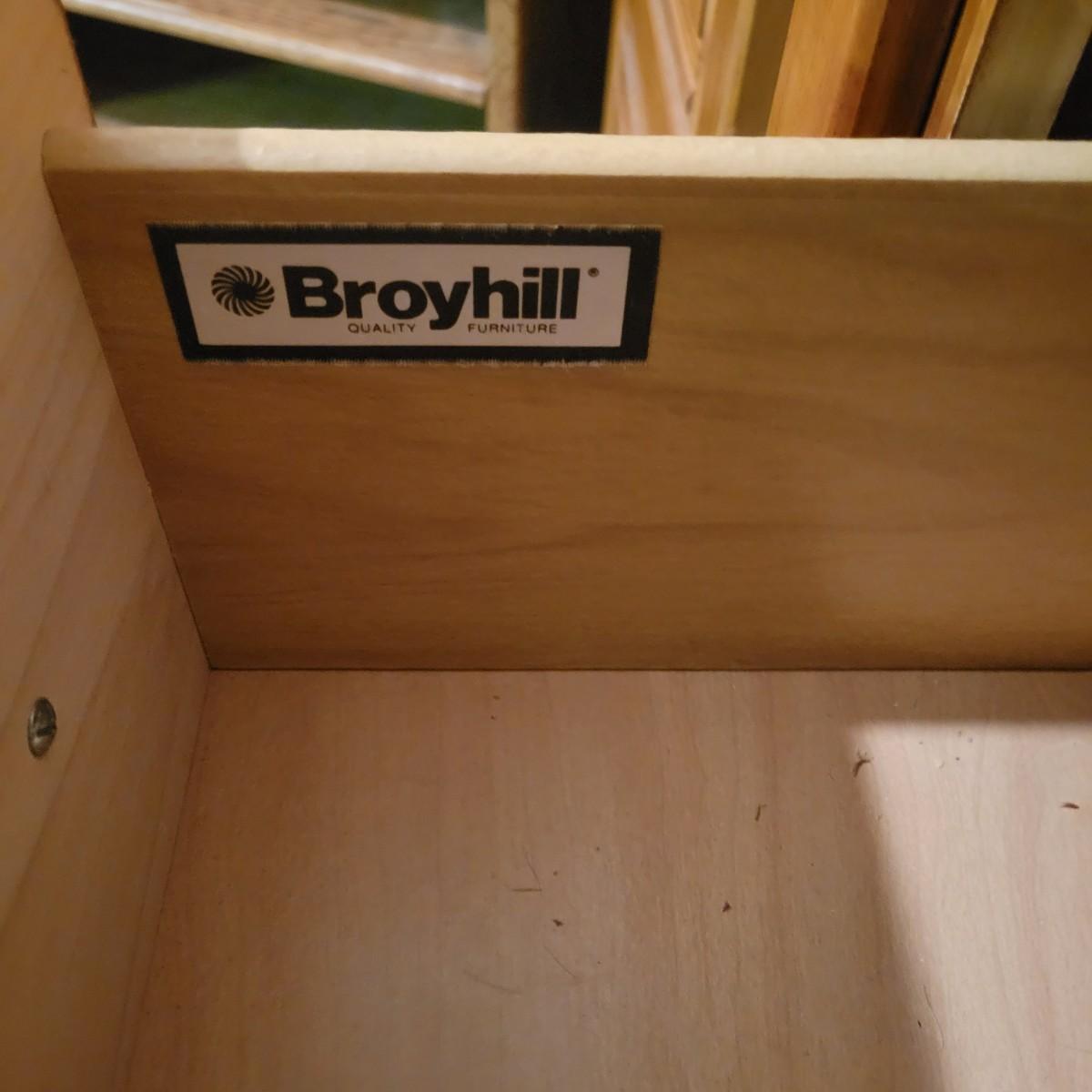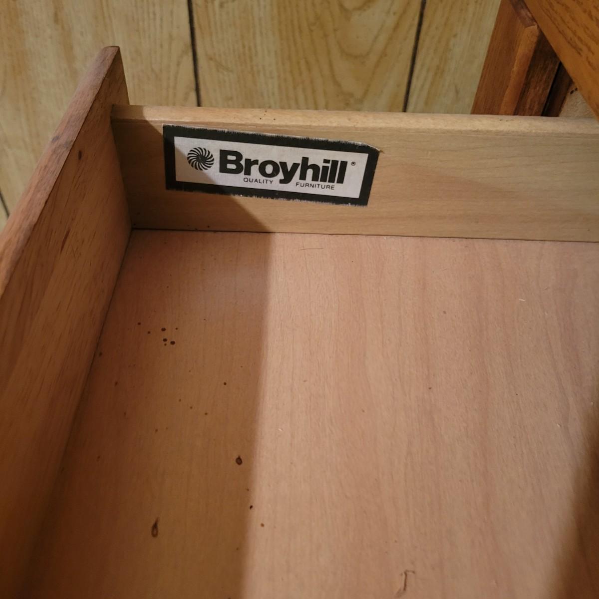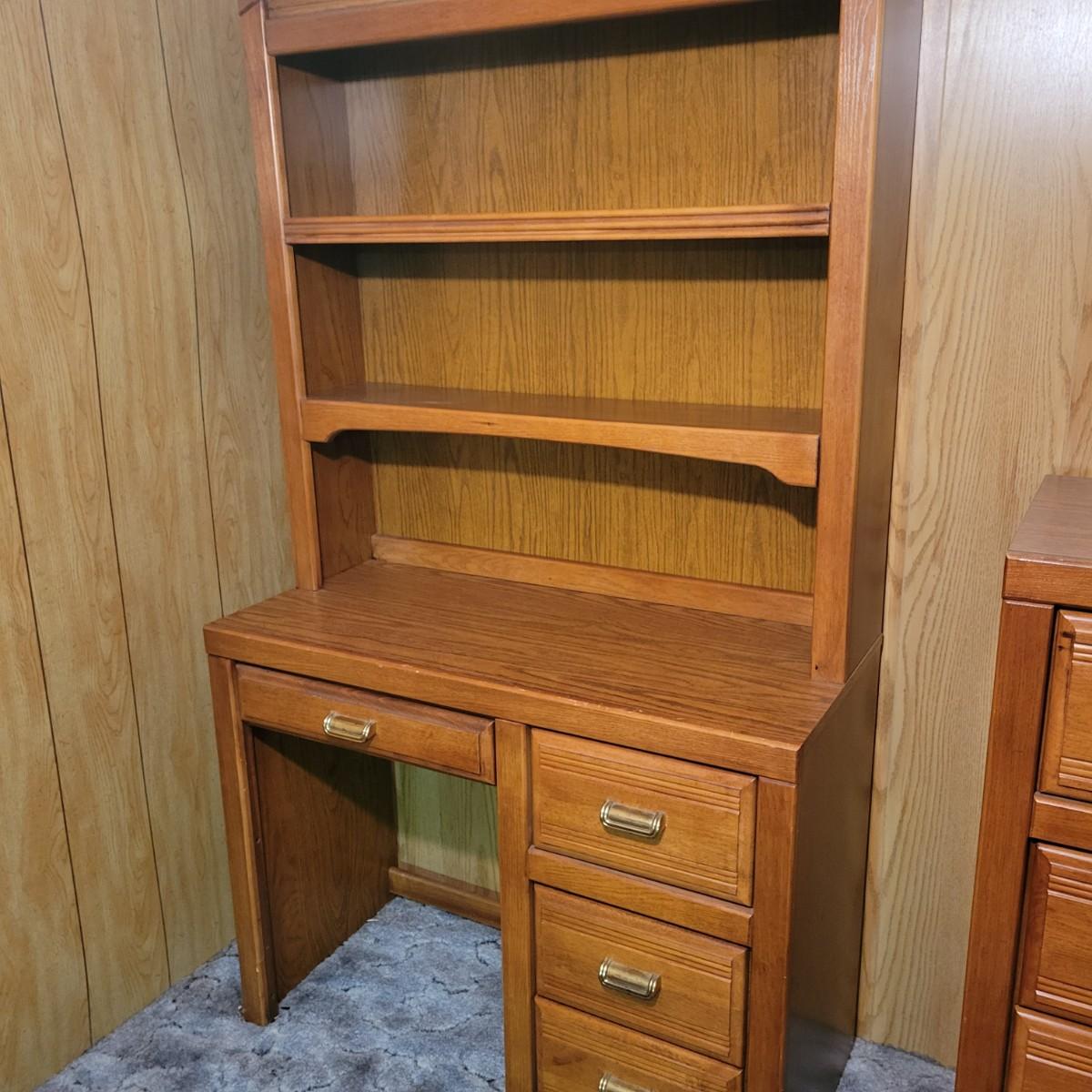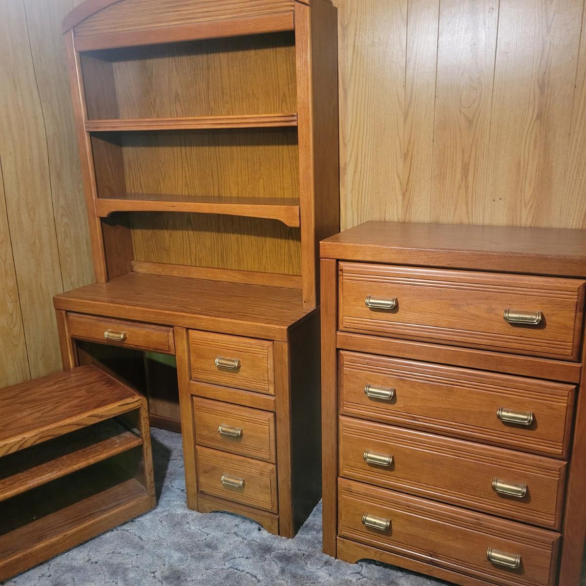 An assortment of three oak pieces of furniture manufactured by Broyhill in good condition with no notable damage. Included is a 4 drawer dresser with gold metal handles, a desk with a detachable bookshelf with 2 shelves and a rolling printer table with an extendable shelf to easily access printer. Desk and bookshelf measures approximately 40" x 18" x 76" Local pickup only. Winning bidder will need to move these items approximately 60ft and down a small set of stairs. It is recommended that you bring assistance.