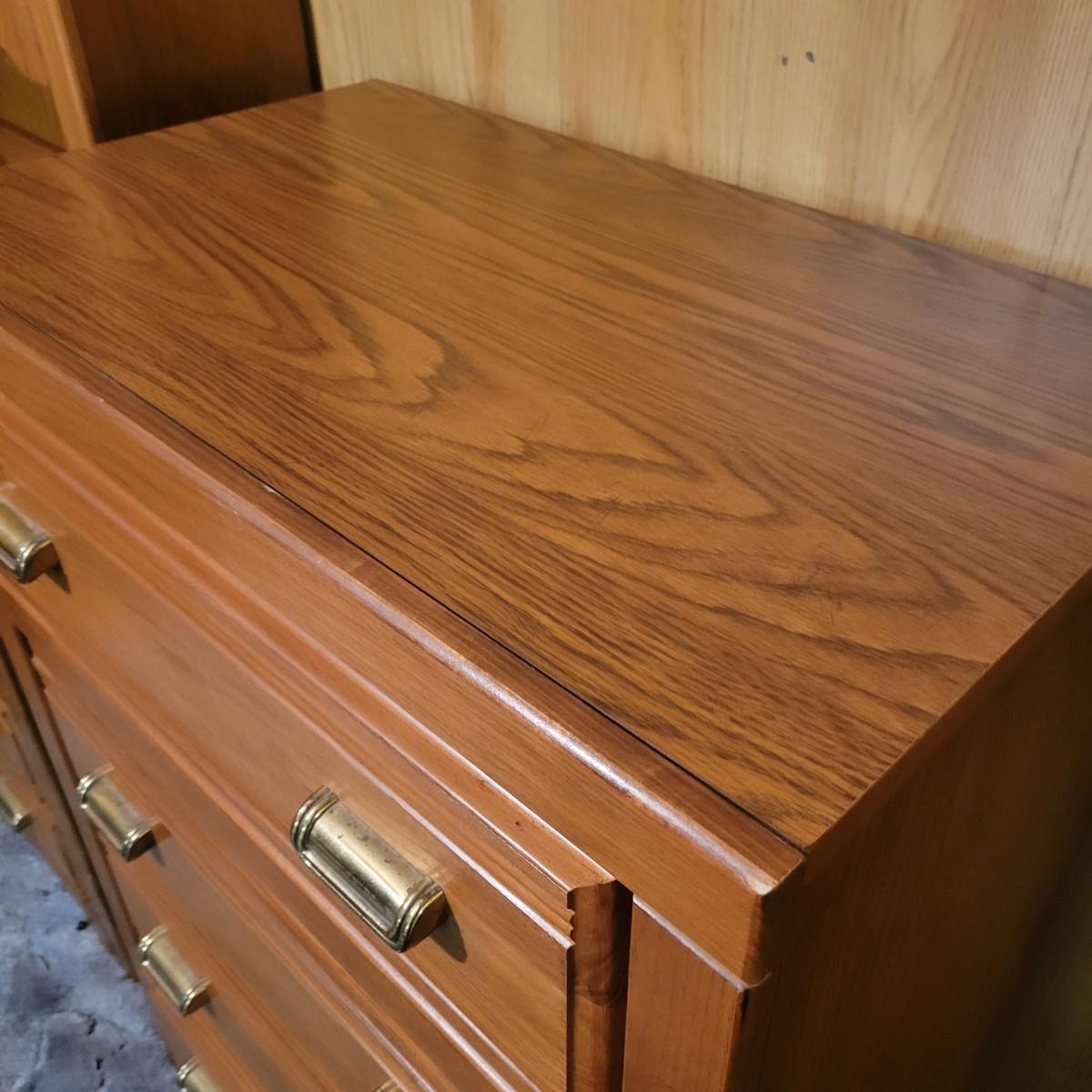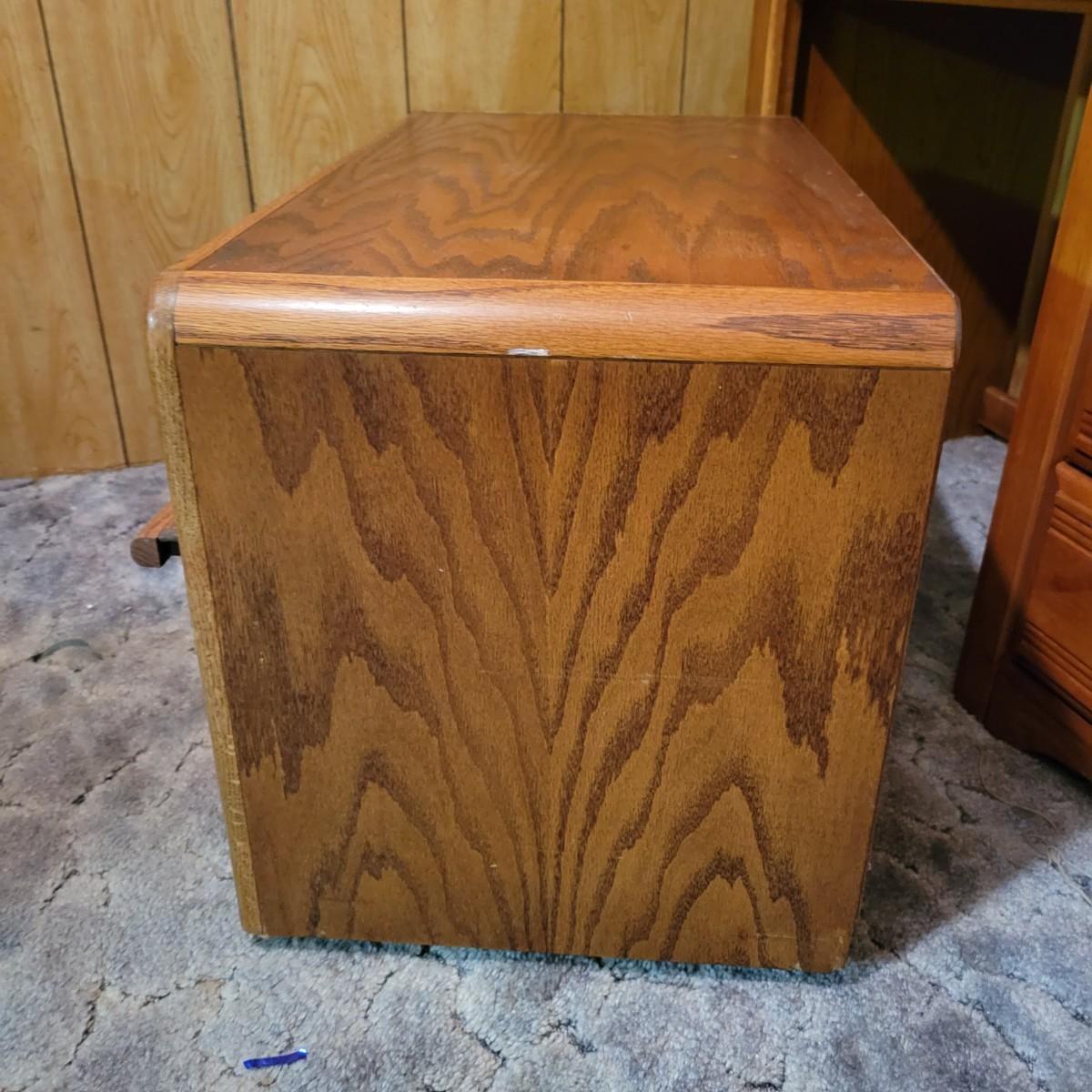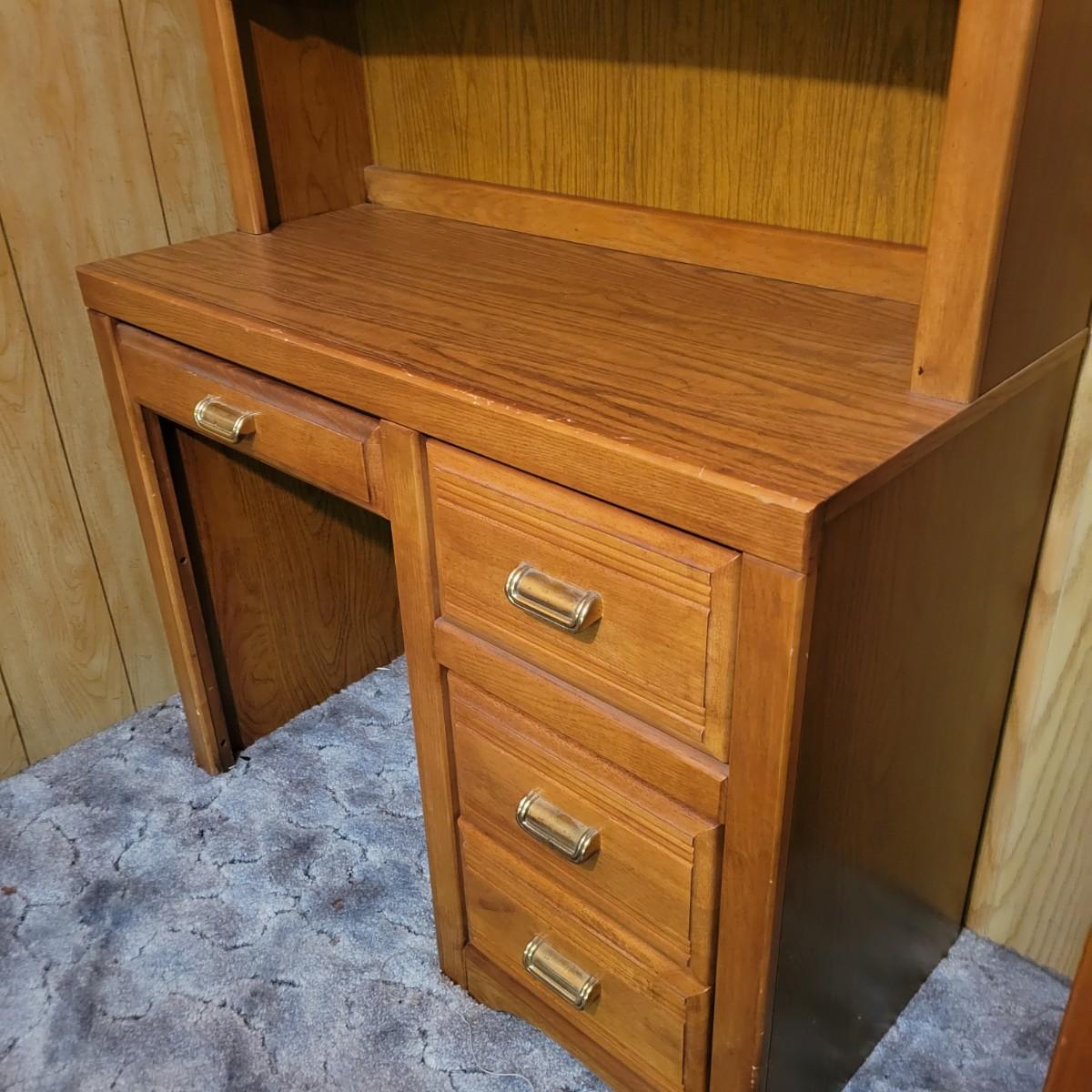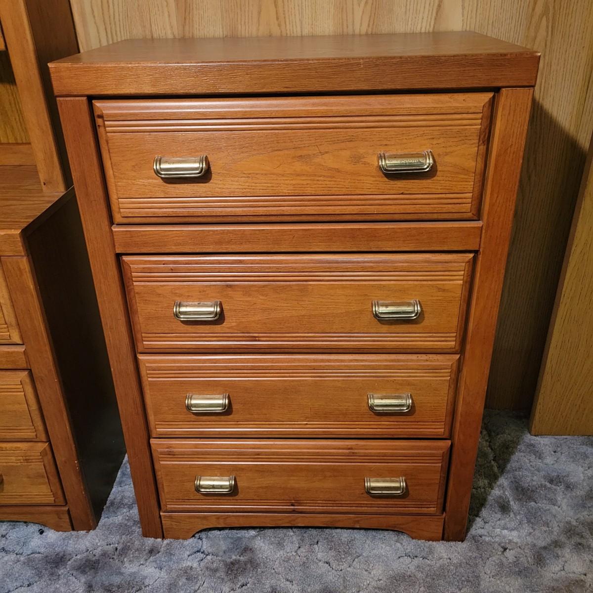 An assortment of three oak pieces of furniture manufactured by Broyhill in good condition with no notable damage. Included is a 4 drawer dresser with gold metal handles, a desk with a detachable bookshelf with 2 shelves and a rolling printer table with an extendable shelf to easily access printer. Desk and bookshelf measures approximately 40" x 18" x 76" Local pickup only. Winning bidder will need to move these items approximately 60ft and down a small set of stairs. It is recommended that you bring assistance.