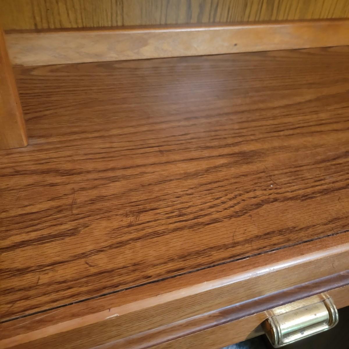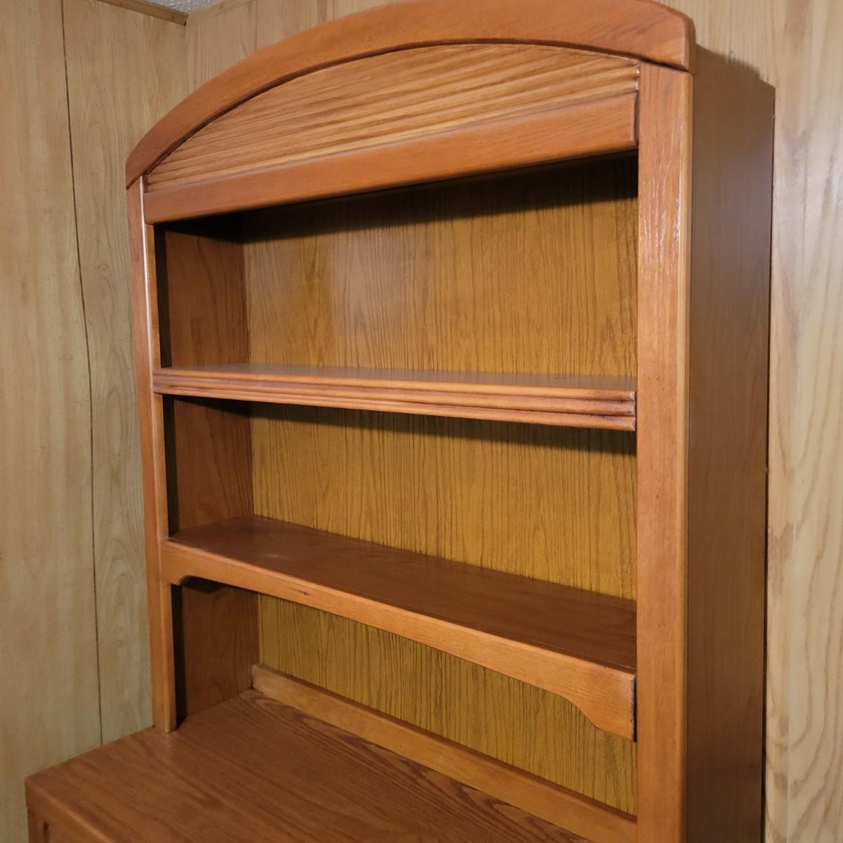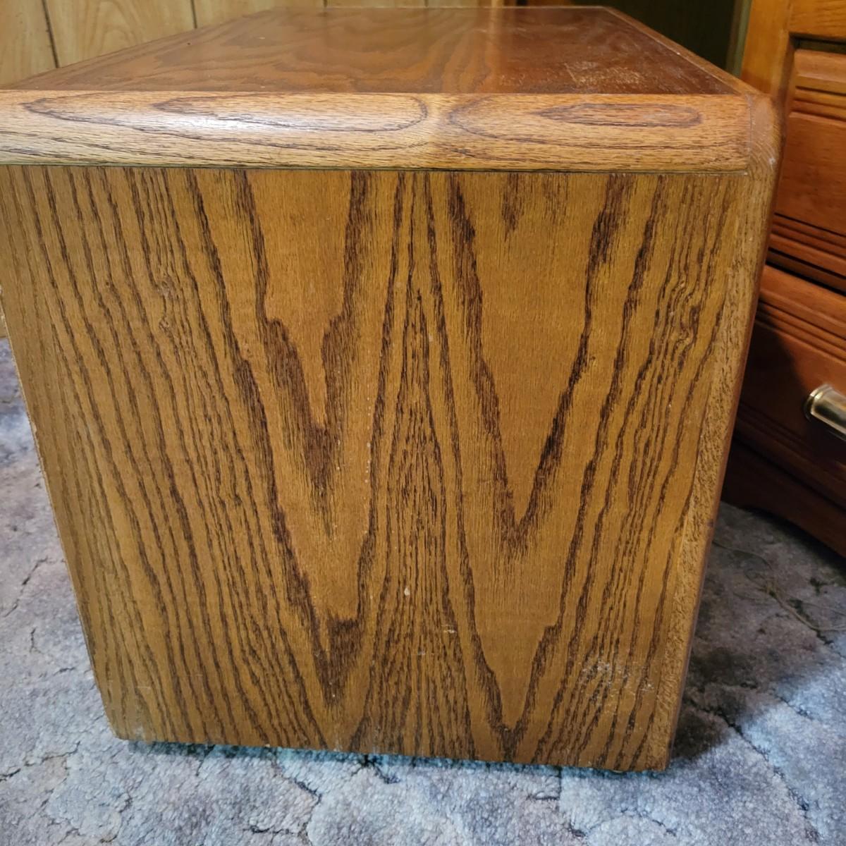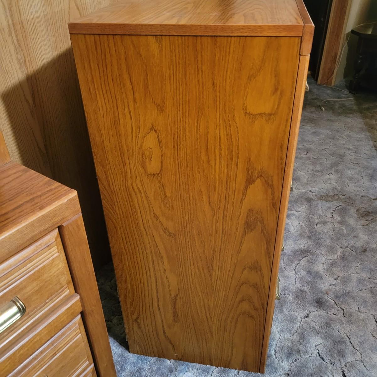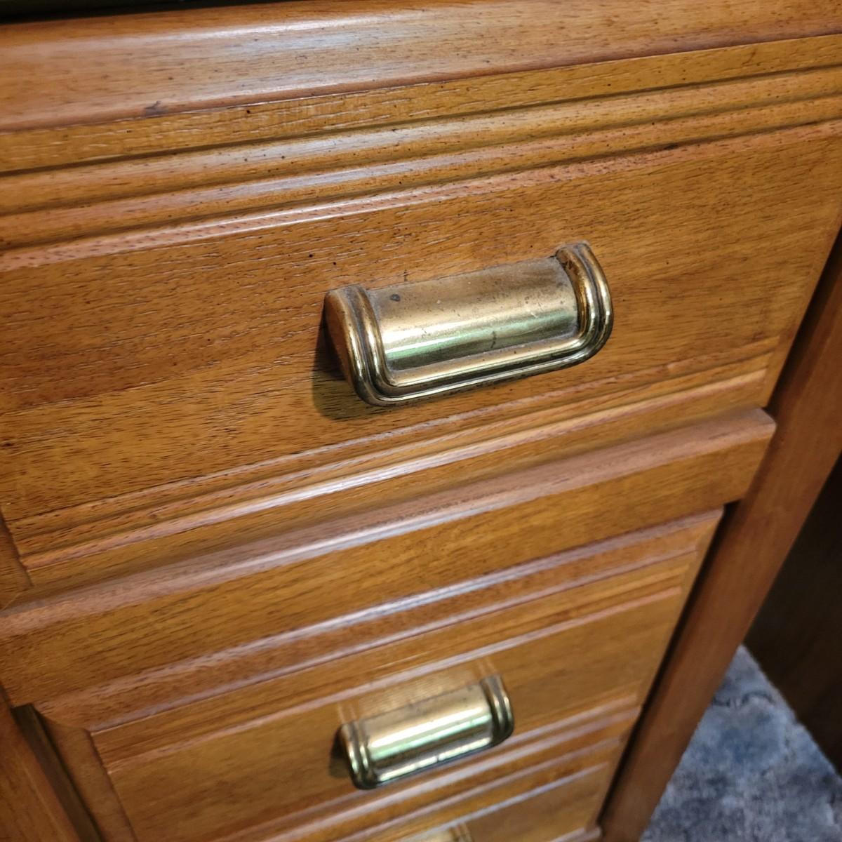 An assortment of three oak pieces of furniture manufactured by Broyhill in good condition with no notable damage. Included is a 4 drawer dresser with gold metal handles, a desk with a detachable bookshelf with 2 shelves and a rolling printer table with an extendable shelf to easily access printer. Desk and bookshelf measures approximately 40" x 18" x 76" Local pickup only. Winning bidder will need to move these items approximately 60ft and down a small set of stairs. It is recommended that you bring assistance.