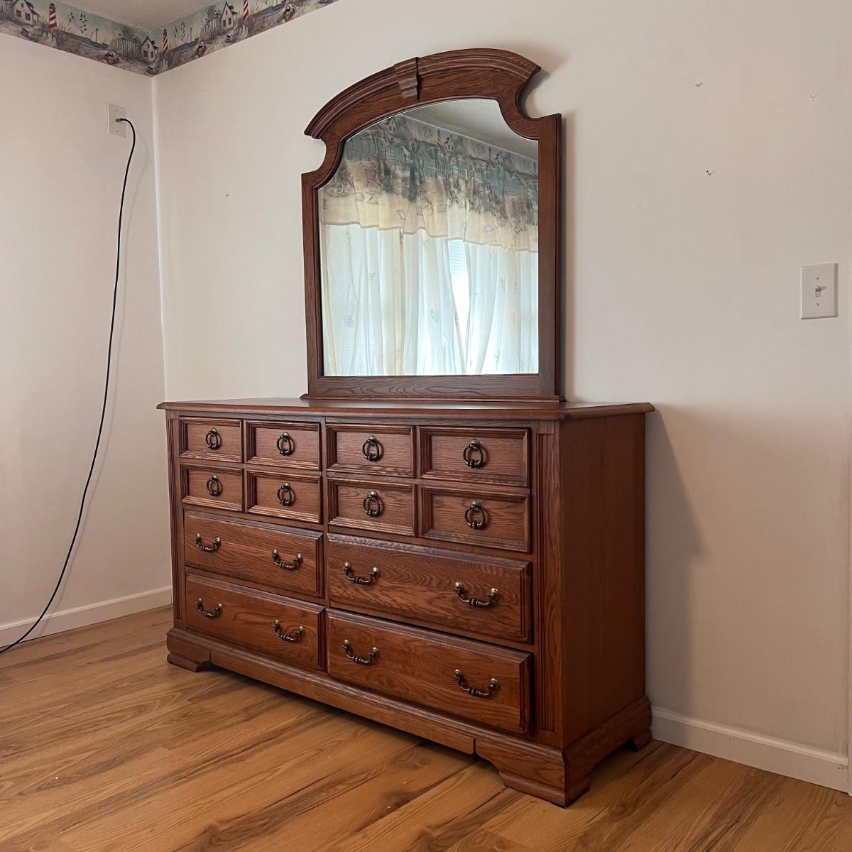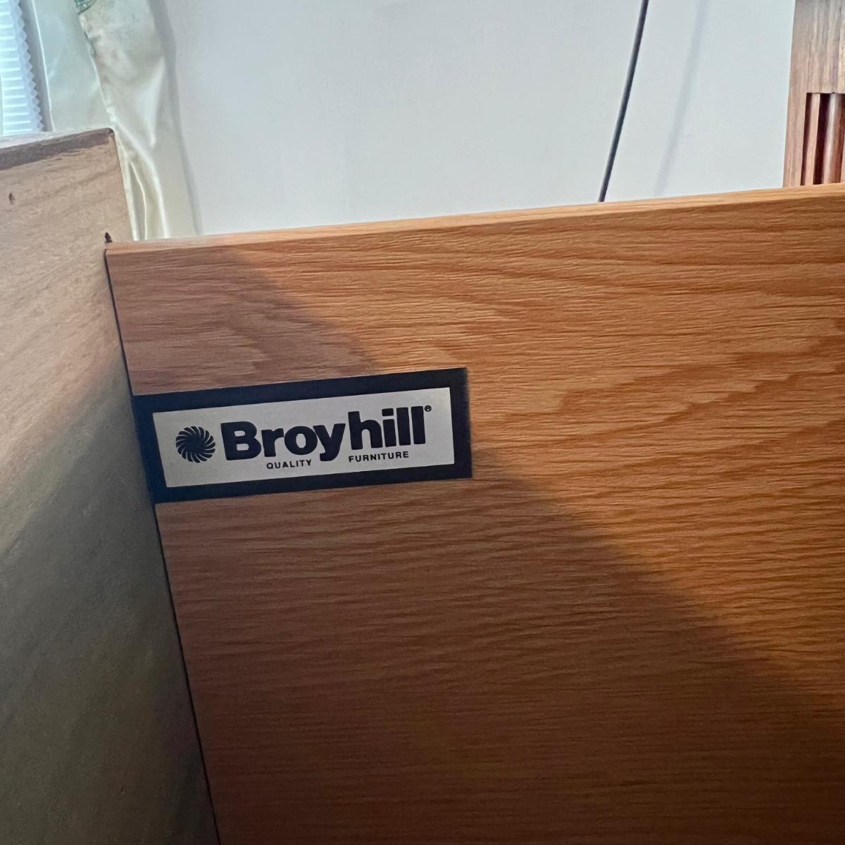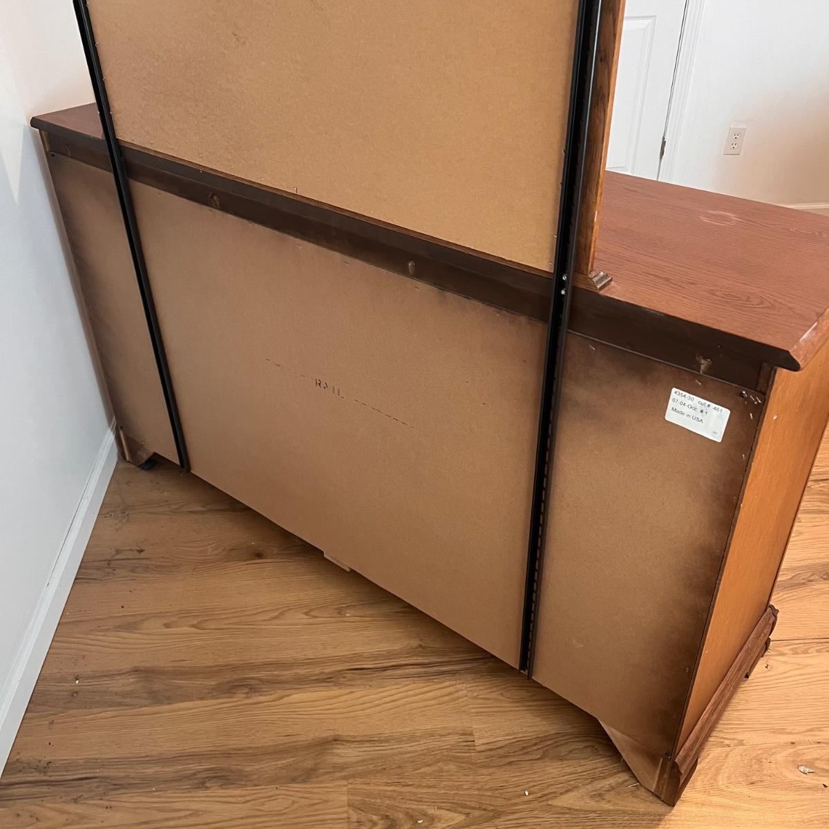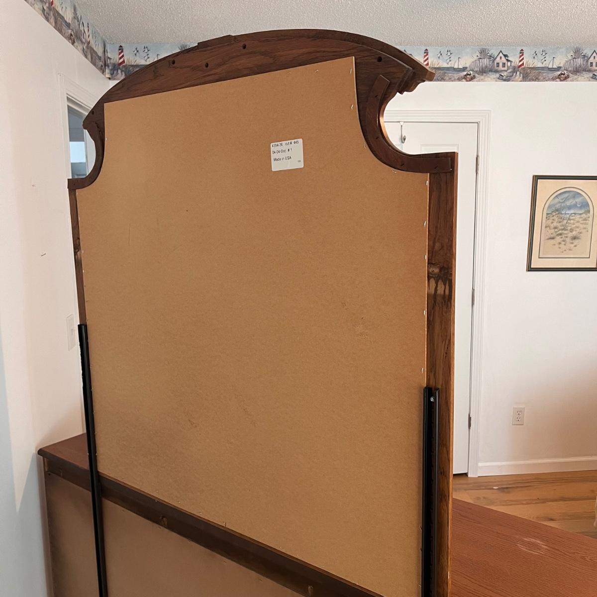 This Broyhill dresser has six drawers with a mirror attached to the top. The dresser measures at 63” x 18” x 36”H. The mirror measures at 41.5” x 41”H. In totality, this dresser and mirror are 77”H. There is one water mark on the top of the dresser - see picture included. Local pickup only. Winning bidder must bring assistance to help move and load this item due to its weight and/or size. Item is located on the second floor and will need to be moved down a flight of stairs. The mirror can be disassembled - see pictures of hardware included.