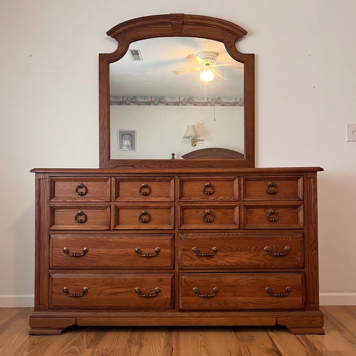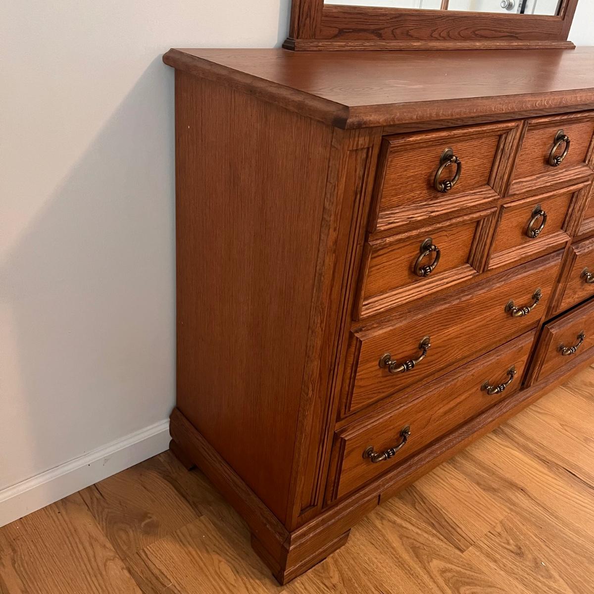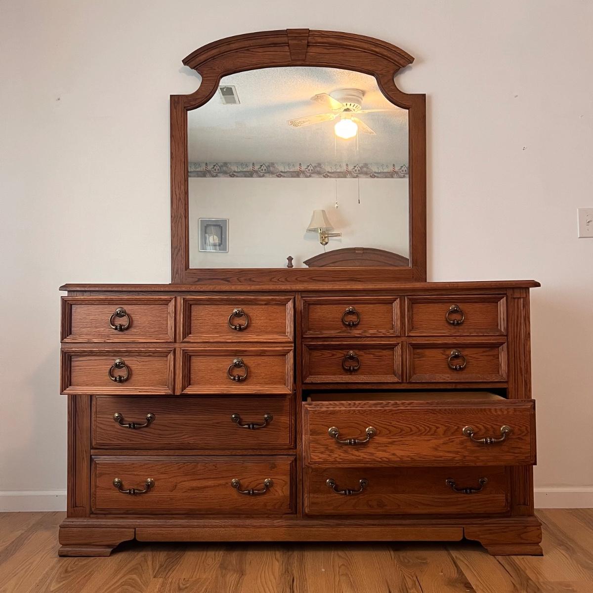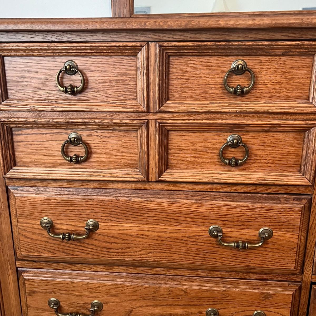 This Broyhill dresser has six drawers with a mirror attached to the top. The dresser measures at 63” x 18” x 36”H. The mirror measures at 41.5” x 41”H. In totality, this dresser and mirror are 77”H. There is one water mark on the top of the dresser - see picture included. Local pickup only. Winning bidder must bring assistance to help move and load this item due to its weight and/or size. Item is located on the second floor and will need to be moved down a flight of stairs. The mirror can be disassembled - see pictures of hardware included.