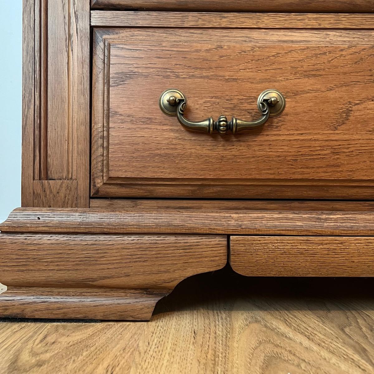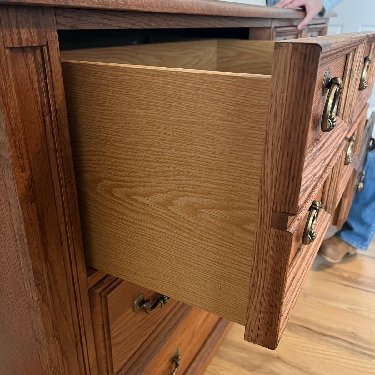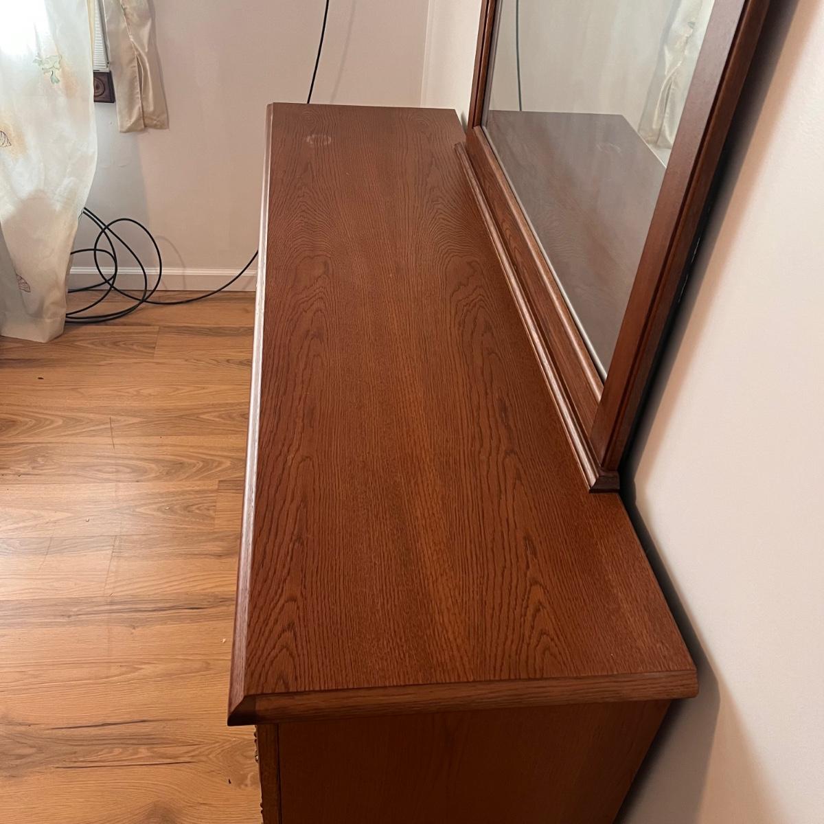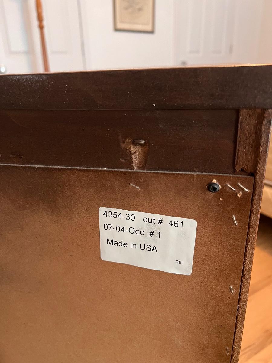 This Broyhill dresser has six drawers with a mirror attached to the top. The dresser measures at 63” x 18” x 36”H. The mirror measures at 41.5” x 41”H. In totality, this dresser and mirror are 77”H. There is one water mark on the top of the dresser - see picture included. Local pickup only. Winning bidder must bring assistance to help move and load this item due to its weight and/or size. Item is located on the second floor and will need to be moved down a flight of stairs. The mirror can be disassembled - see pictures of hardware included.