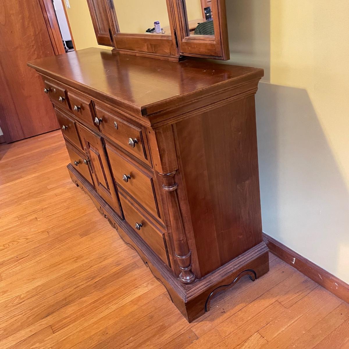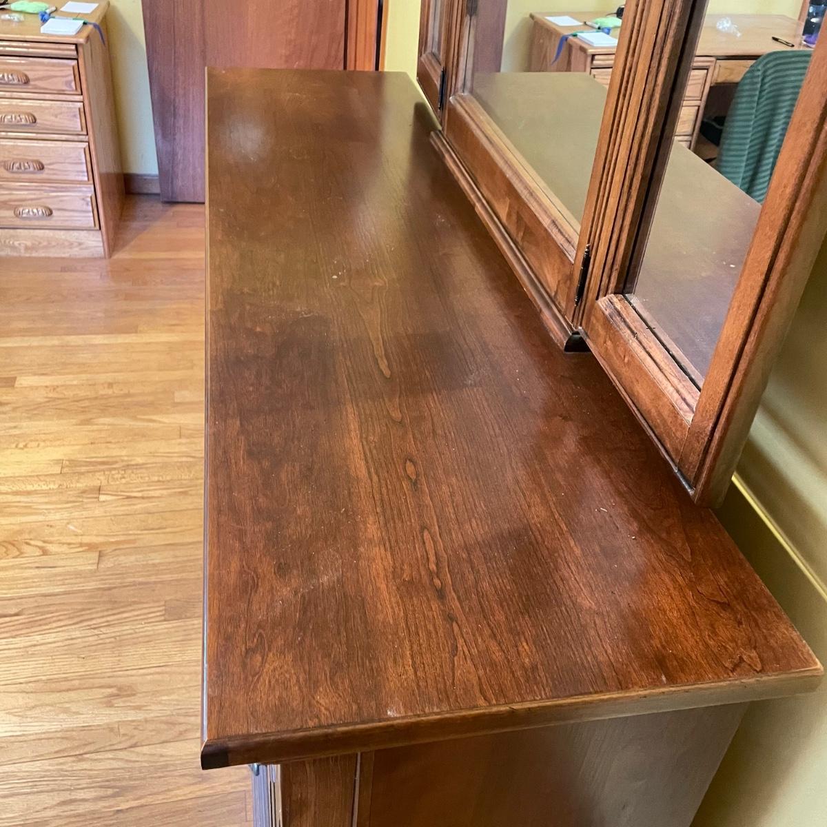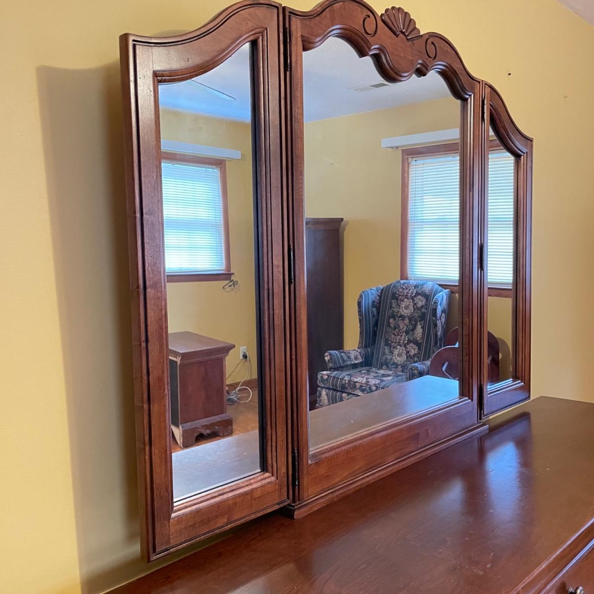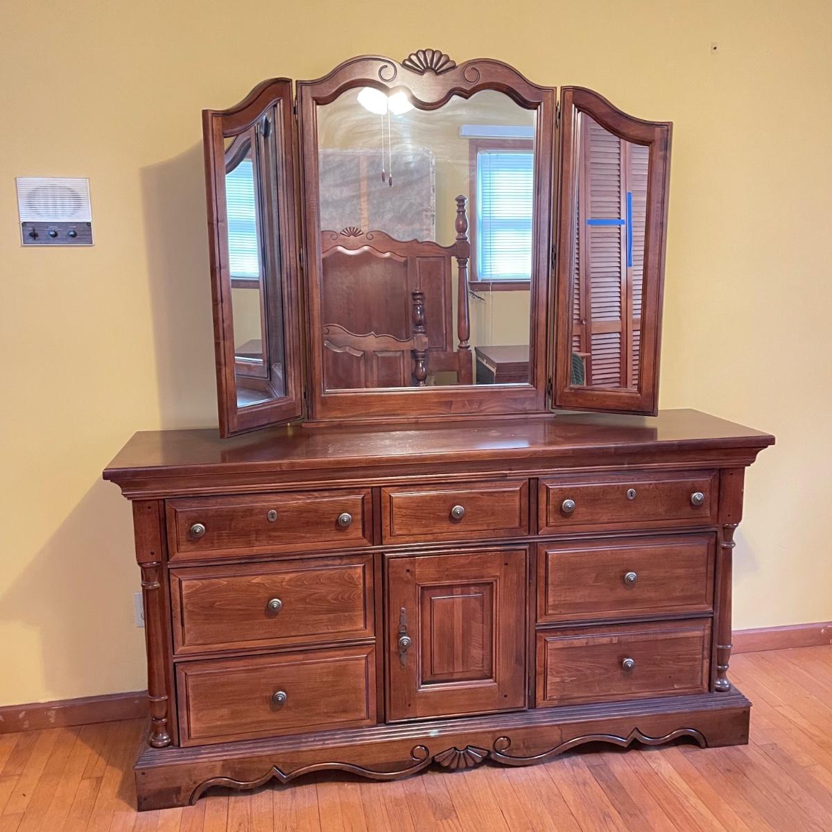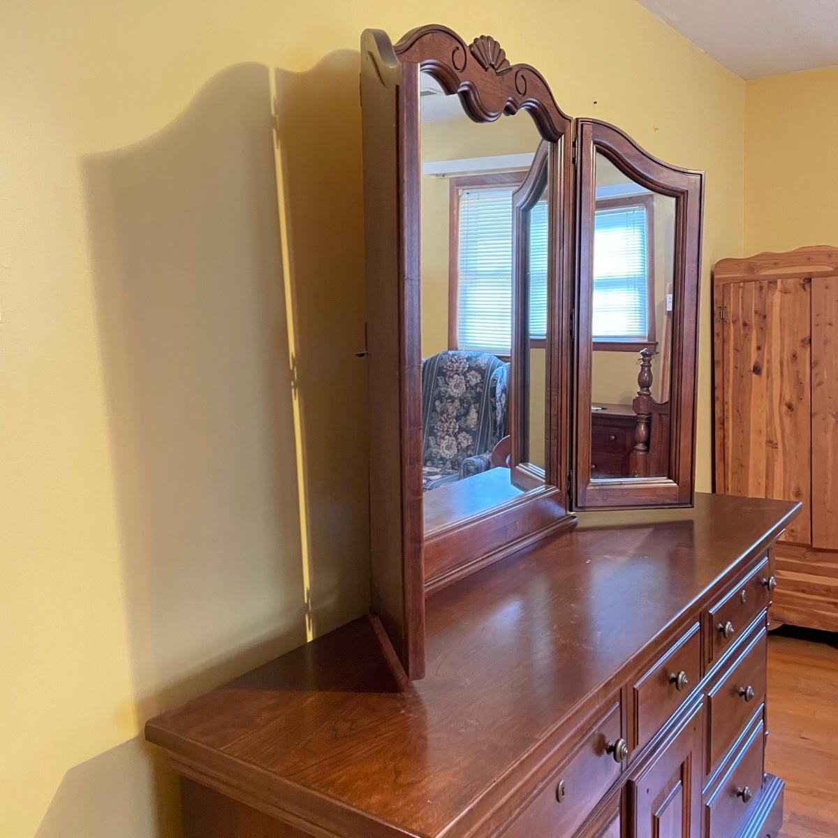 Broyhill nine drawer dresser with vanity mirror. Mirror may be removed for easy transport or style adjustment. Dresser matches a wardrobe lot and bed with bedside tables lot in this sale, the makings for a full bedroom suite. Mirror has angled wings, metal pulls, and faux key holes. Dresser without mirror measures 68.5” x 19” x 36”. Mirror fully extended measures 55” x 42”. Minor blemishes are shown in photos. Dresser was housed in a guest bedroom. Local pick up only. Winning bidder must bring assistance to help move and load this item due to its weight and/or size. There are only a couple steps located from front door to driveway.