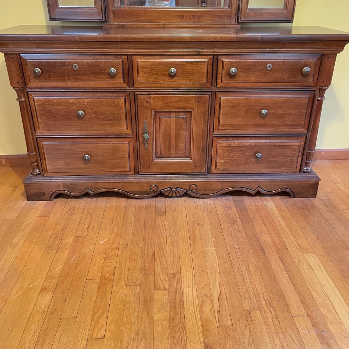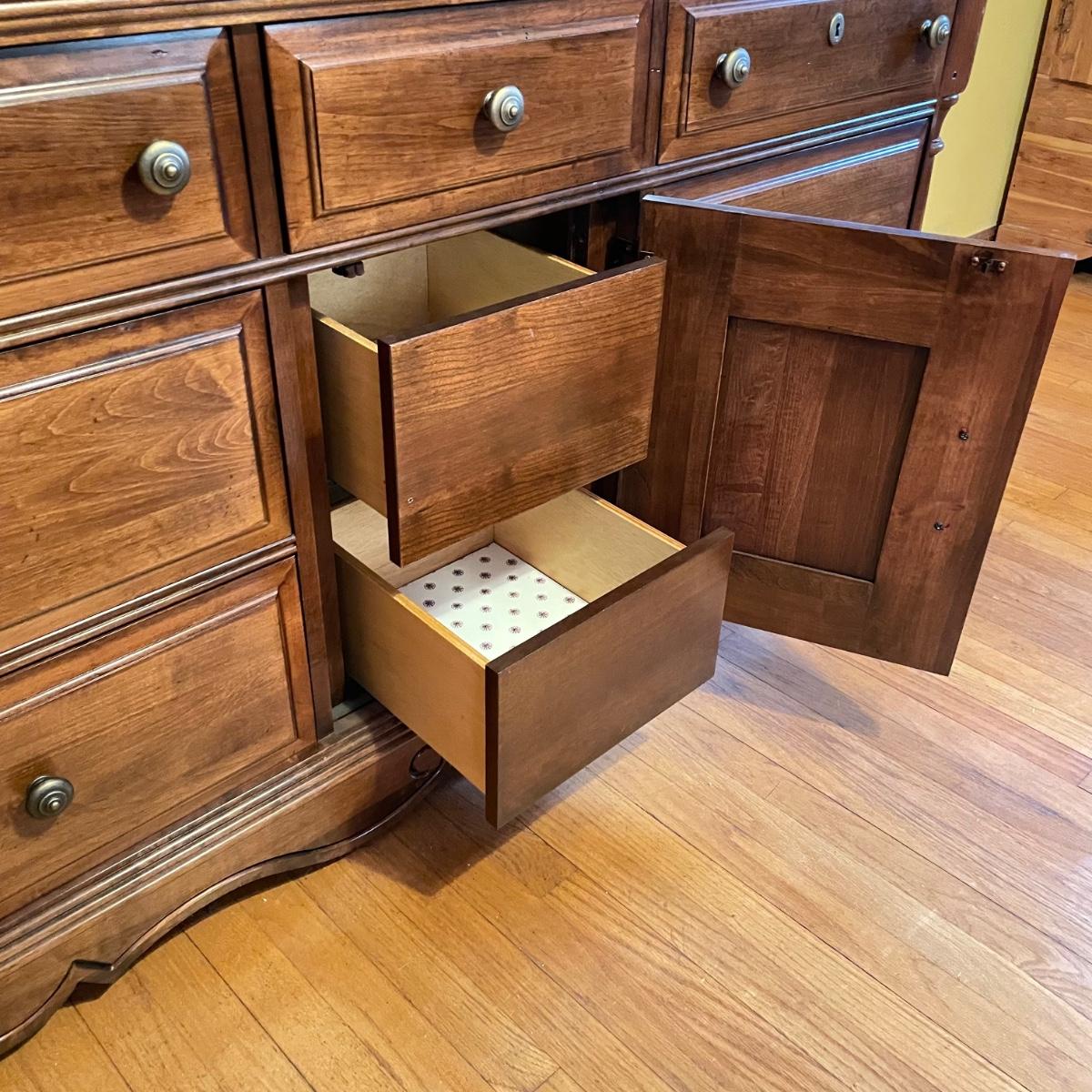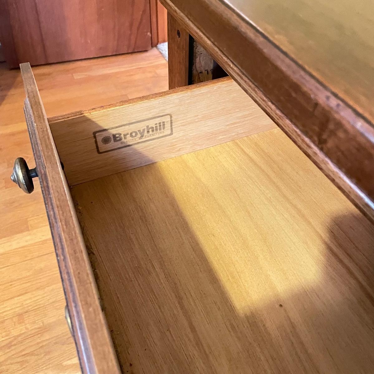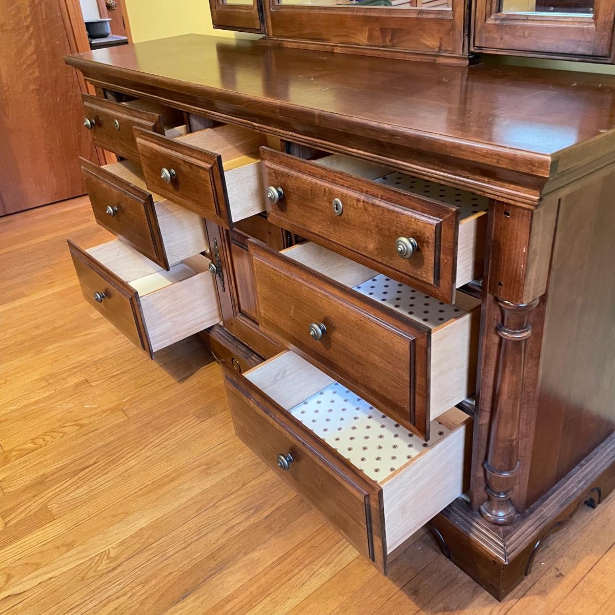 Broyhill nine drawer dresser with vanity mirror. Mirror may be removed for easy transport or style adjustment. Dresser matches a wardrobe lot and bed with bedside tables lot in this sale, the makings for a full bedroom suite. Mirror has angled wings, metal pulls, and faux key holes. Dresser without mirror measures 68.5” x 19” x 36”. Mirror fully extended measures 55” x 42”. Minor blemishes are shown in photos. Dresser was housed in a guest bedroom. Local pick up only. Winning bidder must bring assistance to help move and load this item due to its weight and/or size. There are only a couple steps located from front door to driveway.