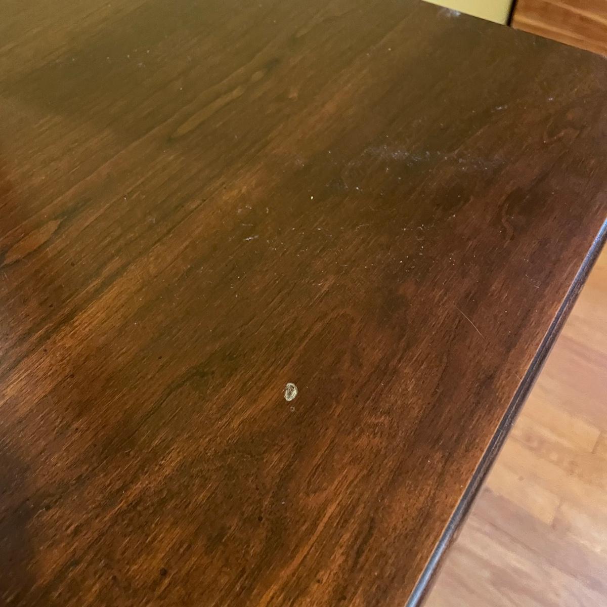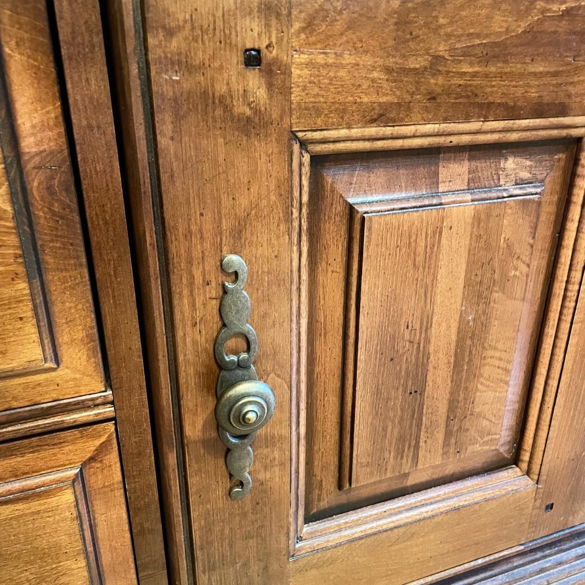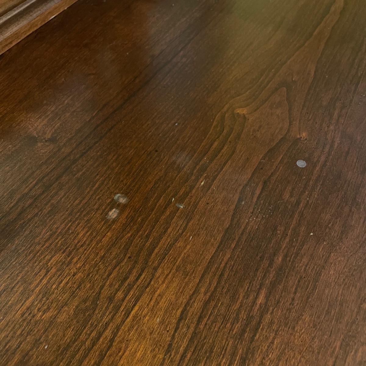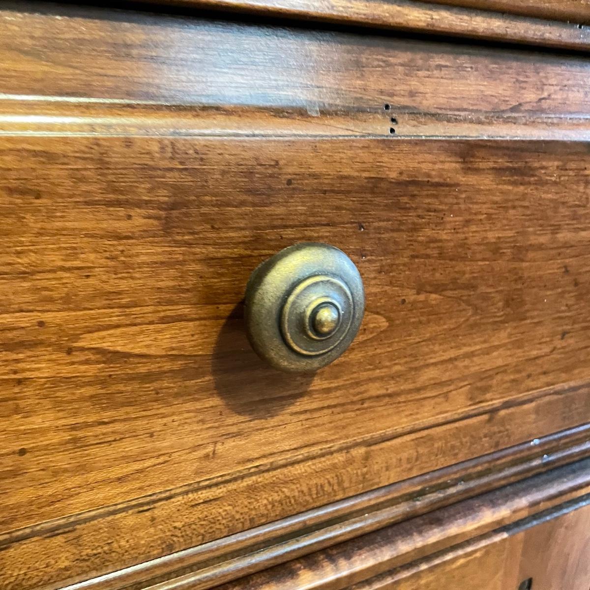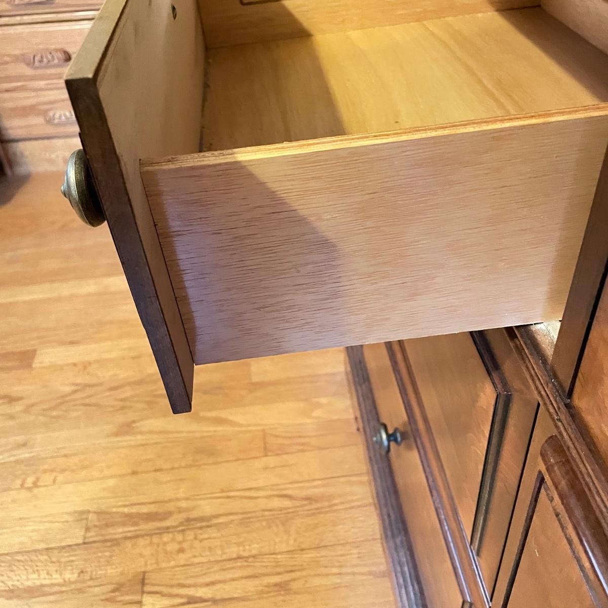 Broyhill nine drawer dresser with vanity mirror. Mirror may be removed for easy transport or style adjustment. Dresser matches a wardrobe lot and bed with bedside tables lot in this sale, the makings for a full bedroom suite. Mirror has angled wings, metal pulls, and faux key holes. Dresser without mirror measures 68.5” x 19” x 36”. Mirror fully extended measures 55” x 42”. Minor blemishes are shown in photos. Dresser was housed in a guest bedroom. Local pick up only. Winning bidder must bring assistance to help move and load this item due to its weight and/or size. There are only a couple steps located from front door to driveway.