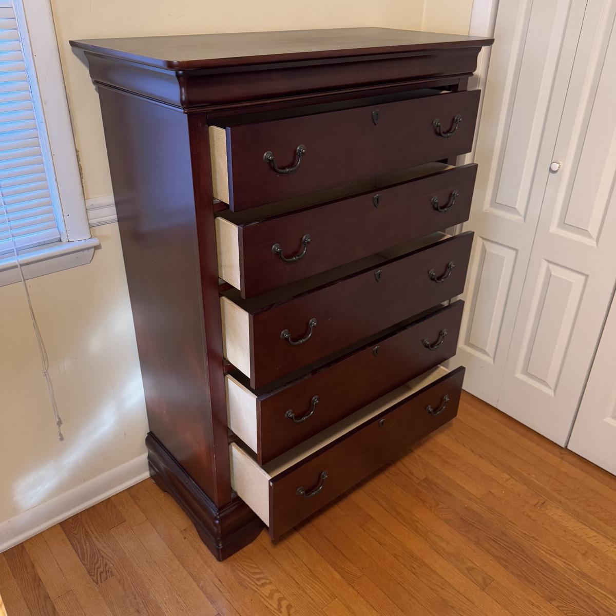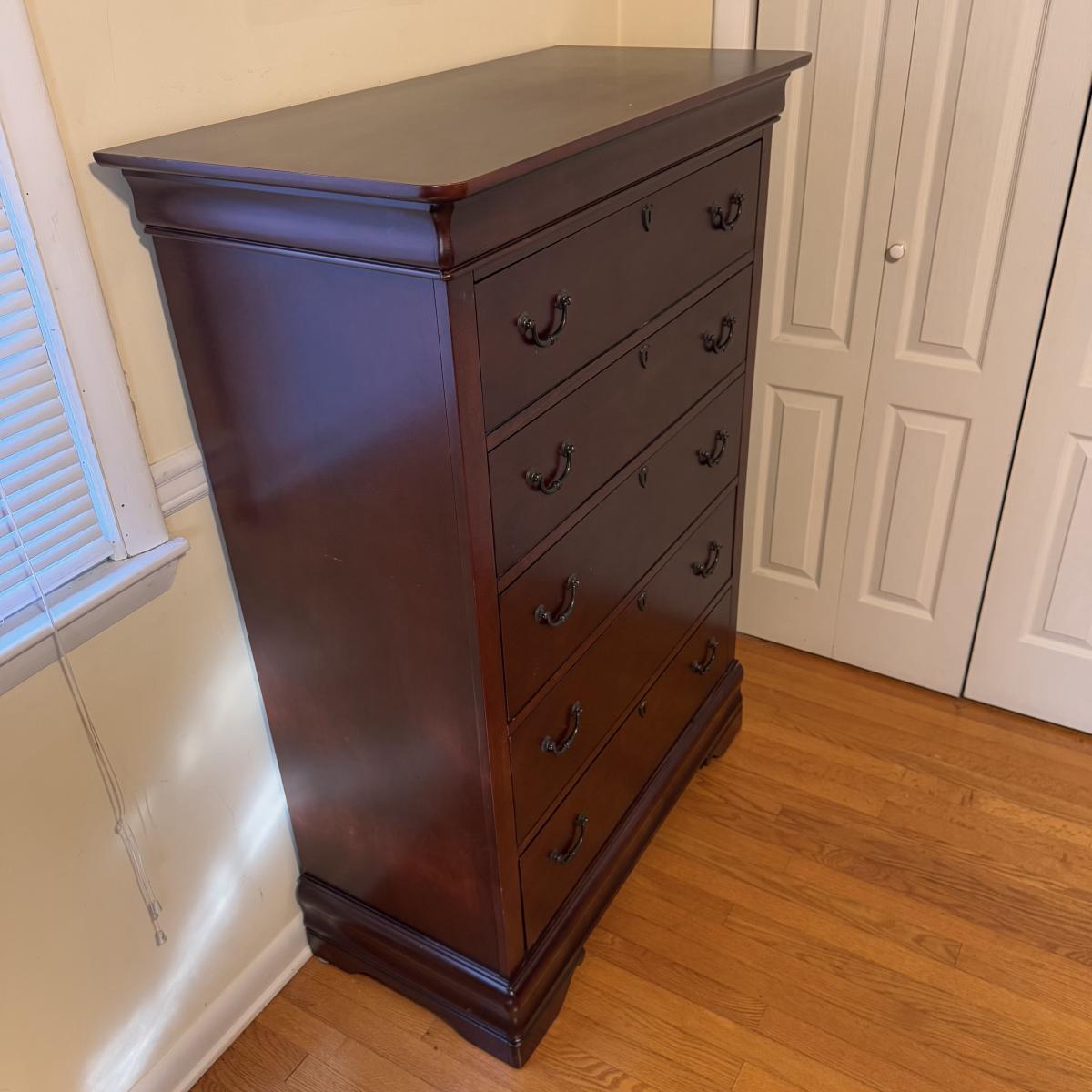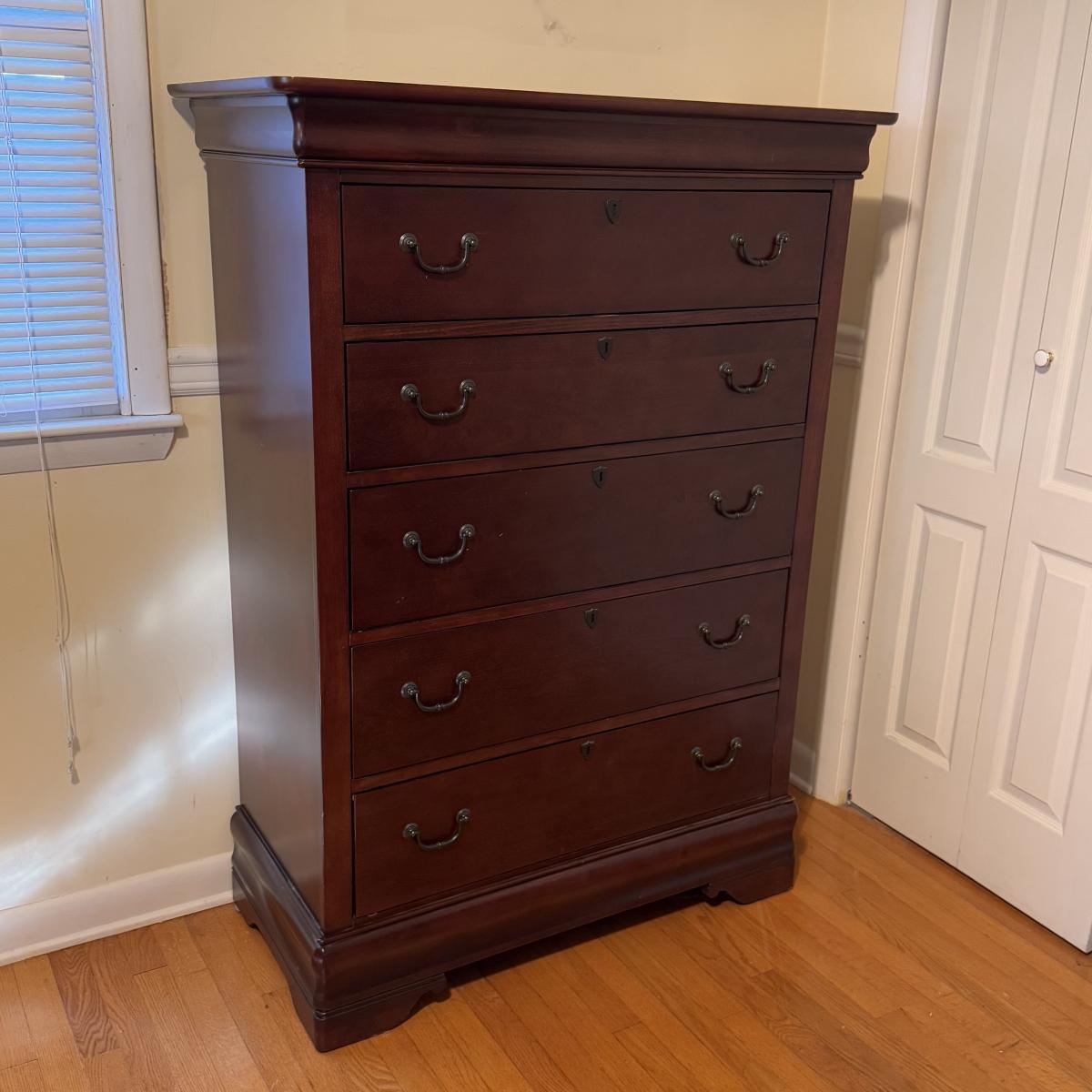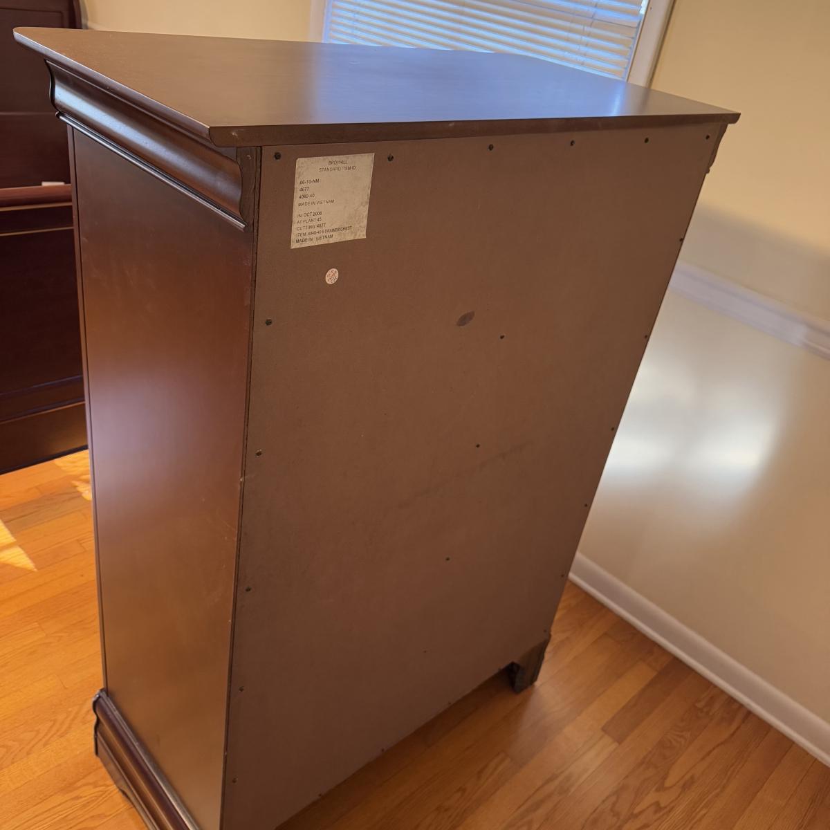 Lot includes one solid wood Broyhill dresser with five drawers. The drawers are made of wood and have metal handles. The dresser measures 40” x 19” x 55”H. Local pickup only. Winning bidder must bring assistance to help move and load this item due to its weight and/or size.