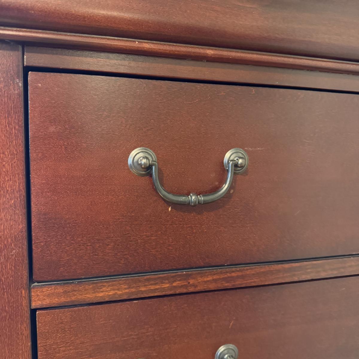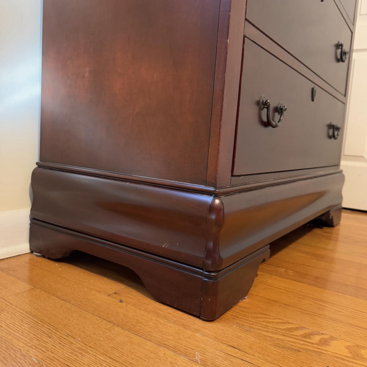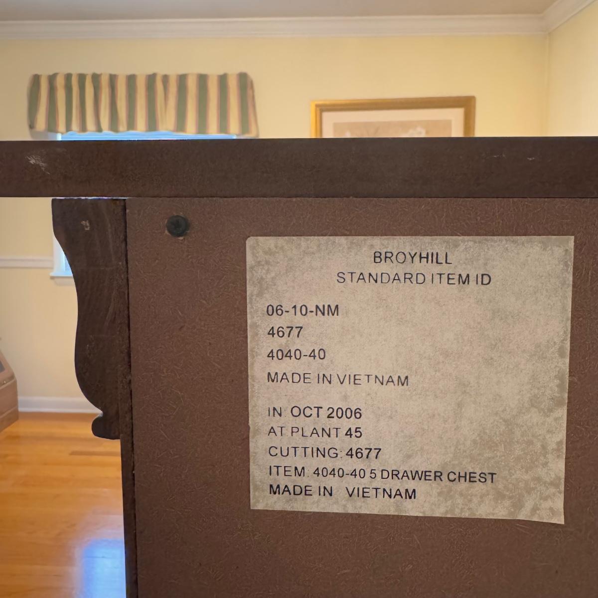Lot includes one solid wood Broyhill dresser with five drawers. The drawers are made of wood and have metal handles. The dresser measures 40” x 19” x 55”H. Local pickup only. Winning bidder must bring assistance to help move and load this item due to its weight and/or size.