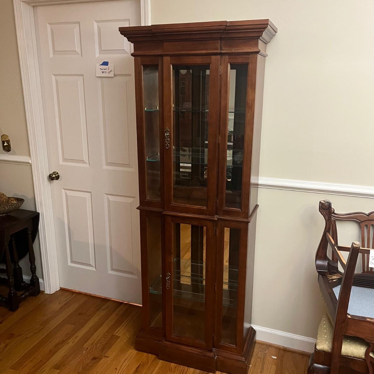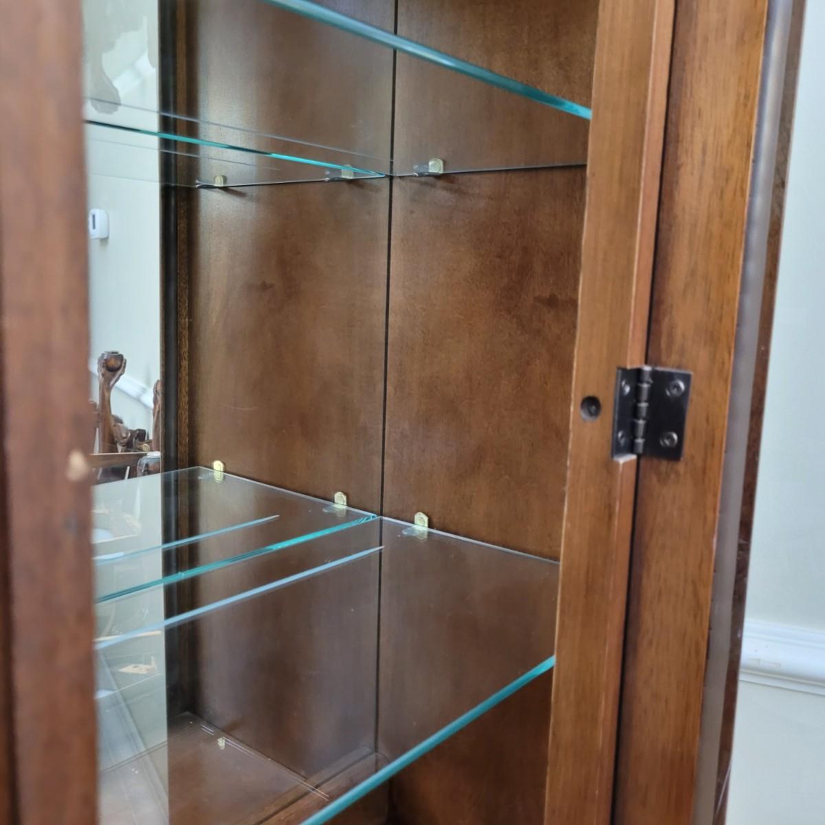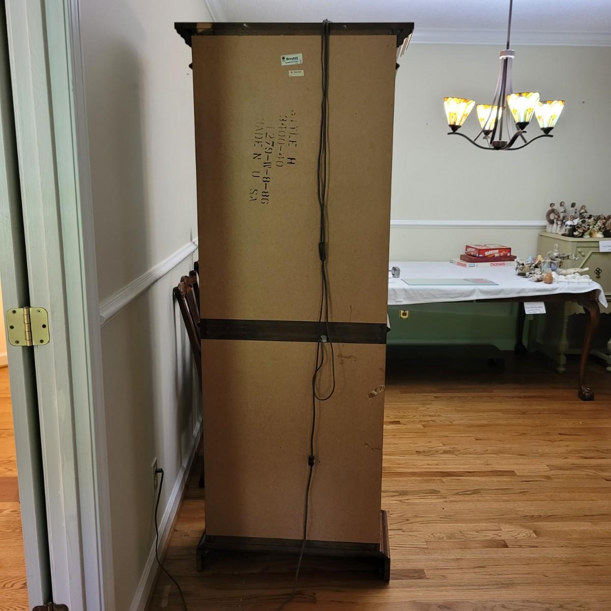 This curio cabinet by Broyhill has mirrored back walls and four glass shelves with etched lines for display support. Note that a set of pegs are missing for one shelf. Light bulb does not light when tested (bulb likely needs to be replaced). Measures approximately 25" x 13.5" x 72"H. Local pickup only. Winning bidder must bring assistance to help move and load this item due to its weight and size.