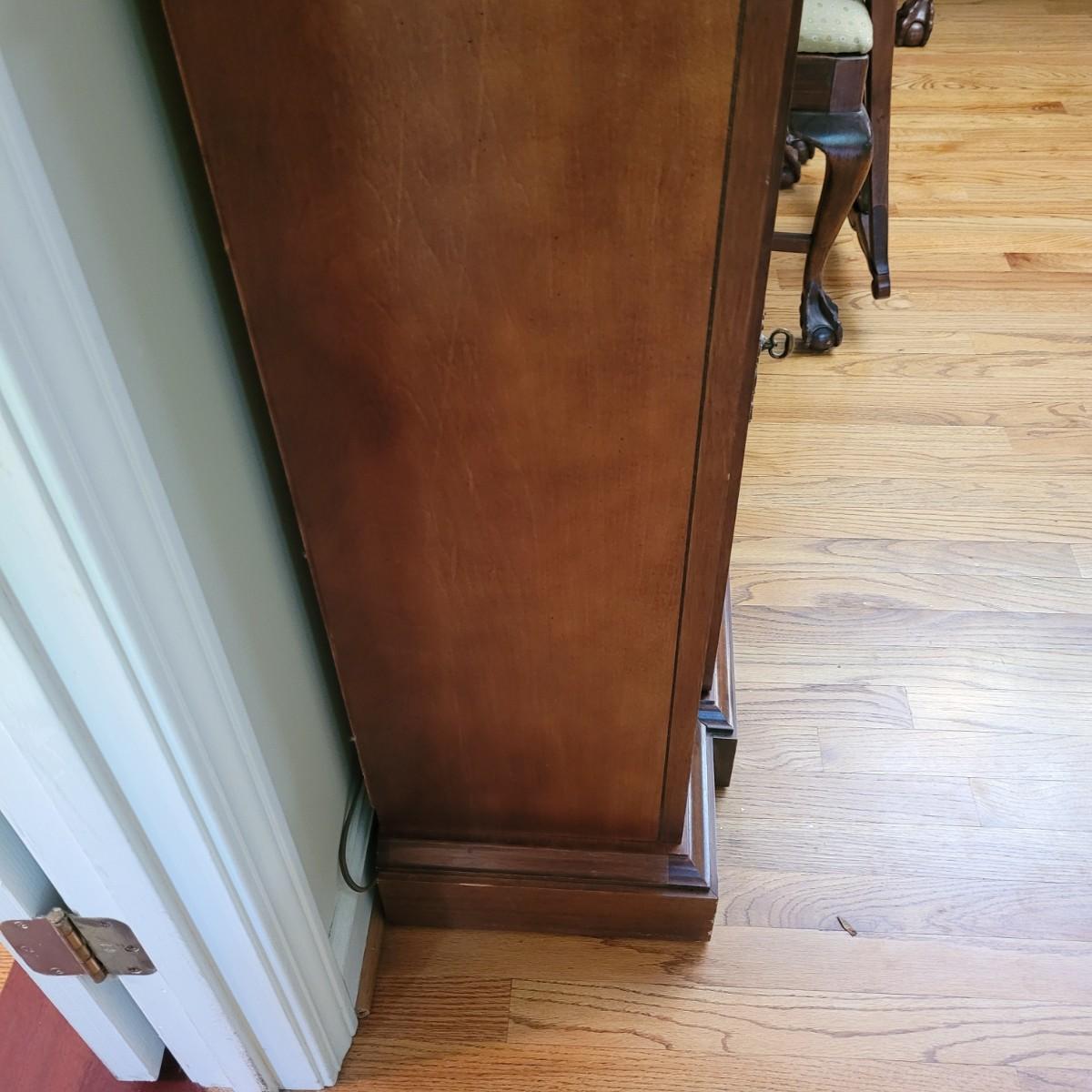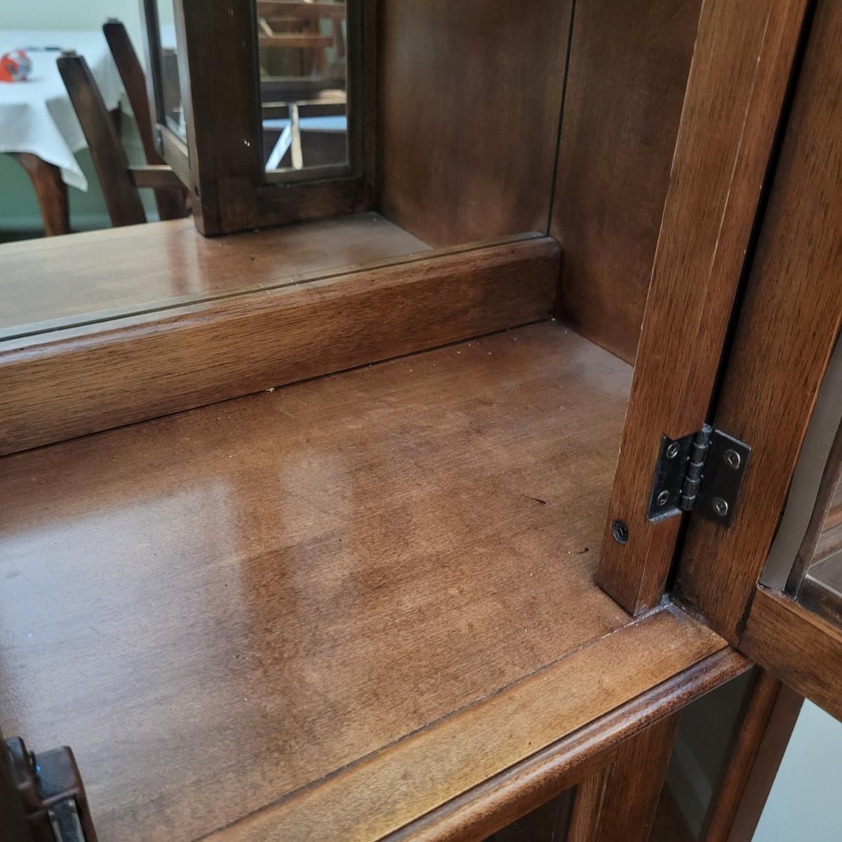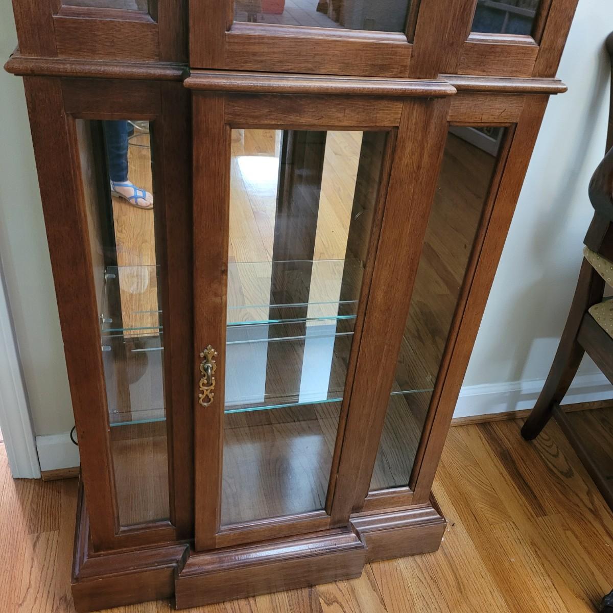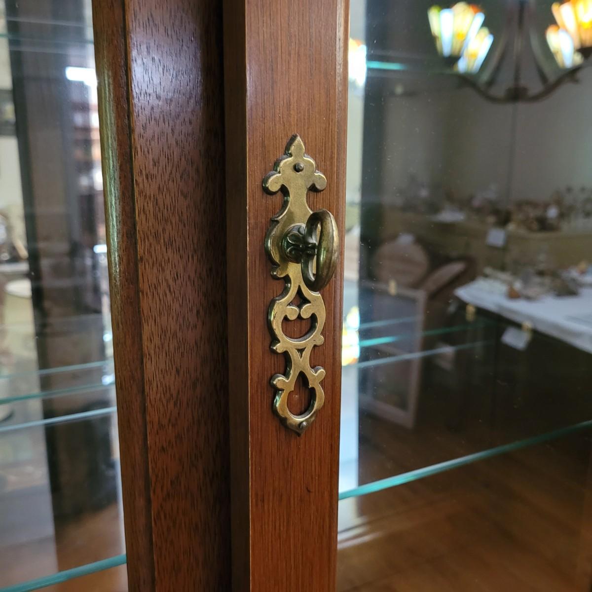 This curio cabinet by Broyhill has mirrored back walls and four glass shelves with etched lines for display support. Note that a set of pegs are missing for one shelf. Light bulb does not light when tested (bulb likely needs to be replaced). Measures approximately 25" x 13.5" x 72"H. Local pickup only. Winning bidder must bring assistance to help move and load this item due to its weight and size.