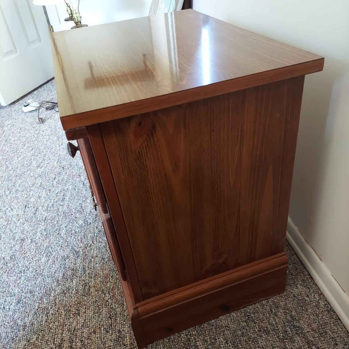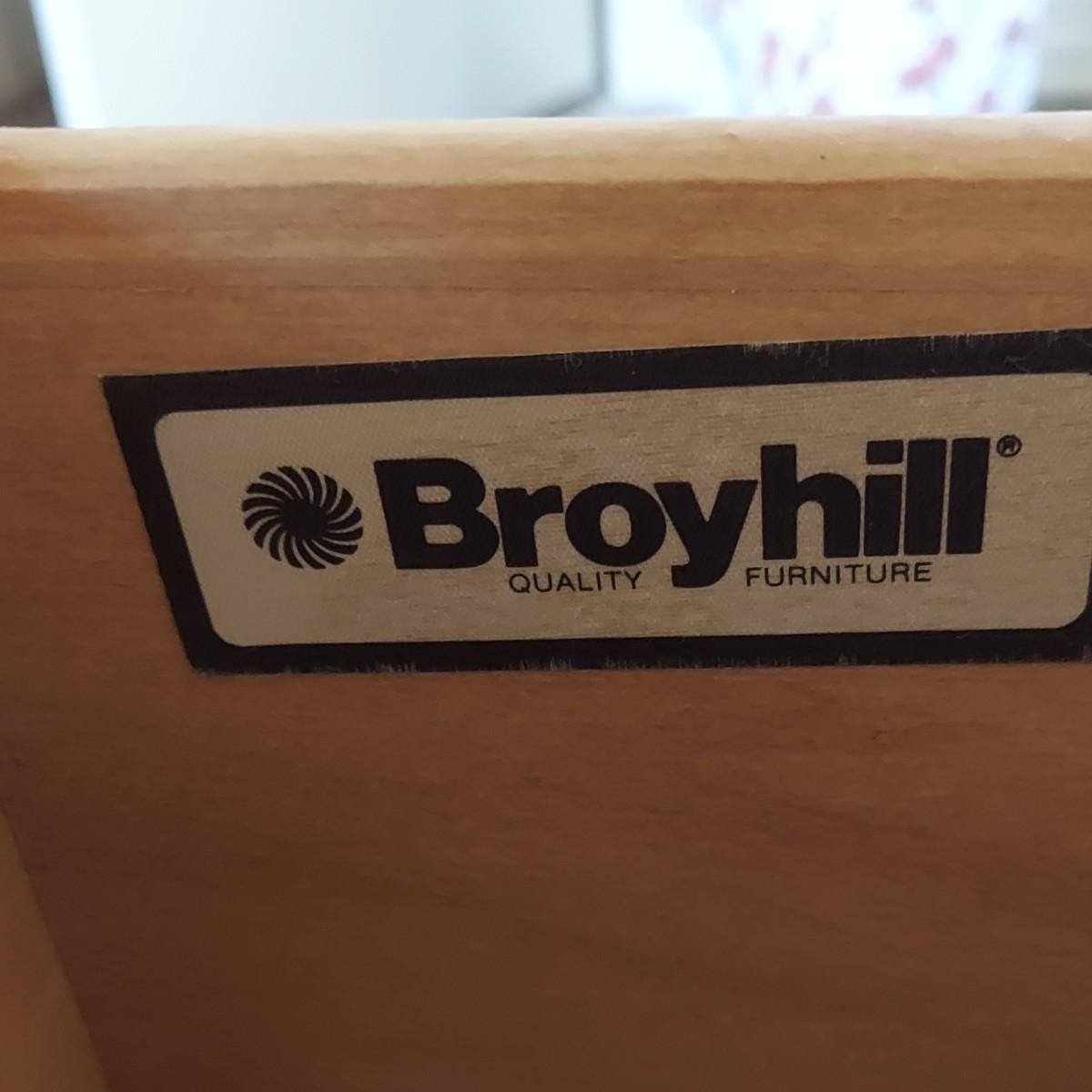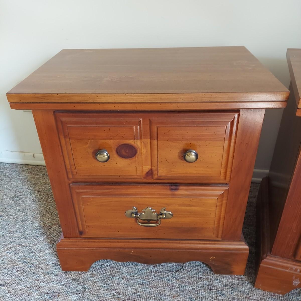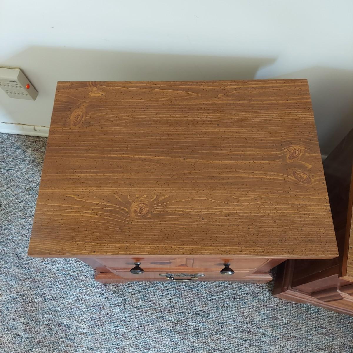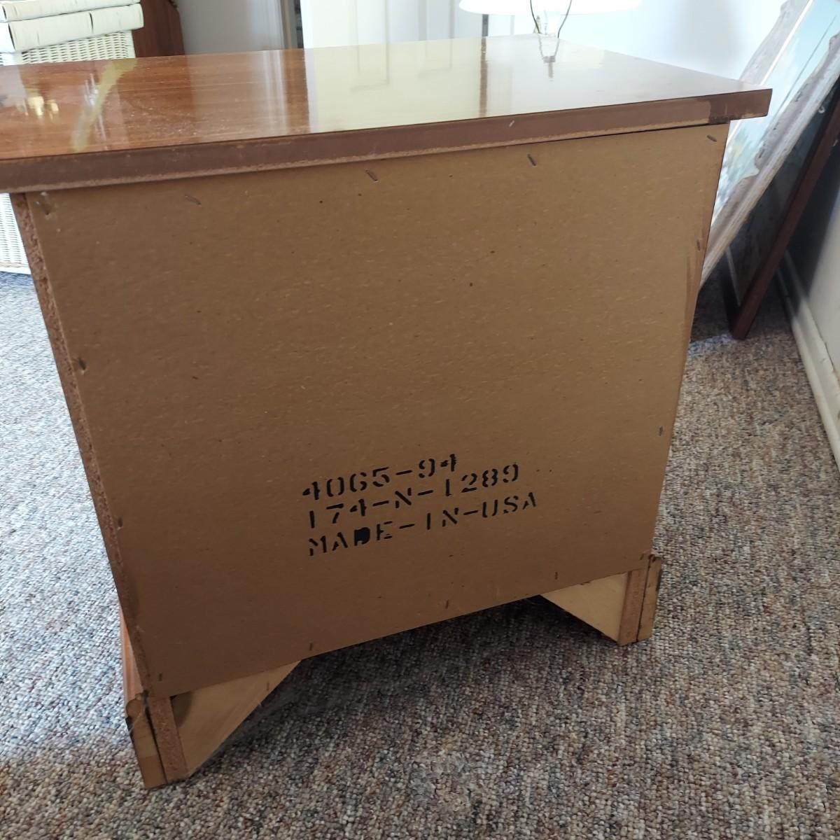 Two wooden Broyhill nightstands with two drawers. They appear to be made from a mix of real wood with an engineered wood top that has a faux walnut veneer. They measure 22" x 15" x 22.5H. Local Pickup Only