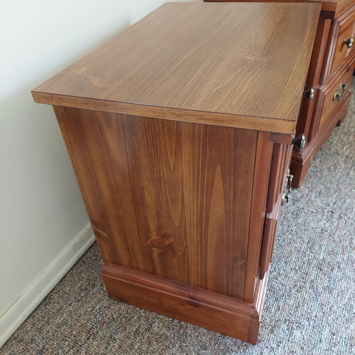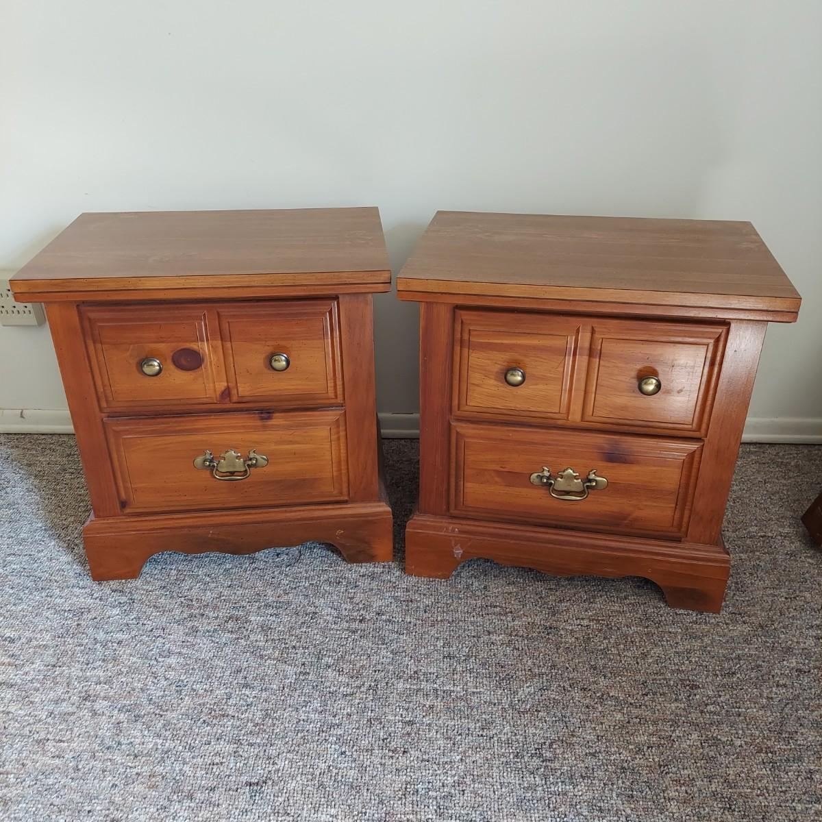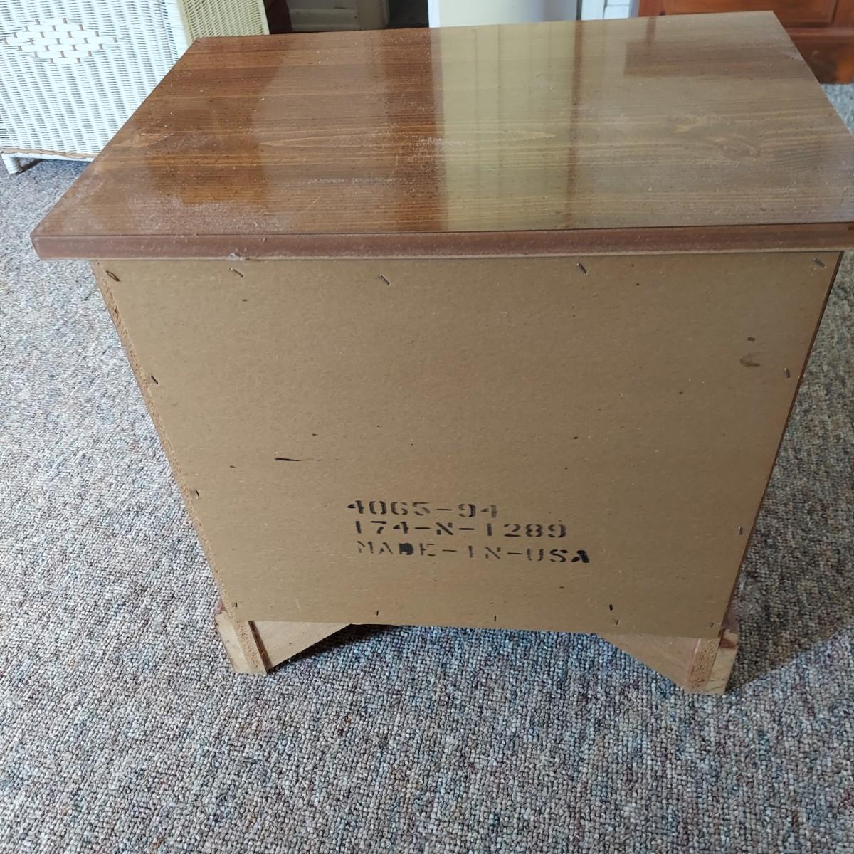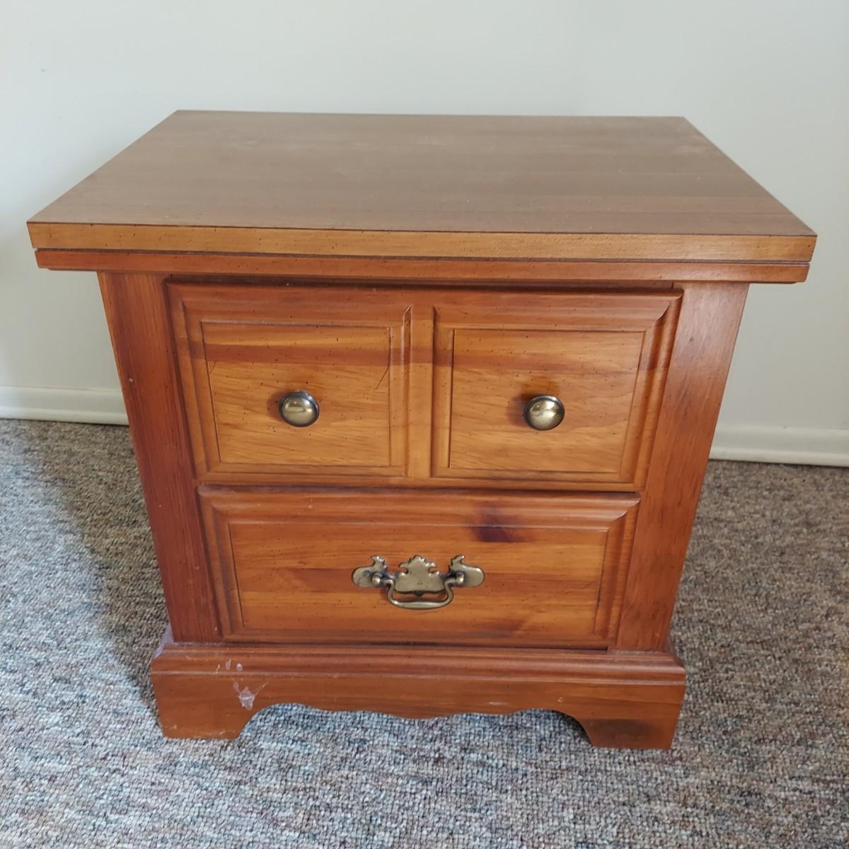 Two wooden Broyhill nightstands with two drawers. They appear to be made from a mix of real wood with an engineered wood top that has a faux walnut veneer. They measure 22" x 15" x 22.5H. Local Pickup Only