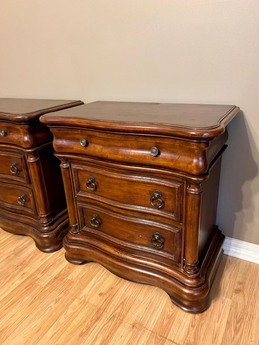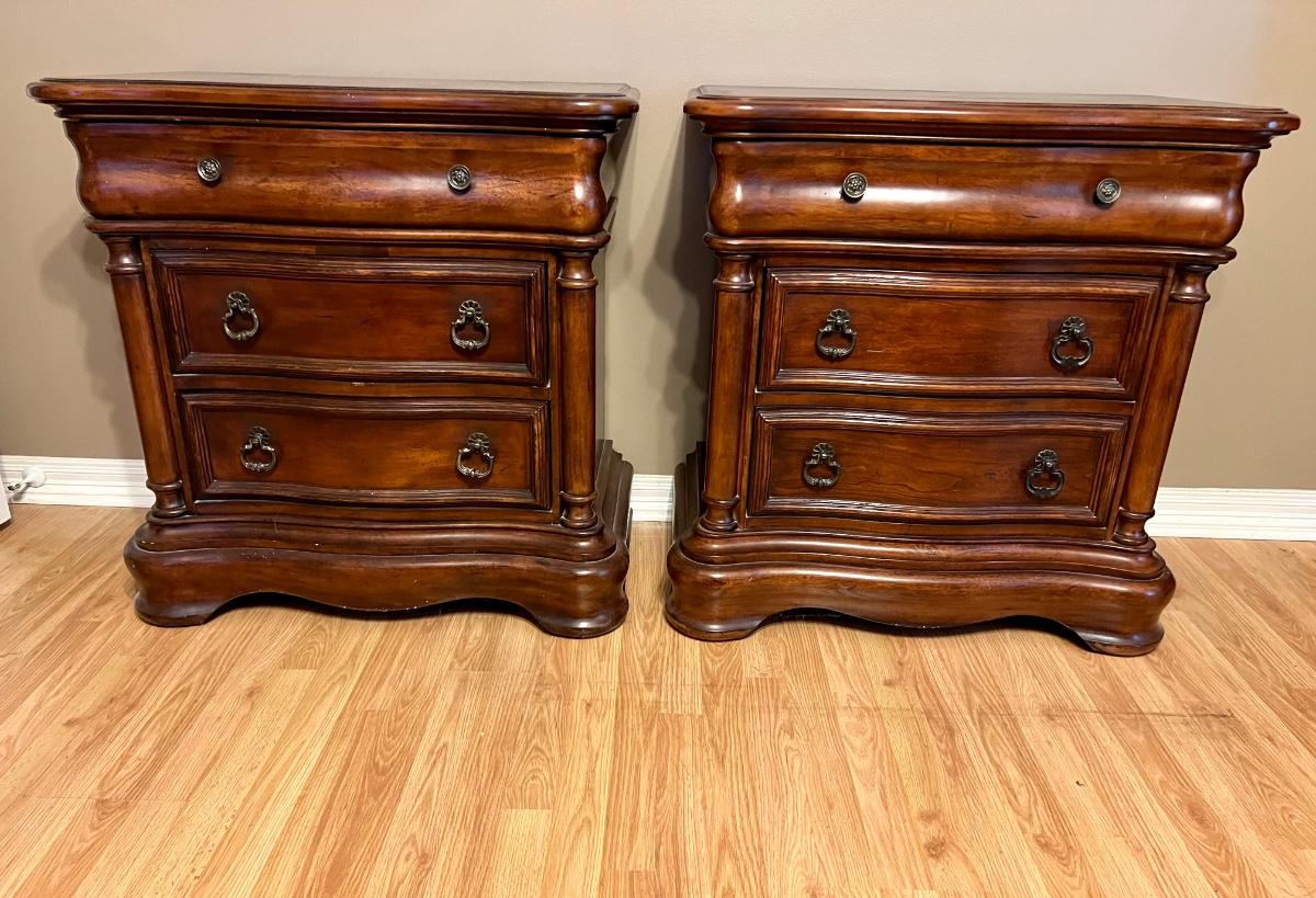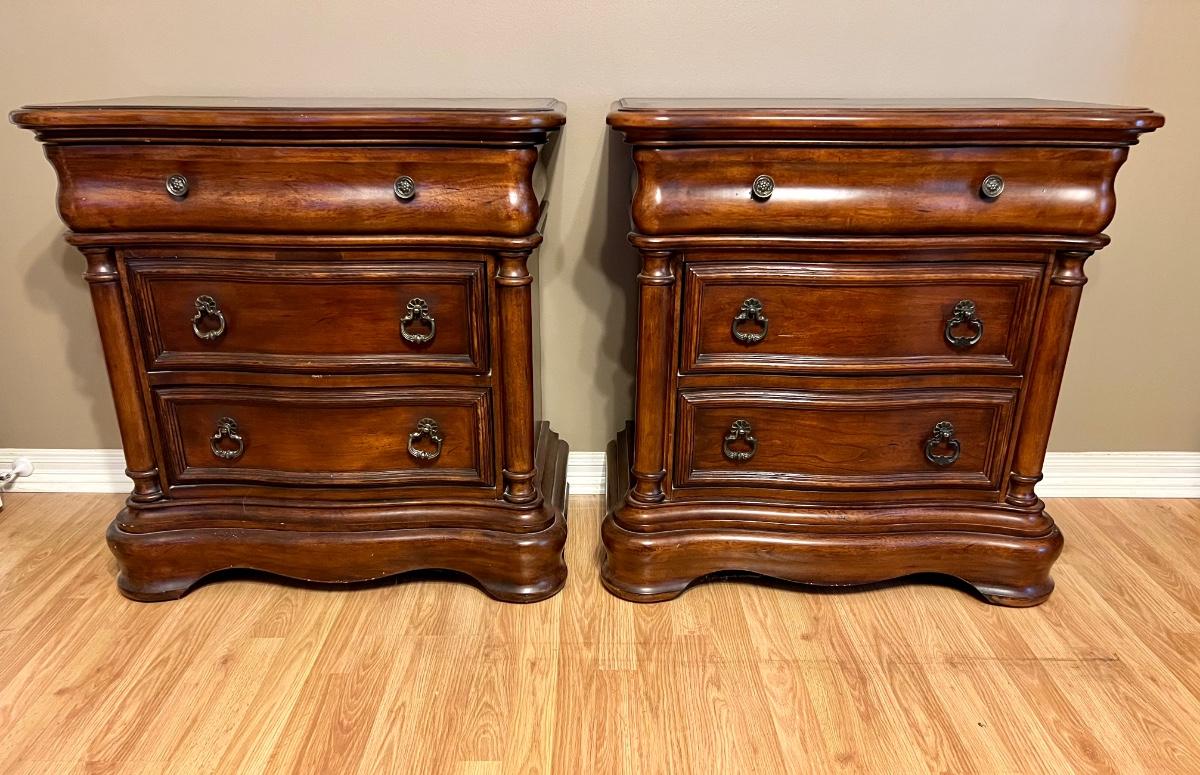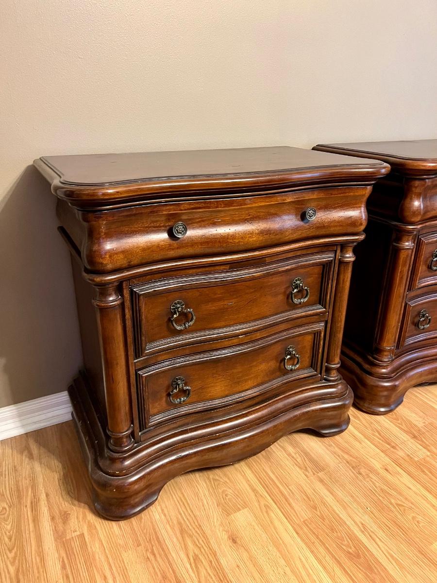 Pair of BROYHILL Three Drawer Nightstands. These are heavy! Measures 33 inches tall, 32 inches wide and 18 inches deep. One night has some signs of use on the back corner. See pictures. Same night stands, middle drawer opens and closes but seems as though it’s off track on one side but closes flush. Some knicks on one of the sides, see pictures.