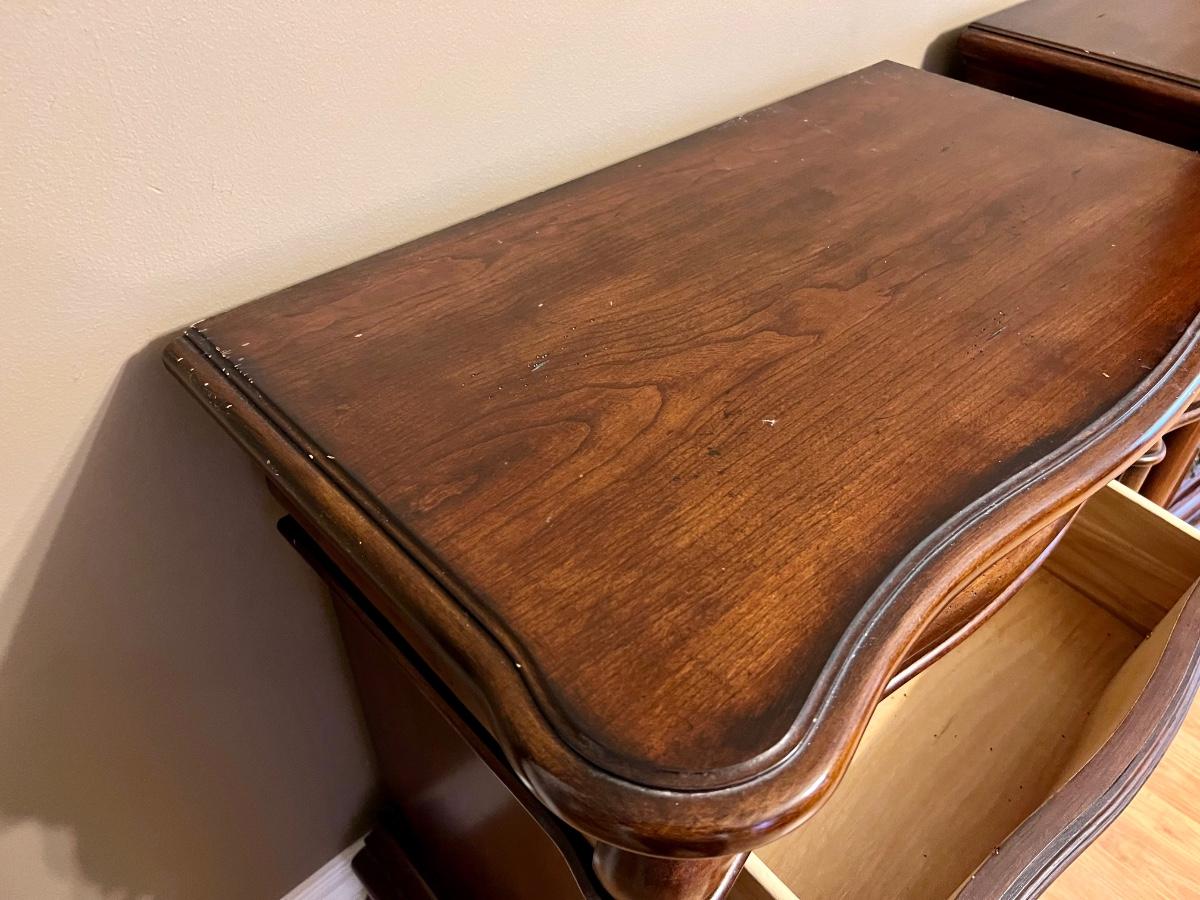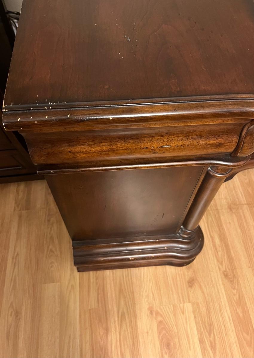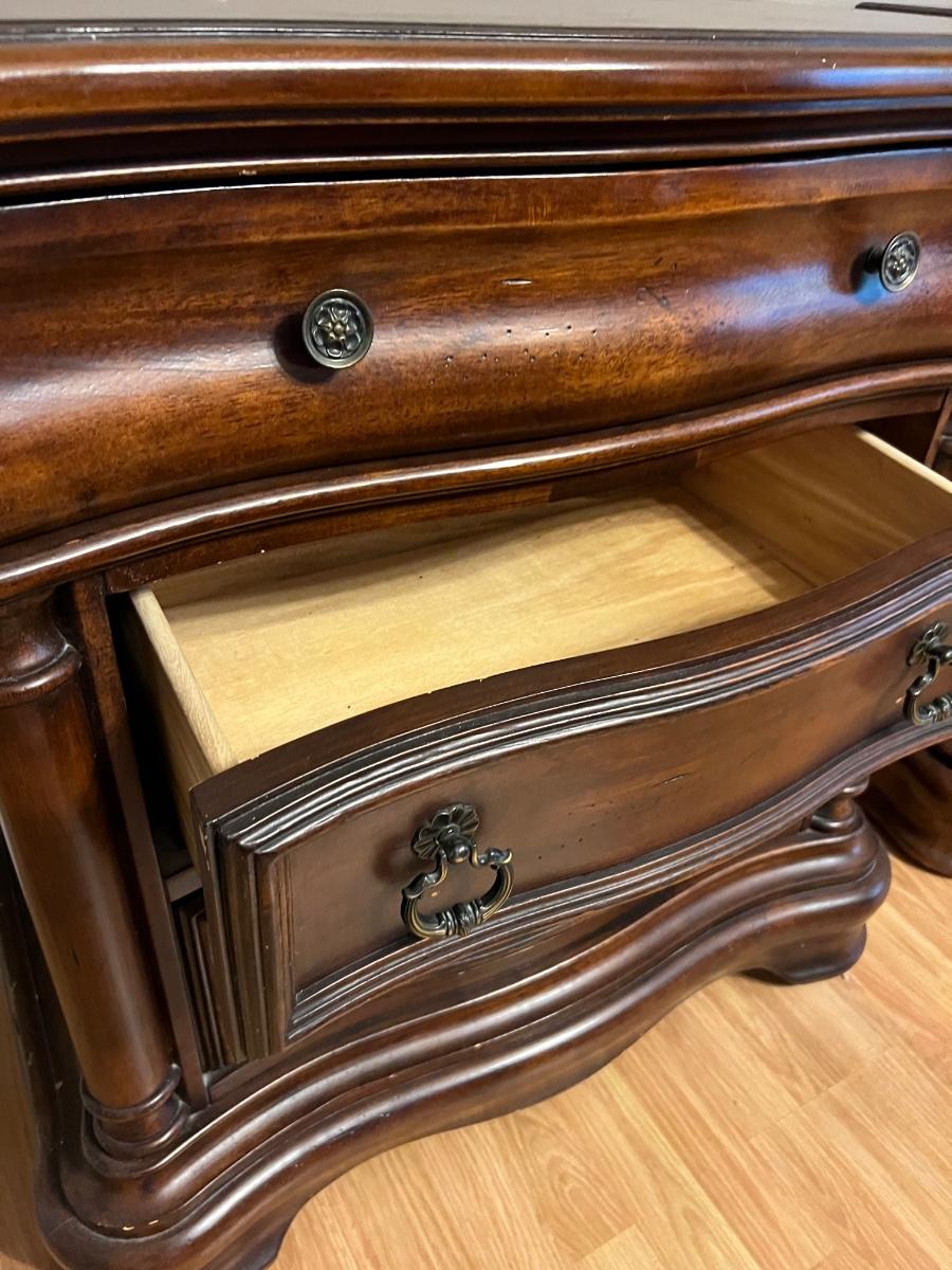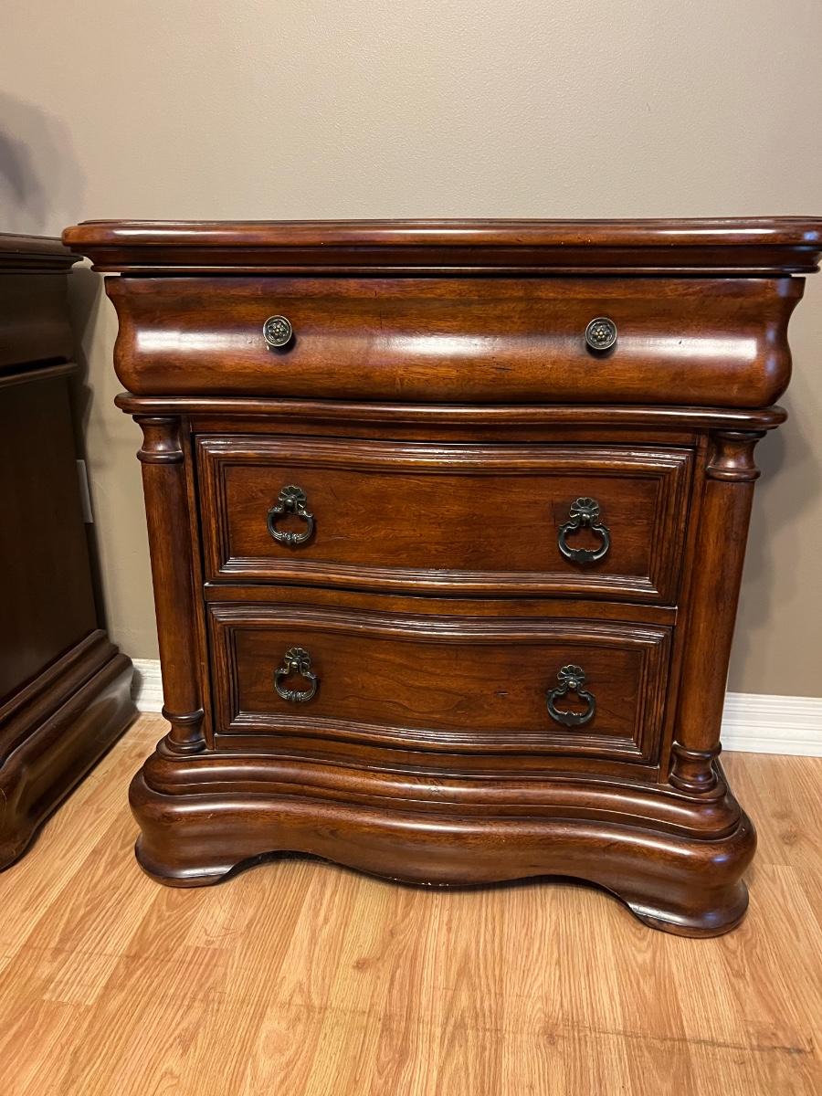Pair of BROYHILL Three Drawer Nightstands. These are heavy! Measures 33 inches tall, 32 inches wide and 18 inches deep. One night has some signs of use on the back corner. See pictures. Same night stands, middle drawer opens and closes but seems as though it’s off track on one side but closes flush. Some knicks on one of the sides, see pictures.