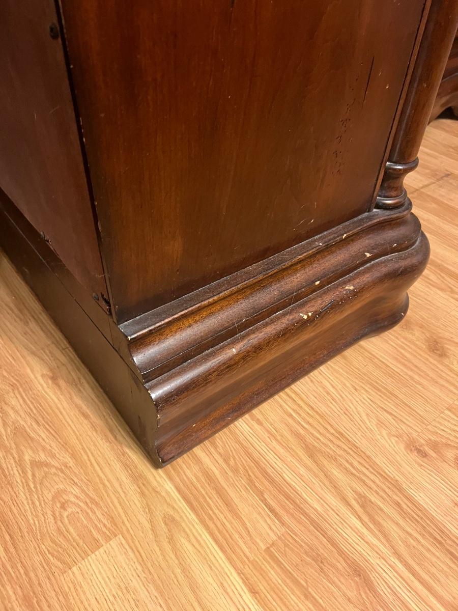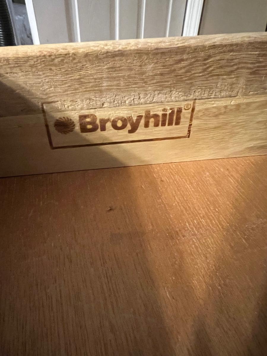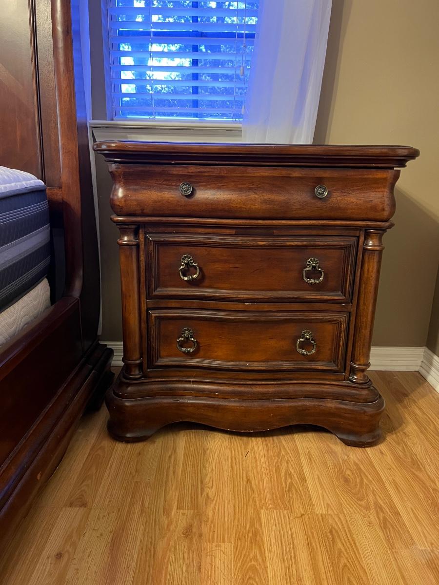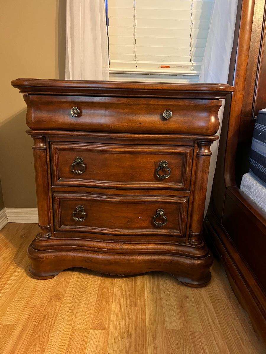 Pair of BROYHILL Three Drawer Nightstands. These are heavy! Measures 33 inches tall, 32 inches wide and 18 inches deep. One night has some signs of use on the back corner. See pictures. Same night stands, middle drawer opens and closes but seems as though it’s off track on one side but closes flush. Some knicks on one of the sides, see pictures.