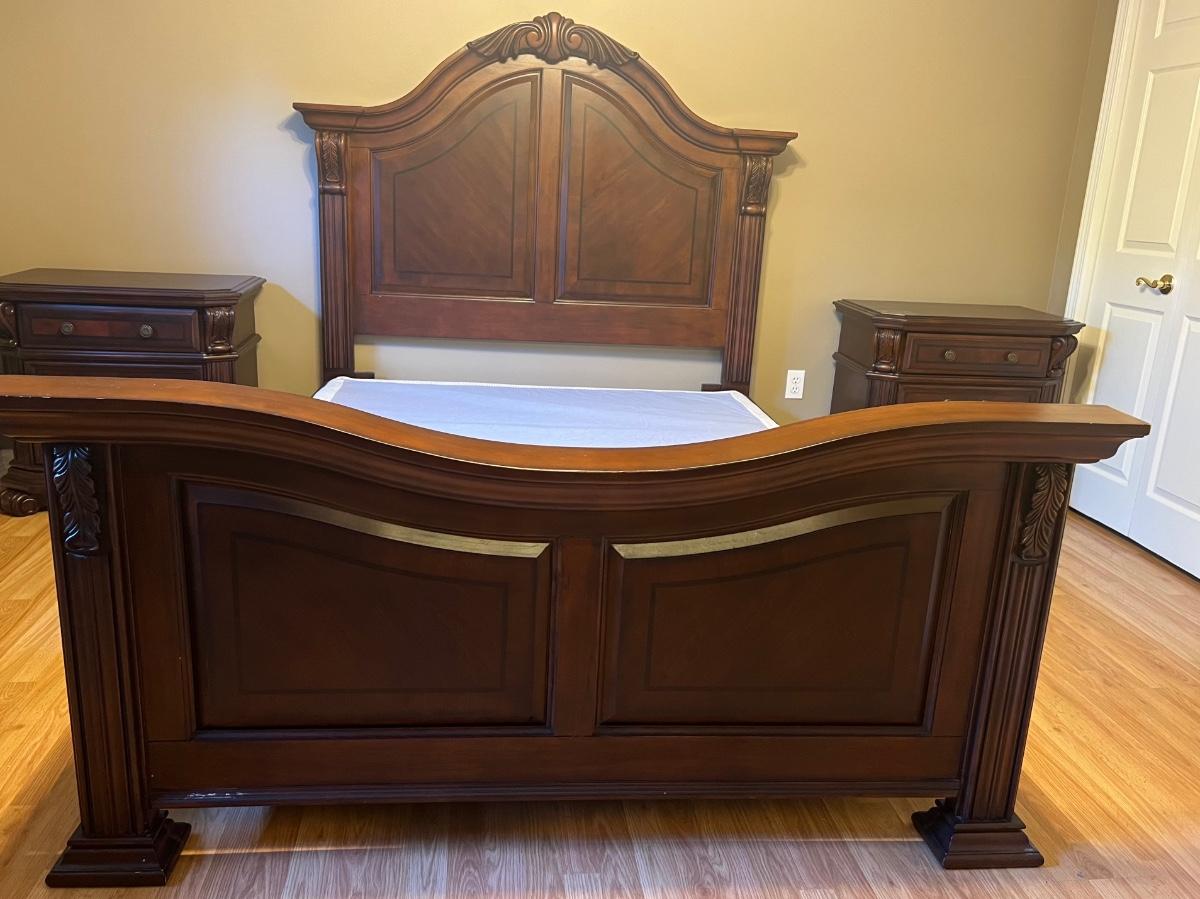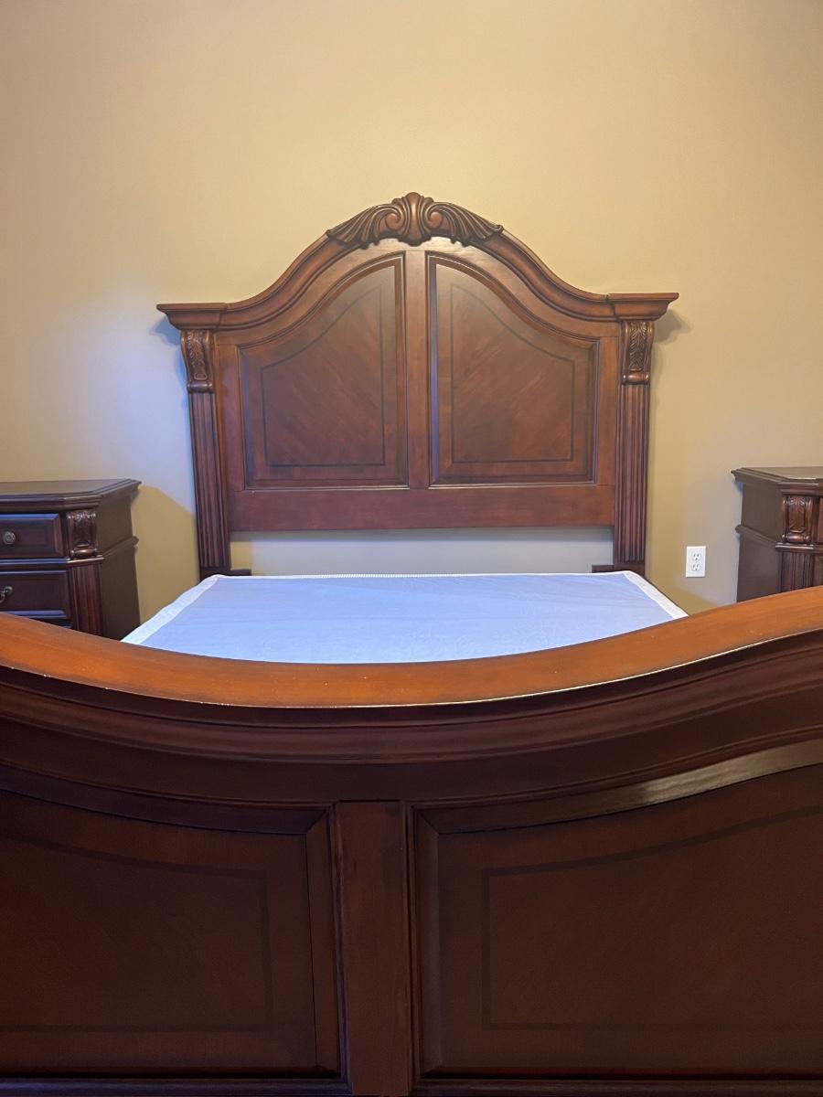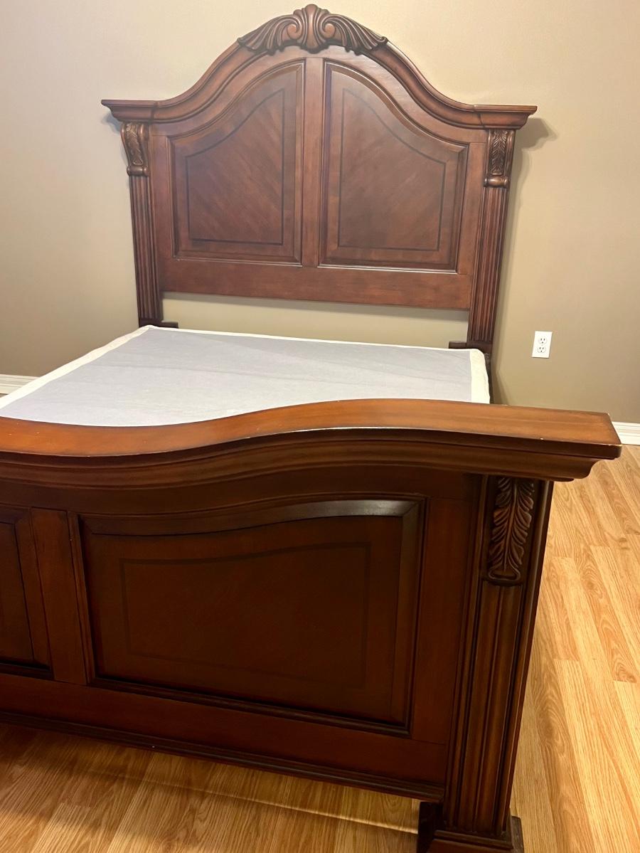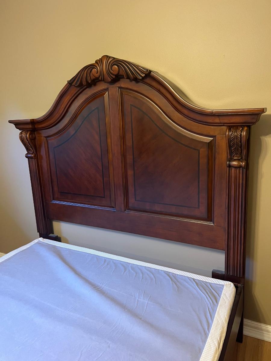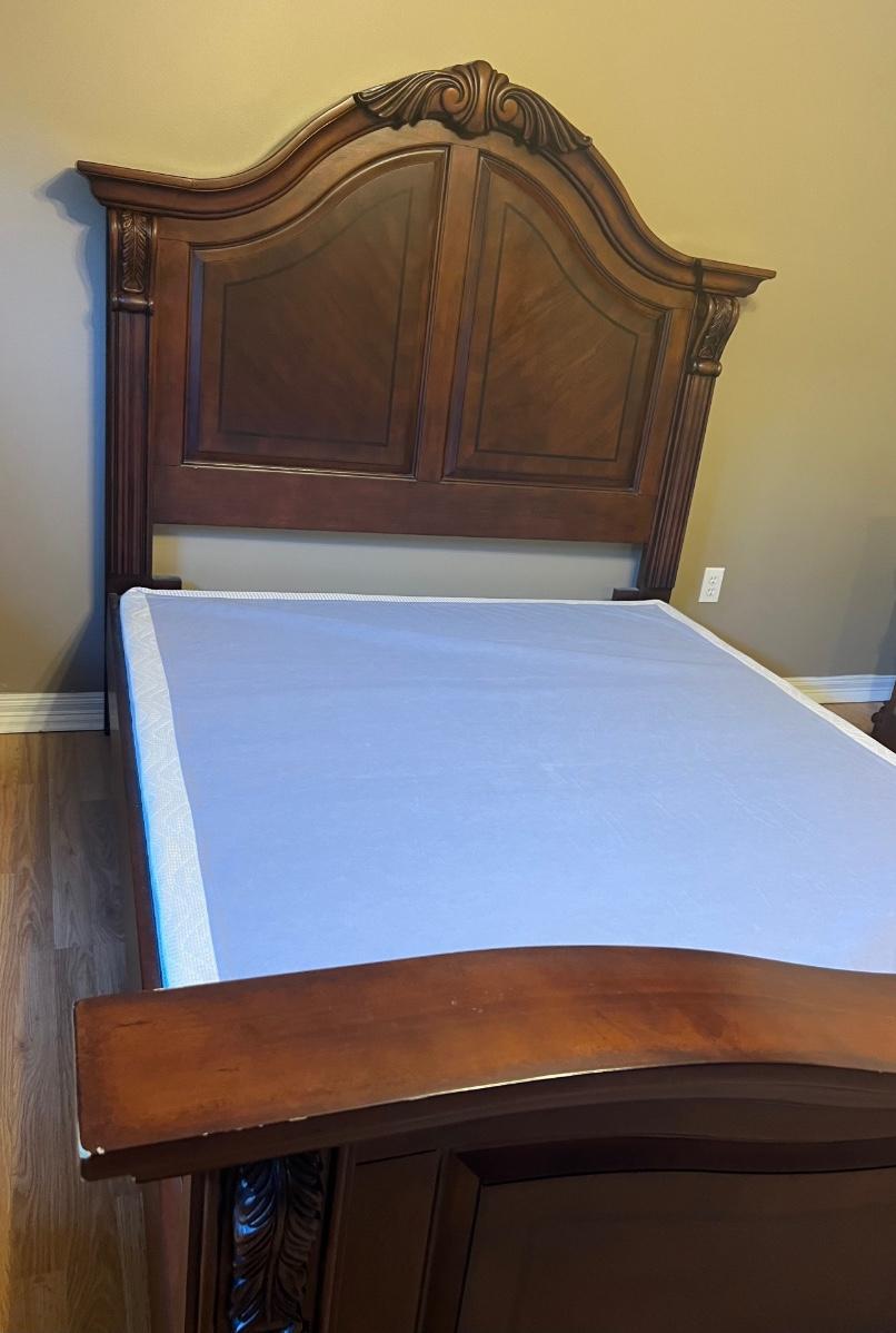 BROYHILL QUEEN SIZE SLEIGH BED & BOXSPRING. Headboard Measures 54 inches tall. Boxspring included but can be left behind if winning bid chooses.