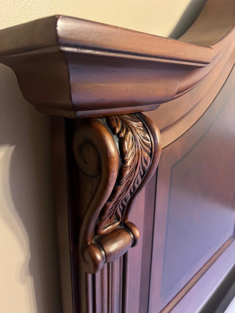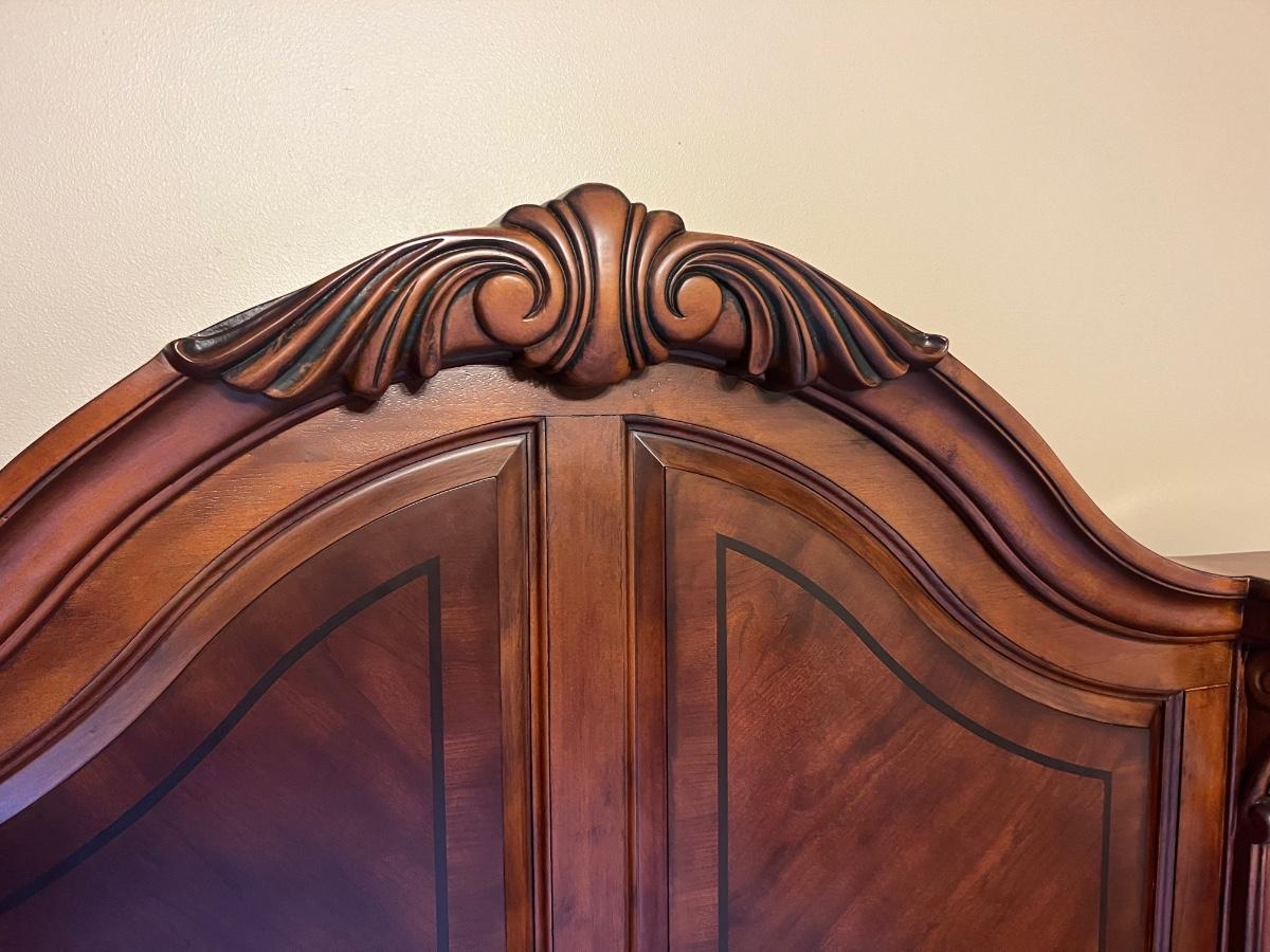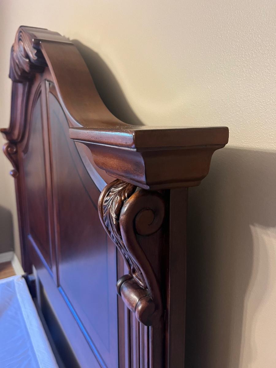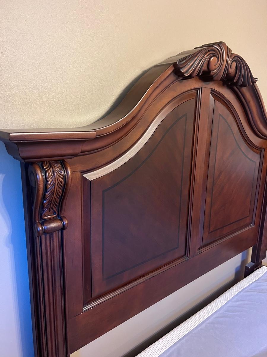 BROYHILL QUEEN SIZE SLEIGH BED & BOXSPRING. Headboard Measures 54 inches tall. Boxspring included but can be left behind if winning bid chooses.