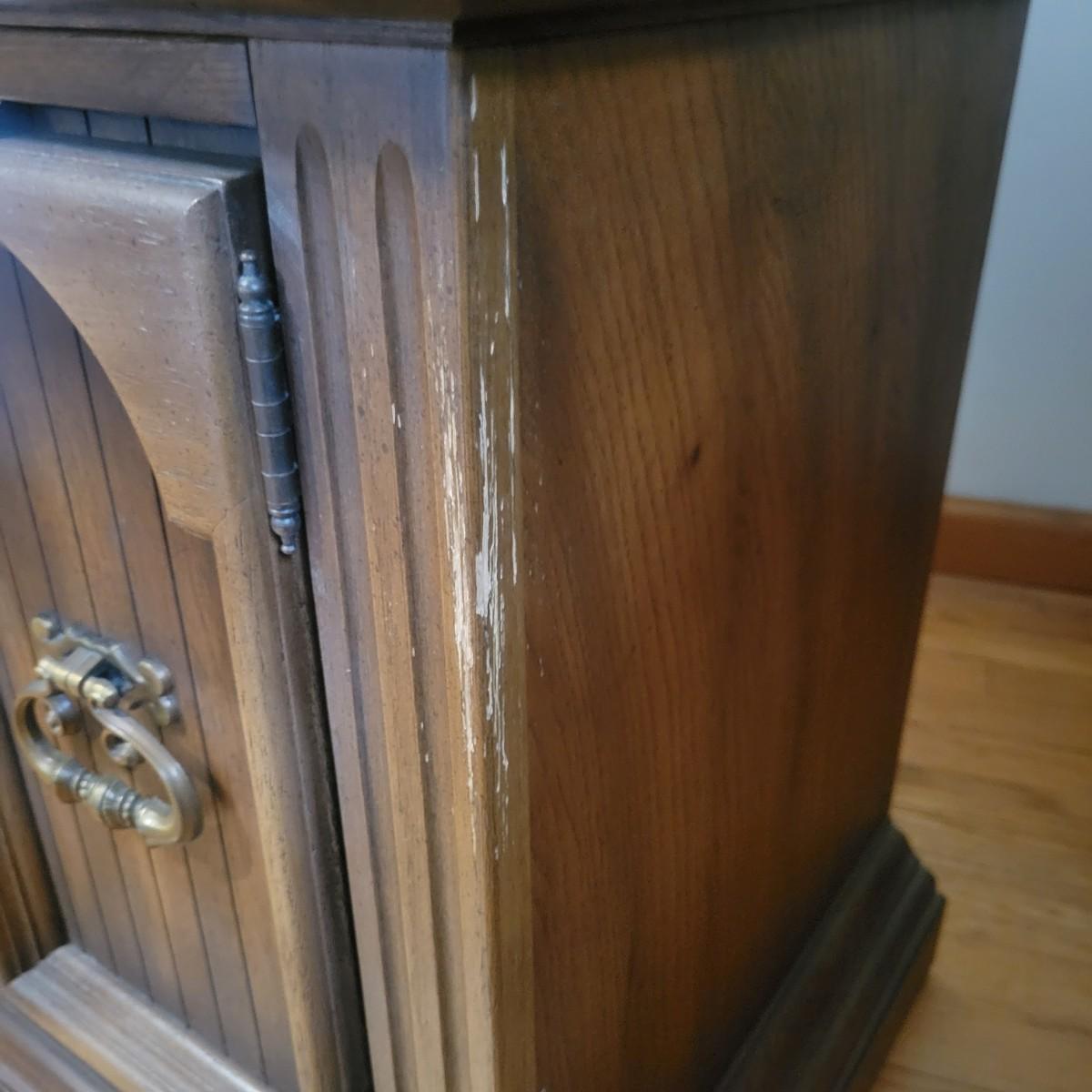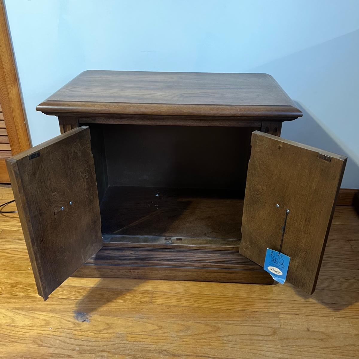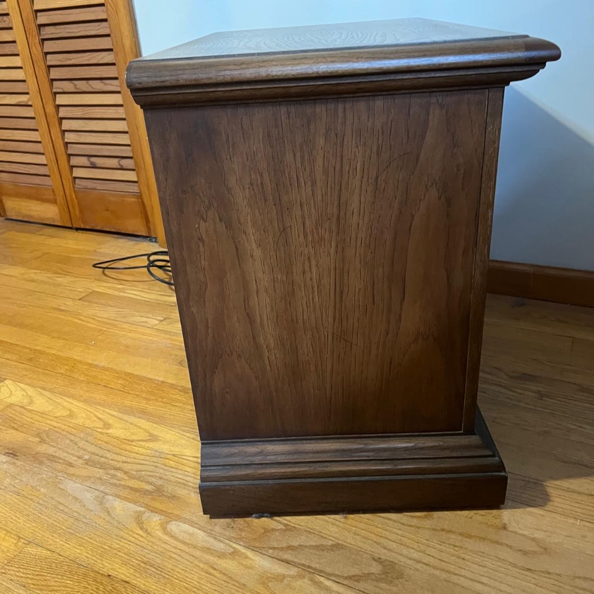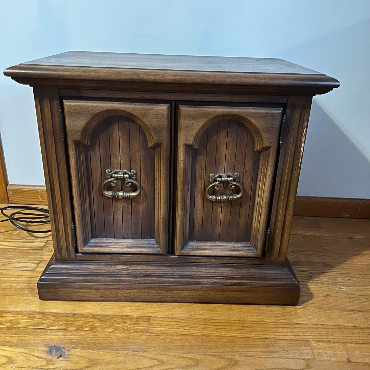 Broyhill bedside table cabinet. No Broyhill mark is found on the cabinet, but a detached Broyhill tag is found inside. Piece is brown stained and has what appears to be bronze hardware. The cabinet measures 28” x 17” x 25"H. There is a noticeable blemish photographed on the front right corner.