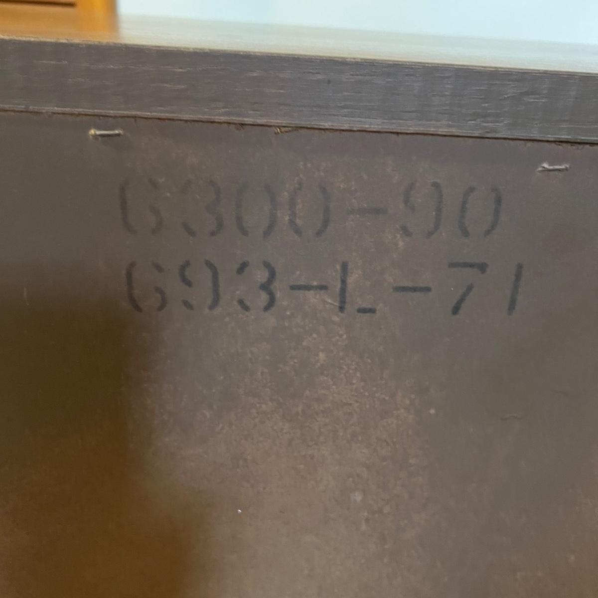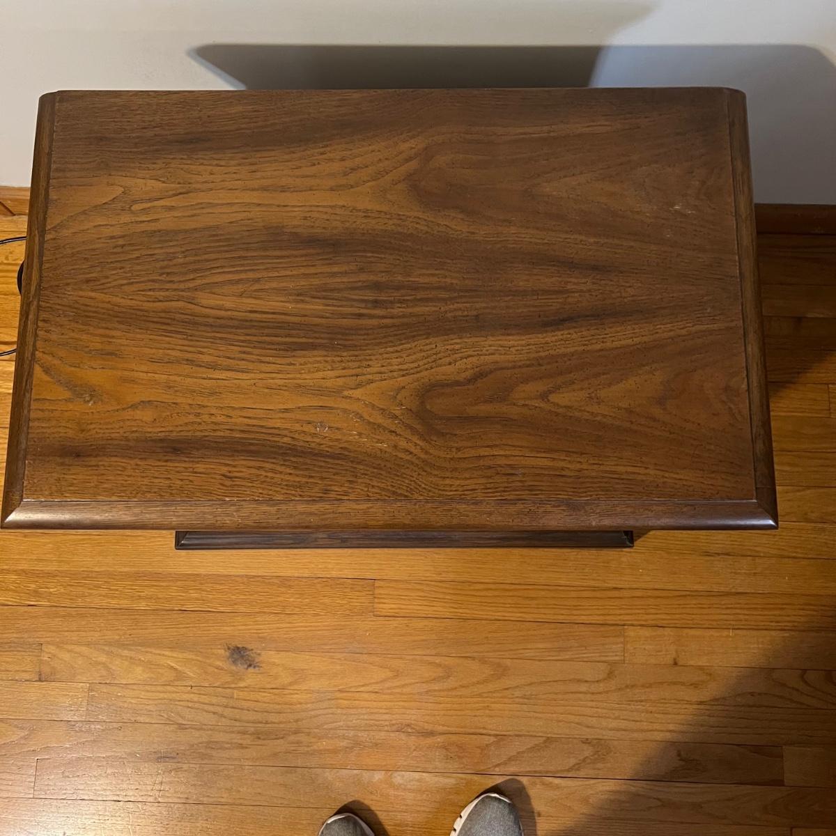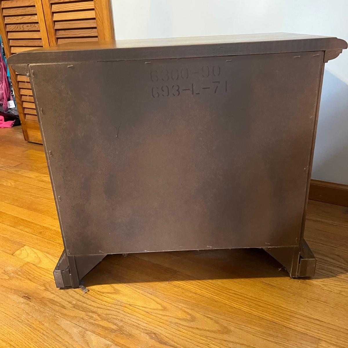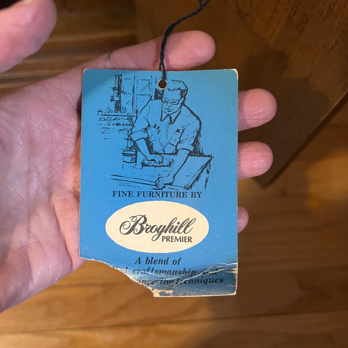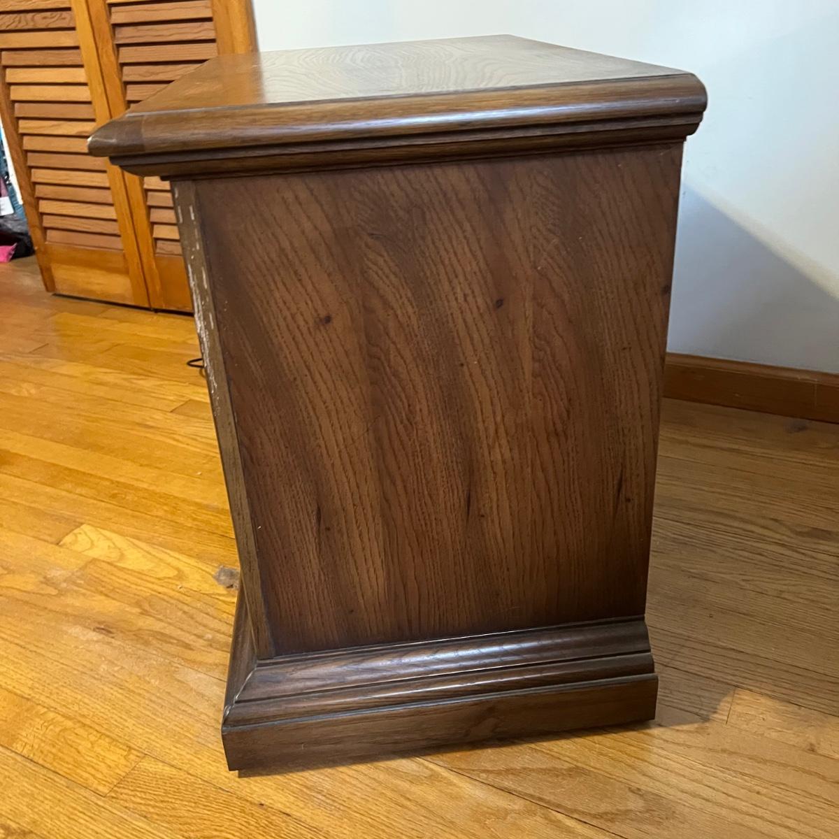 Broyhill bedside table cabinet. No Broyhill mark is found on the cabinet, but a detached Broyhill tag is found inside. Piece is brown stained and has what appears to be bronze hardware. The cabinet measures 28” x 17” x 25"H. There is a noticeable blemish photographed on the front right corner.