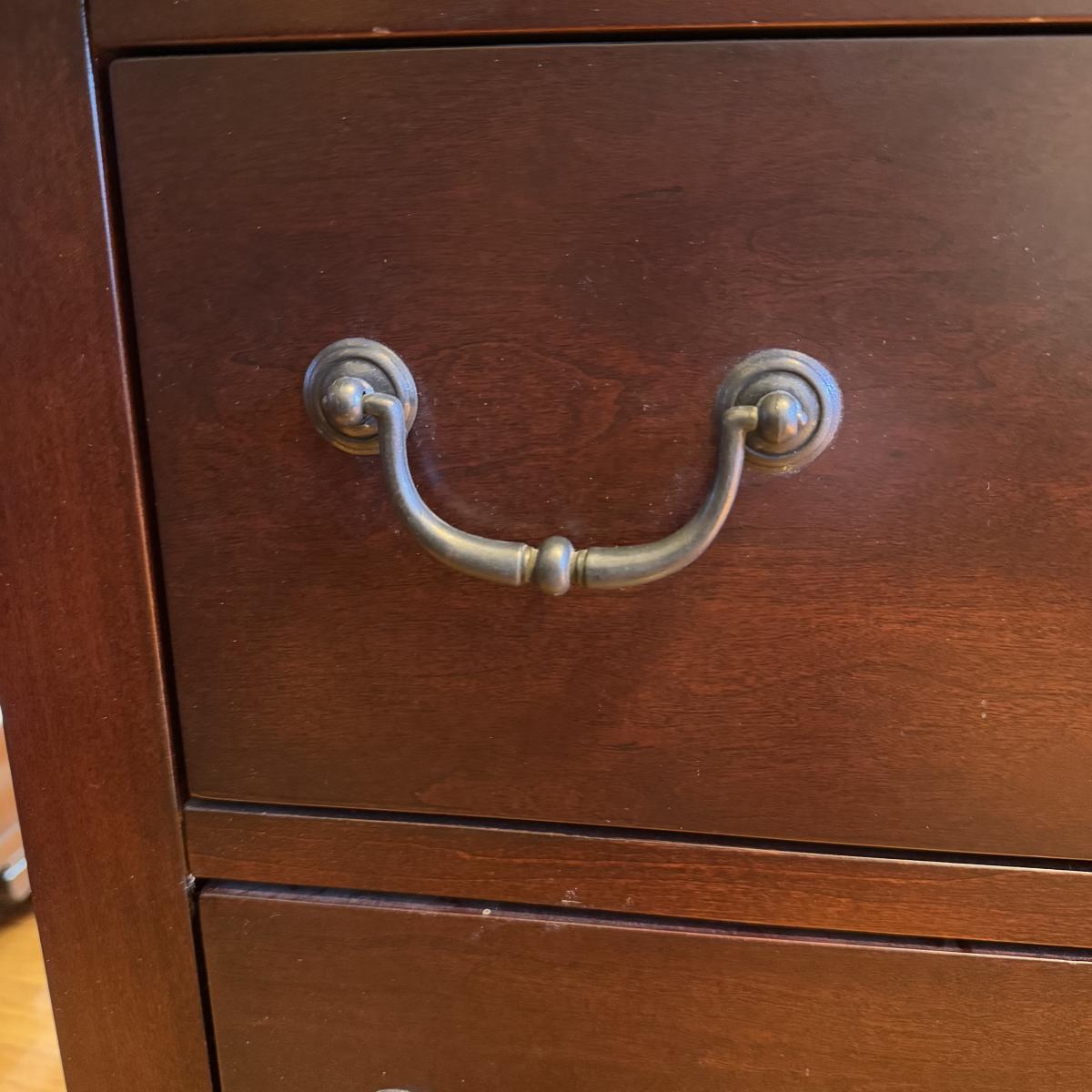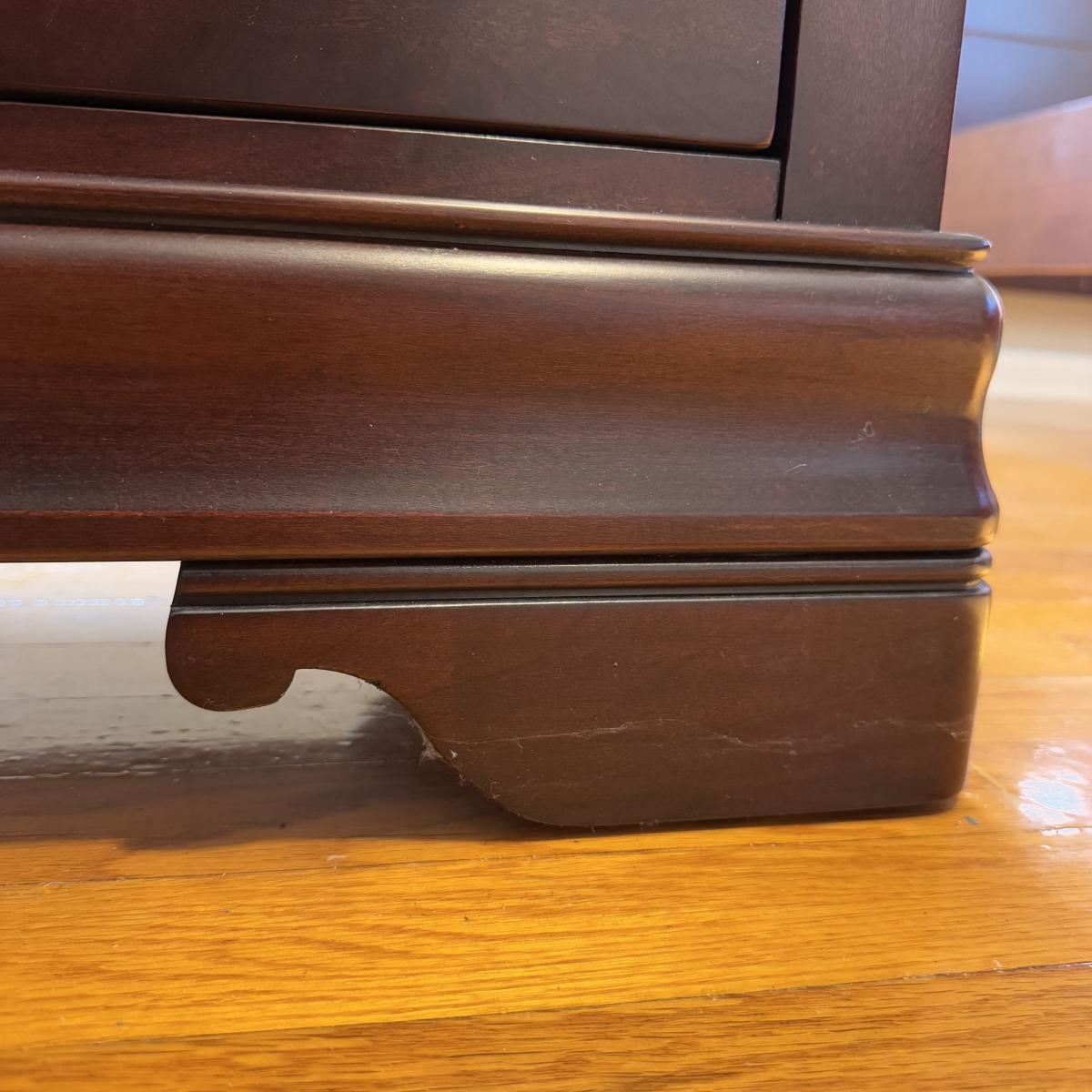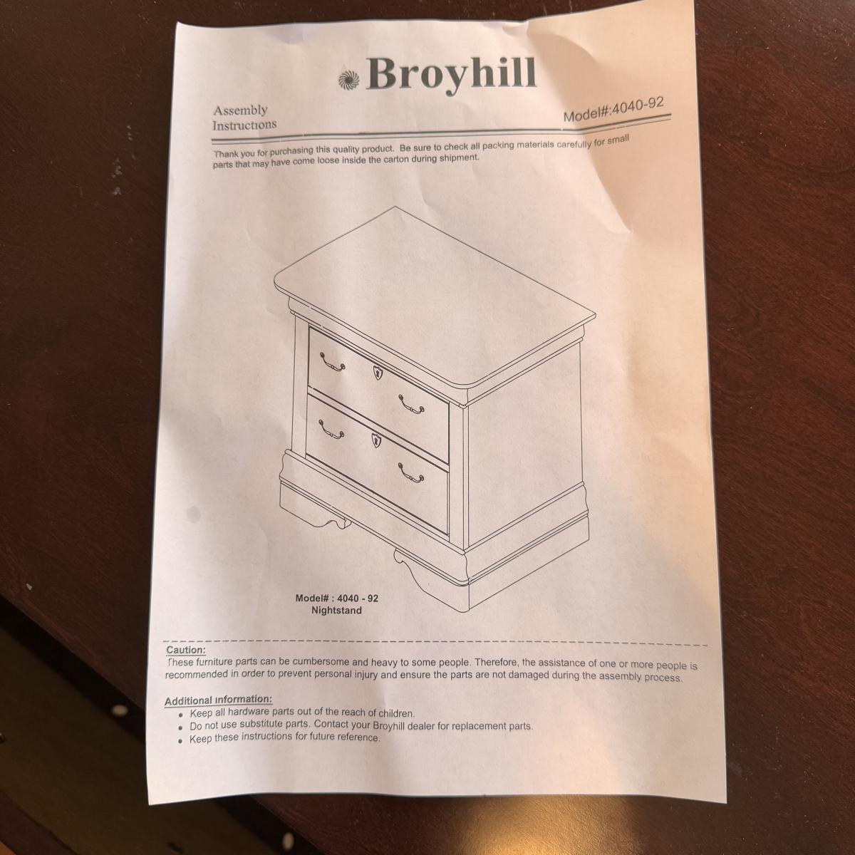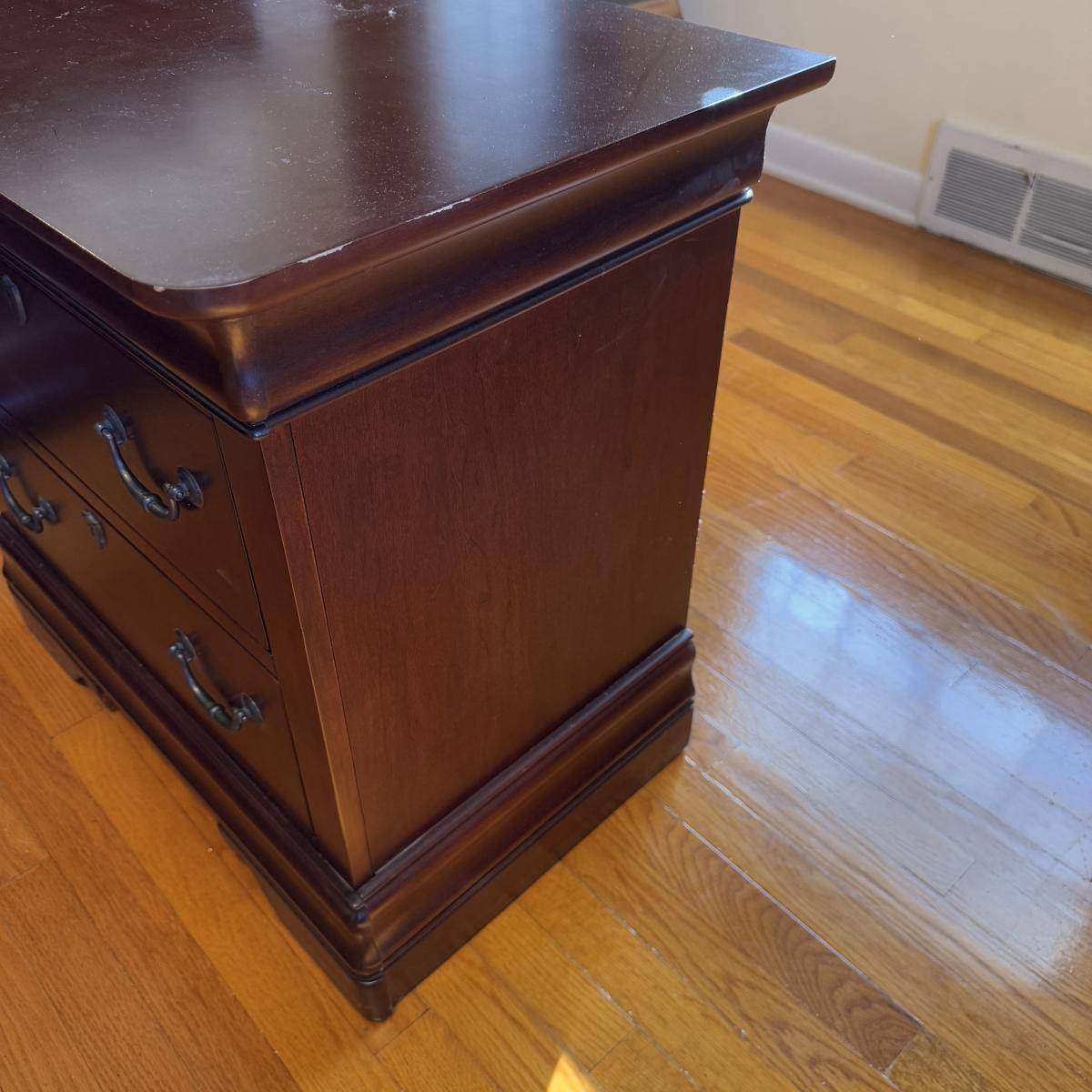 Lot includes one two-drawer wooden nightstand by Broyhill. It has a few signs of wear - see pictures included. The nightstand measures 28” x 17” x 26”H. There is a matching dresser, bed, and larger dresser in this sale - please see other lots for those. Local pickup only. Winning bidder must bring assistance to help move and load this item due to its weight and/or size.