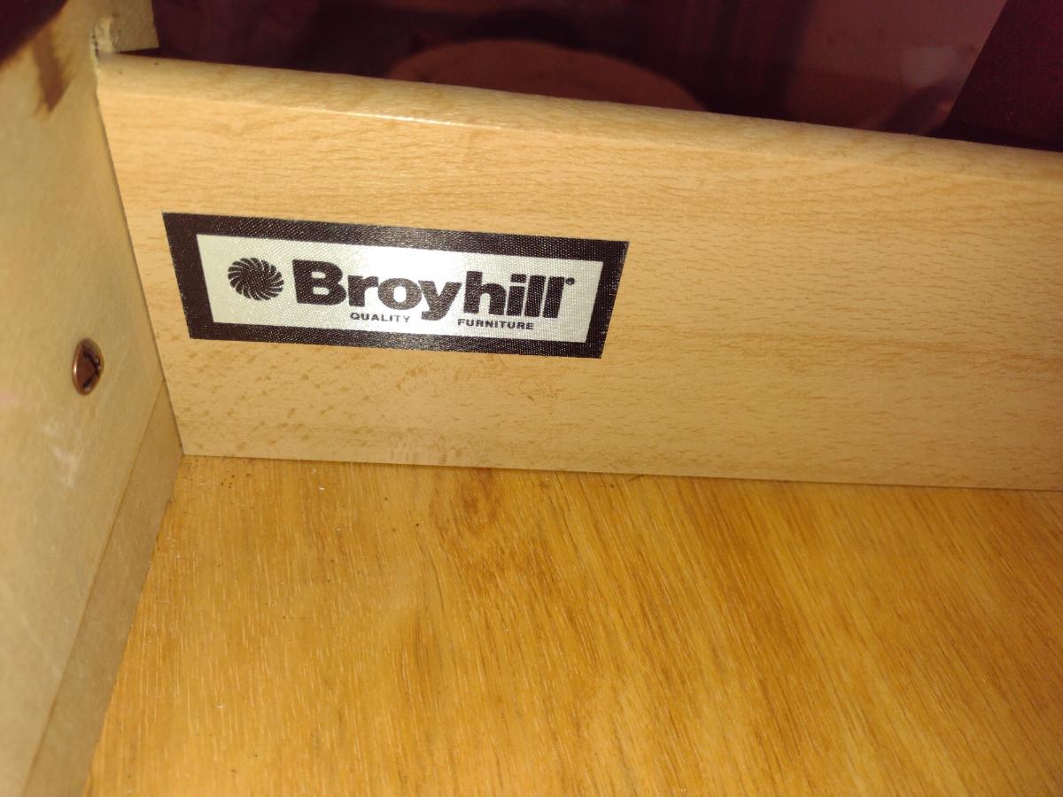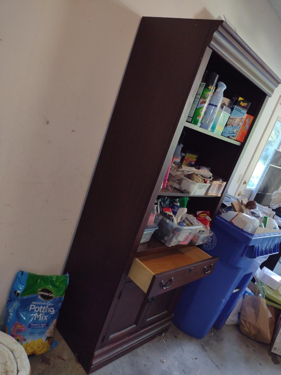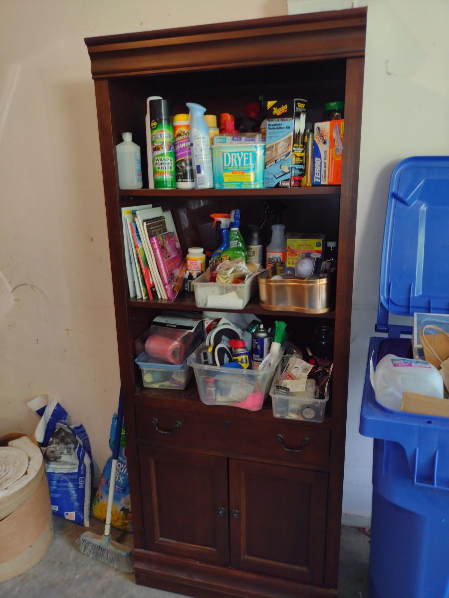 Broyhill Wood Finish Bookshelf/Storage Cabinet. Item was used in garage, so may have scratches/flaws/discoloration to finish.