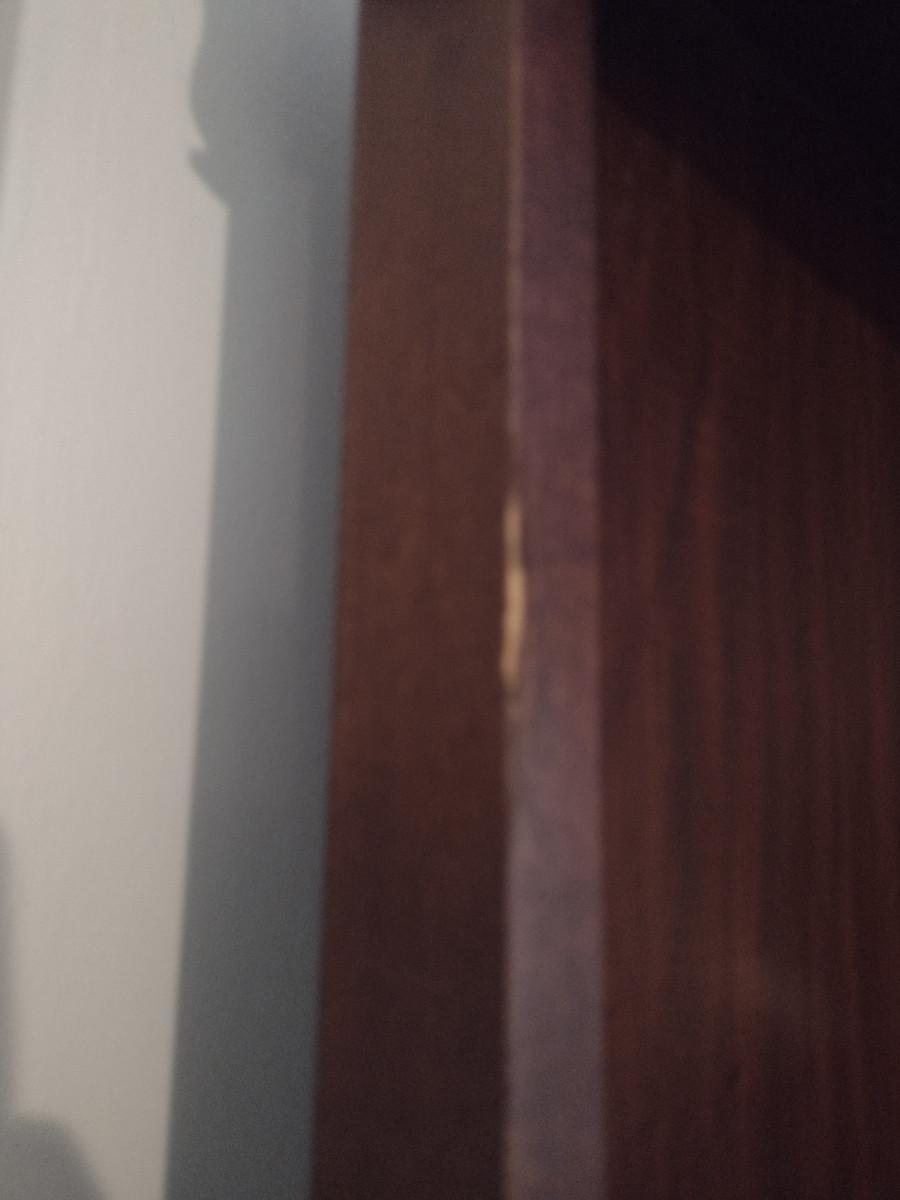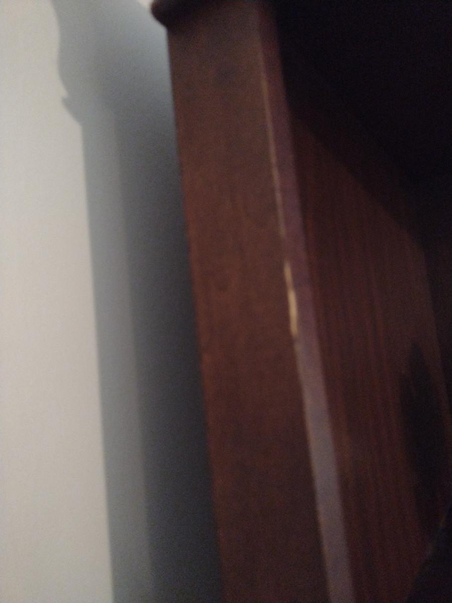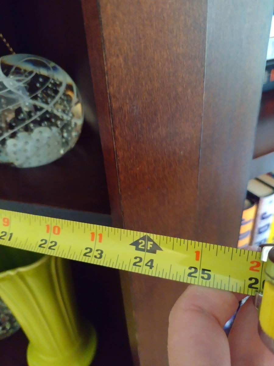 Broyhill Wood Finish Corner Bookshelf. Approx 25" wide, 12 1/2" deep, 76 1/4" tall. Item has small area of damage, please see all pictures. Drawer is false, and does not open. No contents.