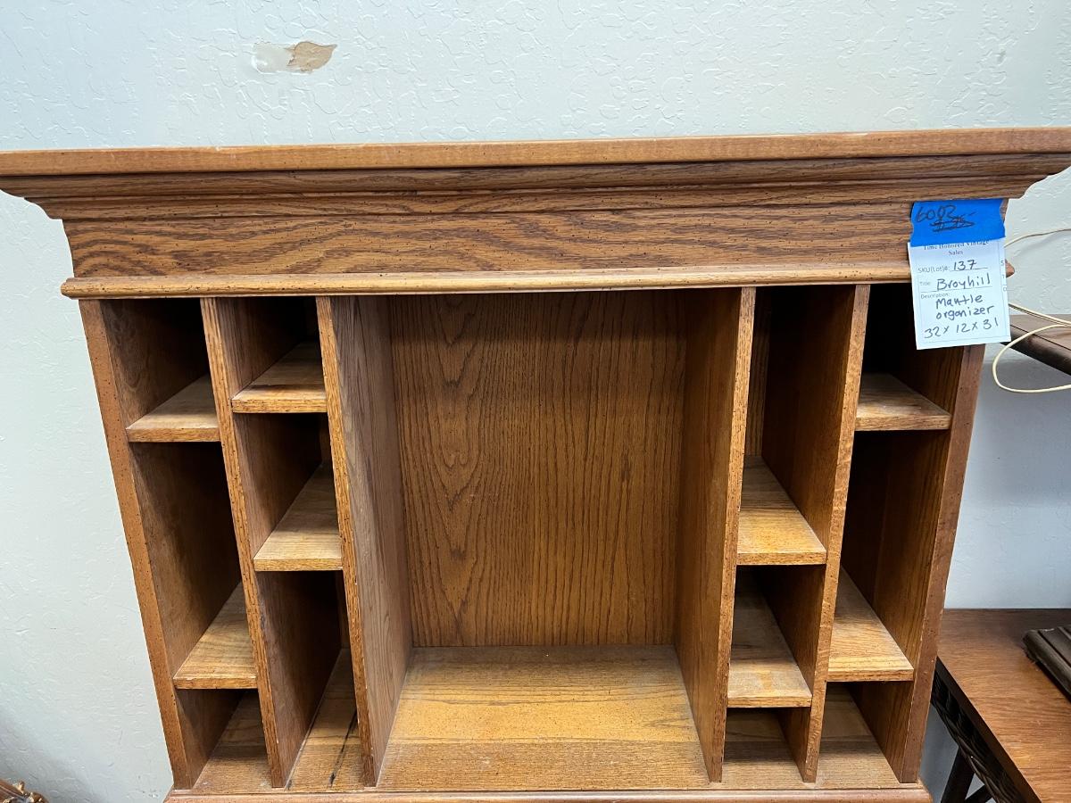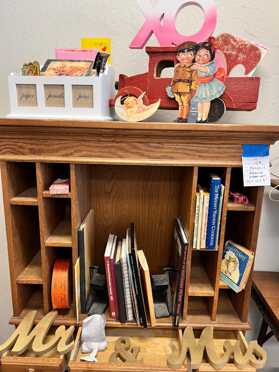 Broyhill wooden tabletop or mantle organizer and contents