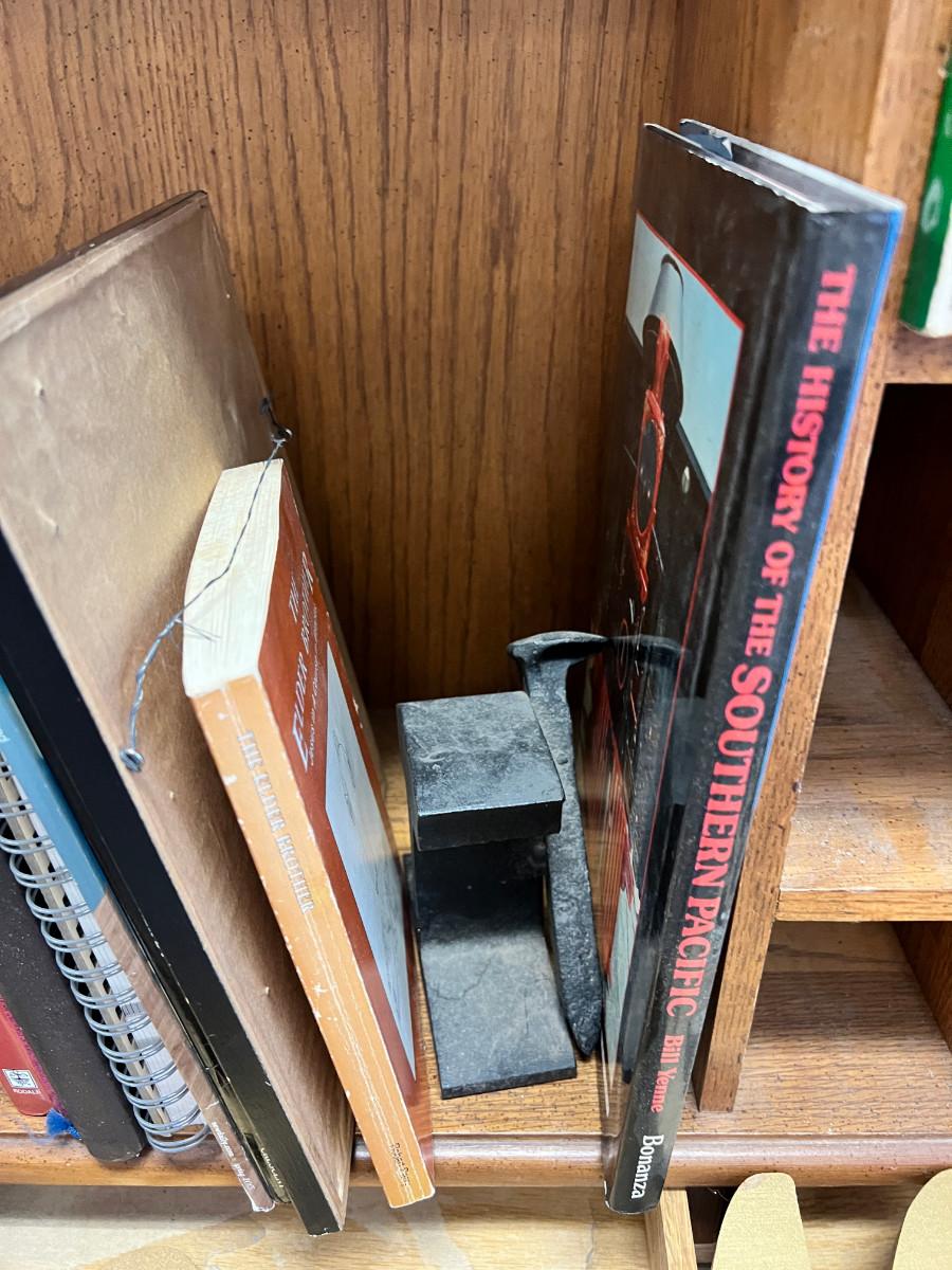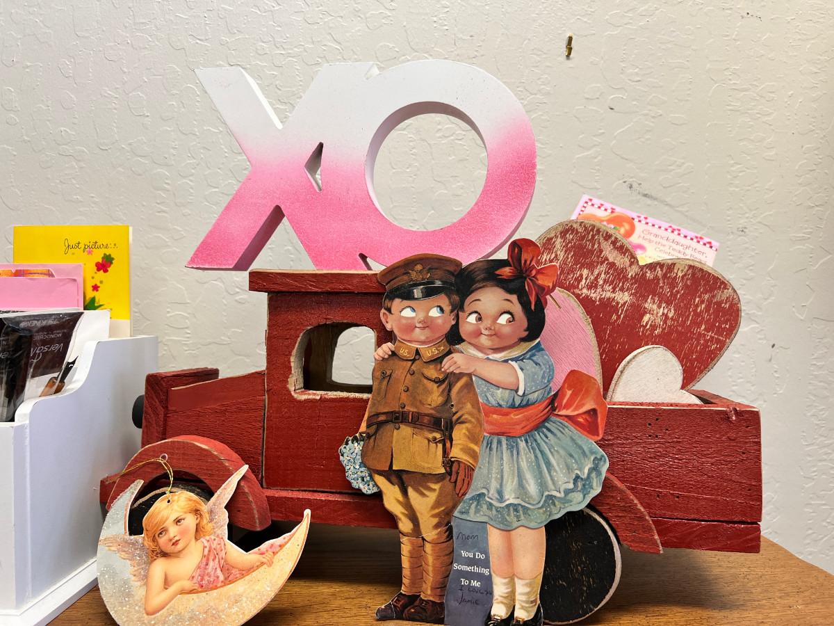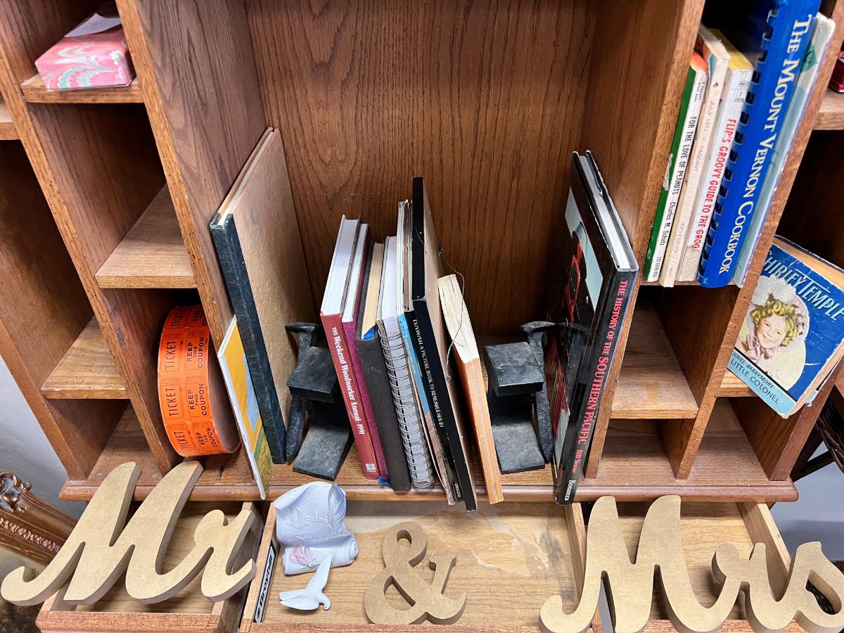 Wooden Love track with Cards, and Valentines, vintage books and journals, Mr and Mrs sign, Southern pacific railroad spike book ends spike marbled pencils and pens. No shipping