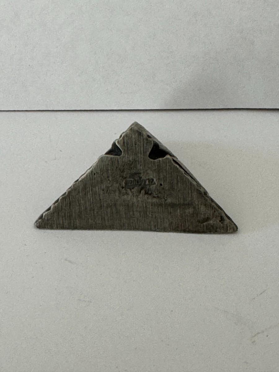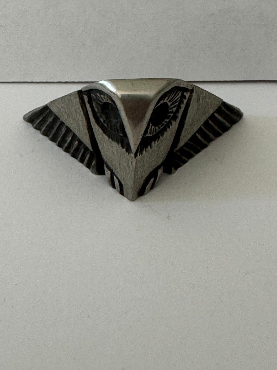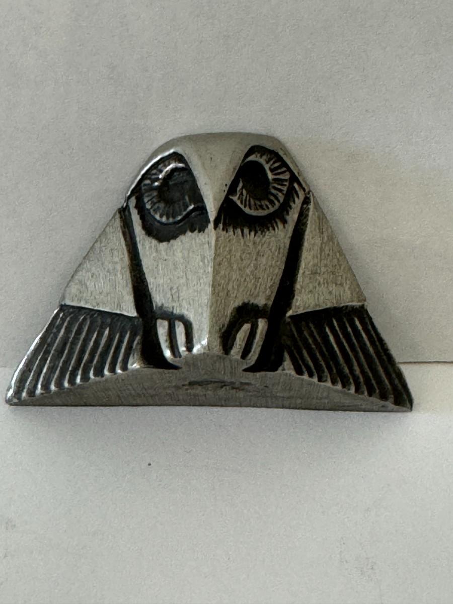 vintage pewter owl figurine or paperweight, characterized by its minimalist and somewhat abstract design.