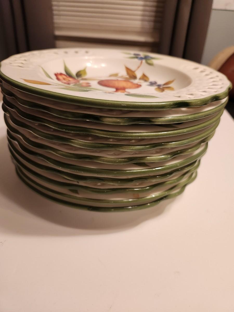 10 dinner plates and 2 serving bowls
