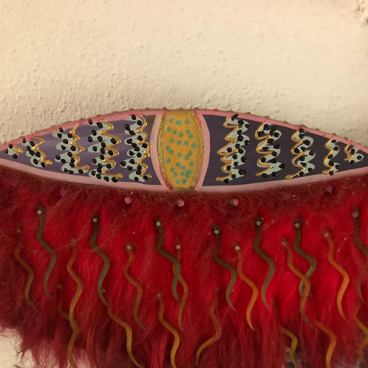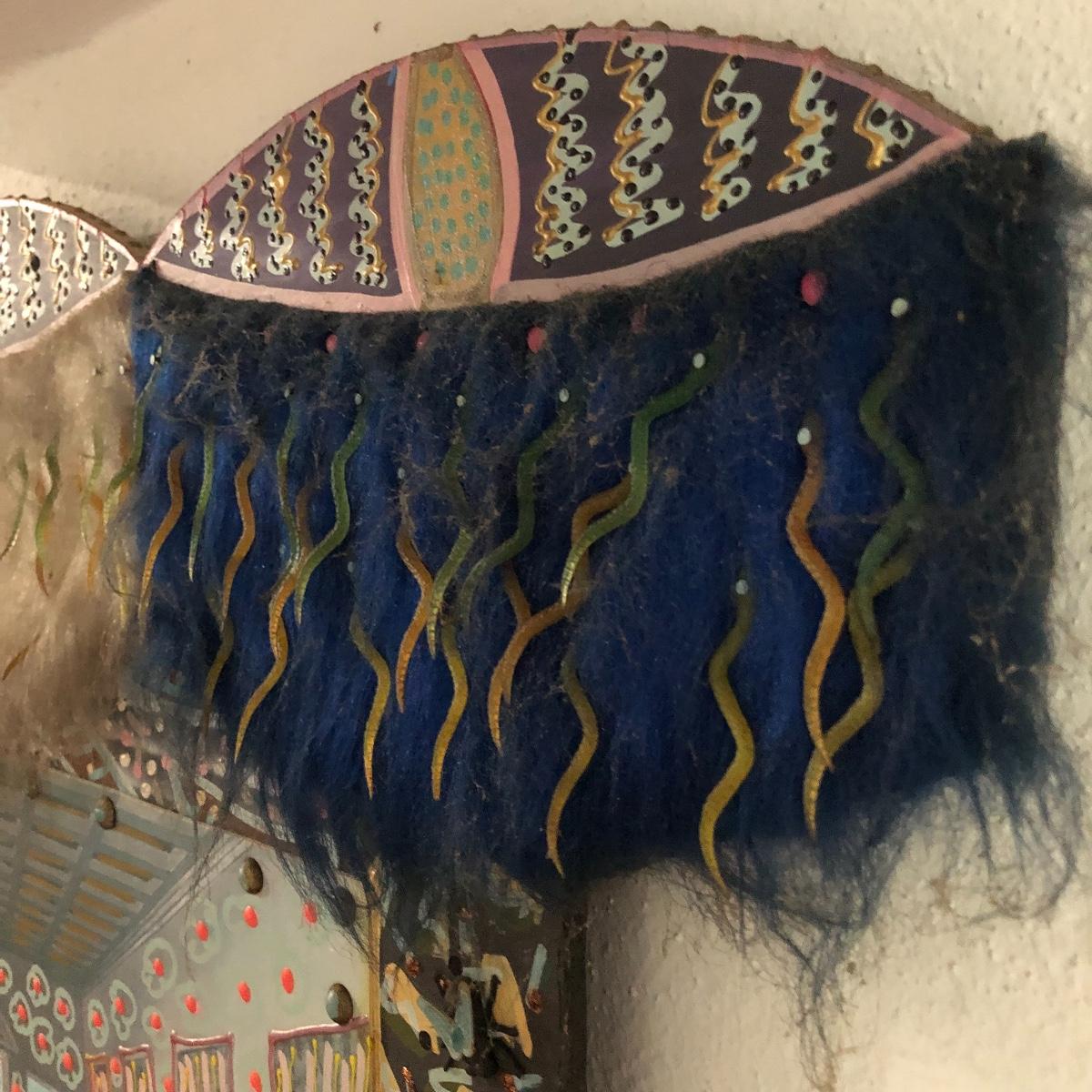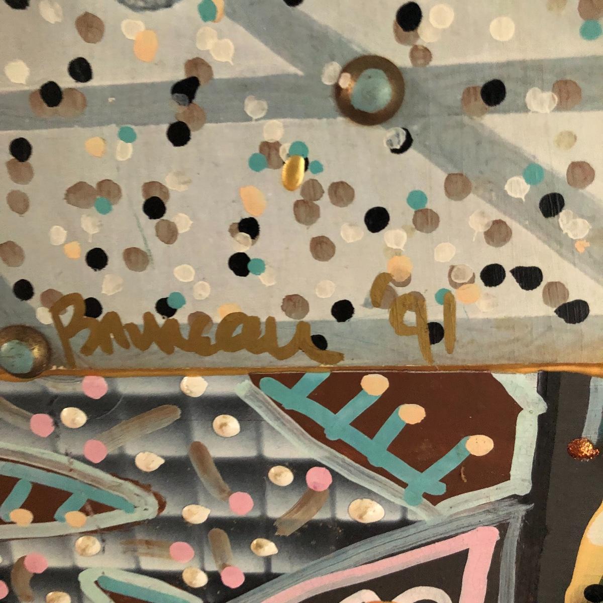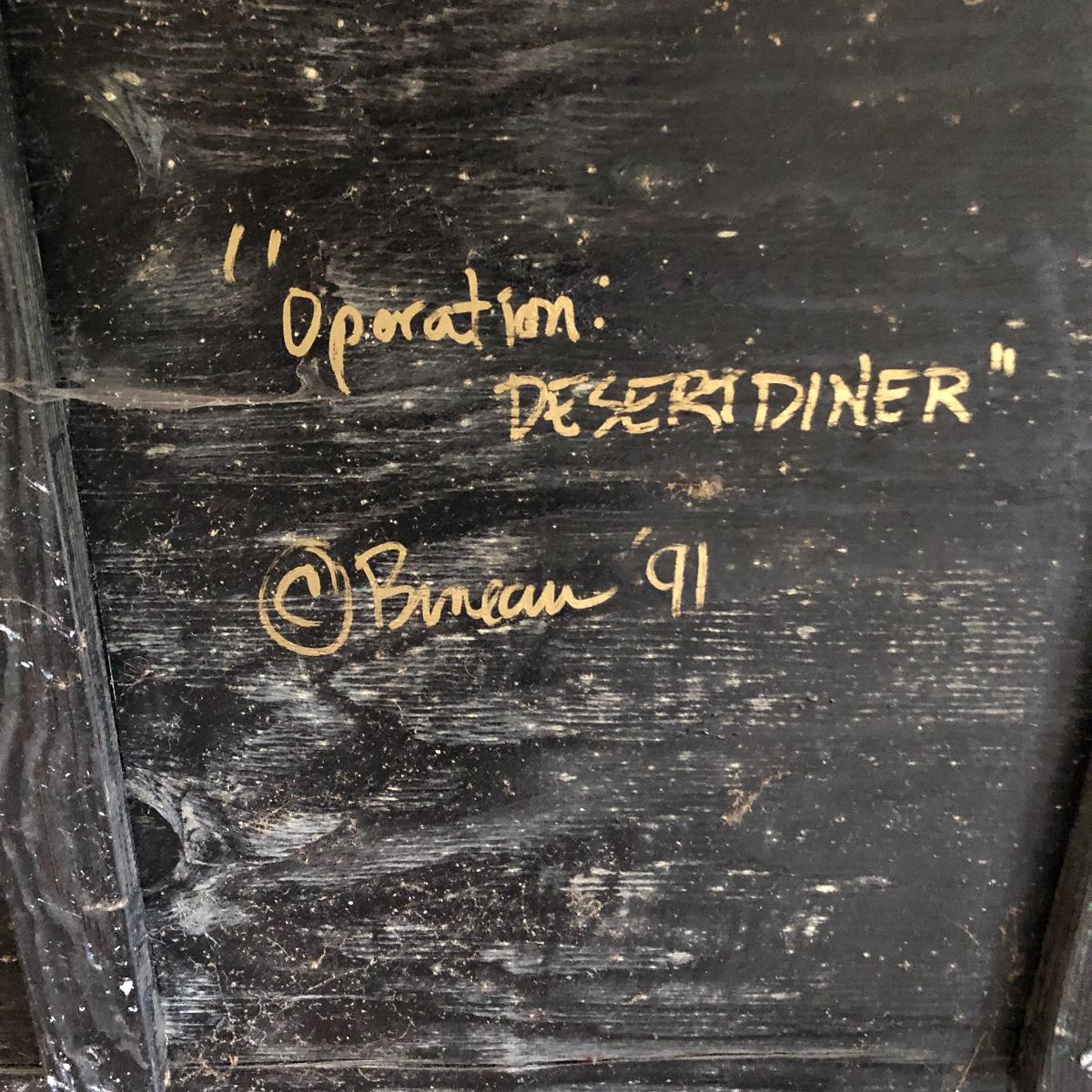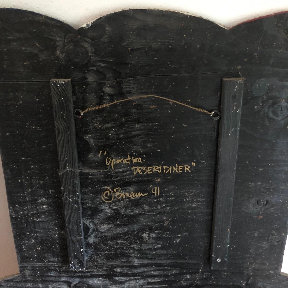 This large work of art by local artist Joe Bruneau is mixed media but predominantly wood and measures 34” x 26”. Titled “Operation Desert Diner” from 1991. There are two more lots of Bruneau art in 182 and 246.