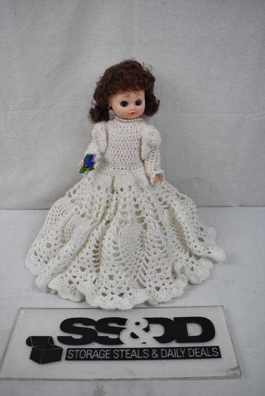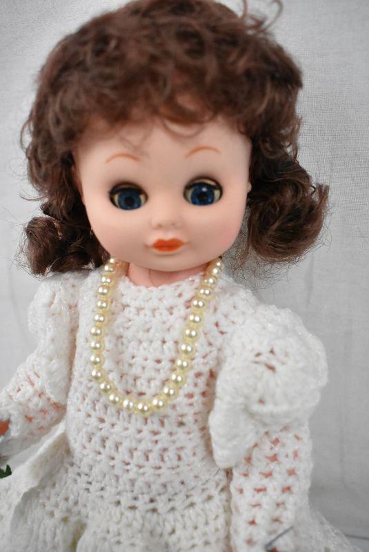 Brunette Doll with Blue Eyes & White Dress. Plastic. Includes Stand